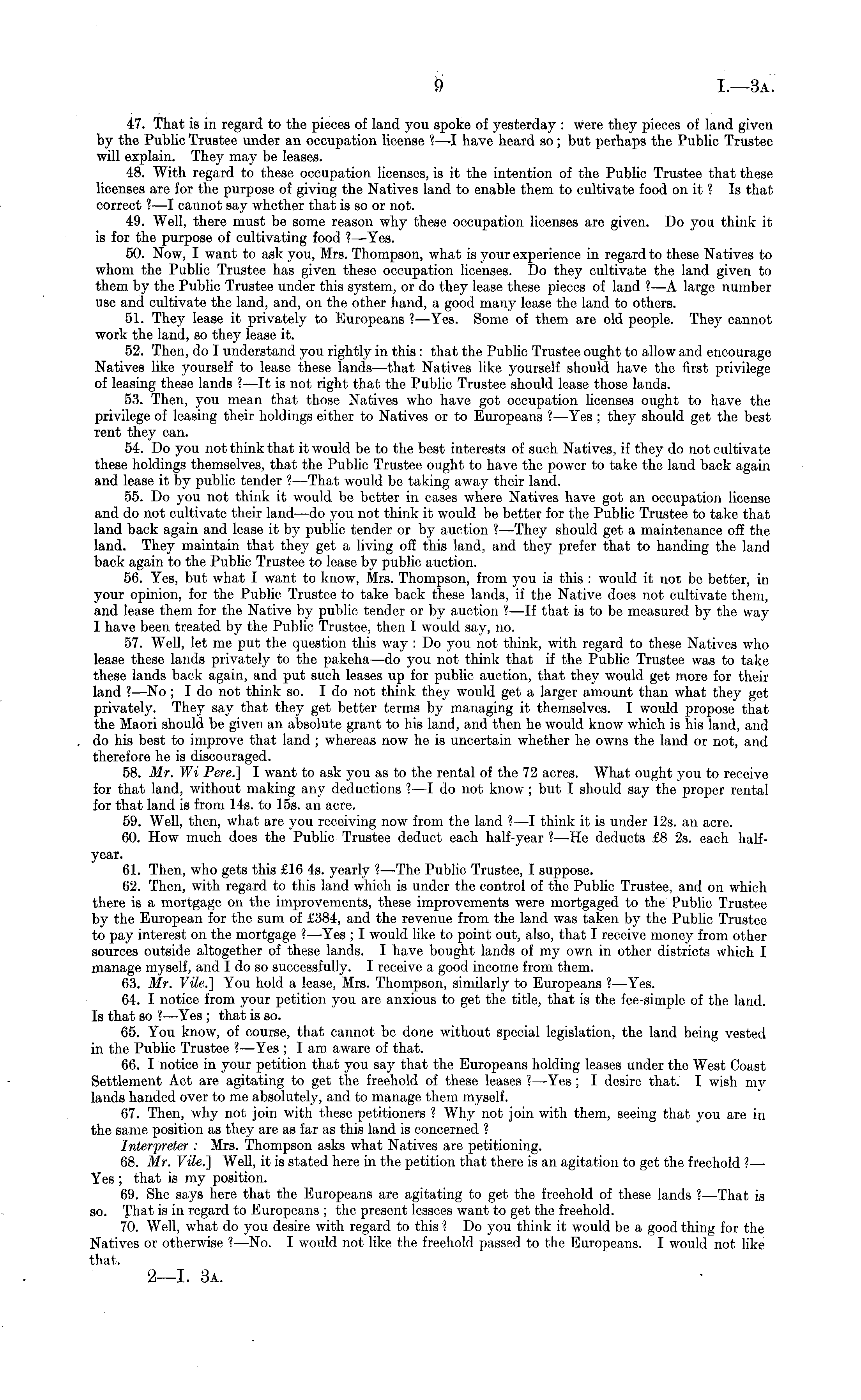 47. That is in regard to the pieces of land you spoke of yesterday : were they pieces of land given by the Public Trustee under an occupation license ? —I have heard so; but perhaps the Public Trustee will explain. They may be leases. 48. With regard to these occupation licenses, is it the intention of the Public Trustee that these licenses are for the purpose of giving the Natives land to enable them to cultivate food on it ? Is that correct ?—I cannot say whether that is so or not. 49. Well, there must be some reason why these occupation licenses are given. Do you think it is for the purpose of cultivating food "?—Yes. 50. Now, I want to ask you, Mrs. Thompson, what is your experience in regard to these Natives to whom the Public Trustee has given these occupation licenses. Do they cultivate the land given to them by the Public Trustee under this system, or do they lease these pieces of land ?—A large number use and cultivate the land, and, on the other hand, a good many lease the land to others. 51. They lease it privately to Europeans ?—Yes. Some of them are old people. They cannot work the land, so they lease it. 52. Then, do I understand you rightly in this : that the Public Trustee ought to allow and encourage Natives like yourself to lease these lands —that Natives like yourself should have the first privilege of leasing these lands ?—lt is not right that the Public Trustee should lease those lands. 53. Then, you mean that those Natives who have got occupation licenses ought to have the privilege of leasing their holdings either to Natives or to Europeans ? —Yes ; they should get the best rent they can. 54. Do you not think that it would be to the best interests of such Natives, if they do not cultivate these holdings themselves, that the Public Trustee ought to have the power to take the land back again and lease it by public tender ? —That would be taking away their land. 55. Do you not think it would be better in cases where Natives have got an occupation license and do not cultivate their land —do you not think it would be better for the Public Trustee to take that land back again and lease it by public tender or by auction ?—They should get a maintenance off the land. They maintain that they get a living off this land, and they prefer that to handing the land back again to the Public Trustee to lease by public auction. 56. Yes, but what I want to know, Mrs. Thompson, from you is this : would it not be better, in your opinion, for the Public Trustee to take back these lands, if the Native does not cultivate them, and lease them for the Native by public tender or by auction ? —lf that is to be measured by the way I have been treated by the Public Trustee, then I would say, no. 57. Well, let me put the question this way : Do you not think, with regard to these Natives who lease these lands privately to the pakeha—do you not think that if the Public Trustee was to tako these lands back again, and put such leases up for public auction, that they would get more for their land ? —No ; Ido not think so. Ido not think they would get a larger amount than what they get privately. They say that they get better terms by managing it themselves. I would propose that the Maori should be given an absolute grant to his land, and then he would know which is his land, and do his best to improve that land ; whereas now he is uncertain whether he owns the land or not, and therefore he is disco iiraged. 58. Mr. Wi Pere.] I want to ask you as to the rental of the 72 acres. What ought you to receive for that land, without making any deductions I—l1 —I do not know ; but I should say the proper rental for that land is from 14s. to 15s. an acre. 59. Well, then, what are you receiving now from the land ? —I think it is under 12s. an acre. 60. How much does the Public Trustee deduct each half-year ?—-He deducts £8 2s. each halfyear. 61. Then, who gets this £16 4s. yearly ? —The Public Trustee, I suppose. 62. Then, with regard to this land which is under the control of the Public Trustee, and on which there is a mortgage on the improvements, these improvements were mortgaged to the Public Trustee by the European for the sum of £384, and the revenue from the land was taken by the Public Trustee to pay interest on the mortgage ?—Yes ; I would like to point out, also, that I receive money from other sources outside altogether of these lands. I have bought lands of my own in other districts which I manage myself, and Ido so successfully. I receive a good income from them. 63. Mr. Vile.] You hold a lease, Mrs. Thompson, similarly to Europeans ? —Yes. 64. I notice from your petition you are anxious to get the title, that is the fee-simple of the land. Is that so ?—Yes ; that is so. 65. You know, of course, that cannot be done without special legislation, the land being vested in the Public Trustee ? —Yes ; I am aware of that. 66. I notice in your petition that you say that the Europeans holding leases under the West Coast Settlement Act are agitating to get the freehold of these leases ? —Yes ; I desire that. I wish my lands handed over to me absolutely, and to manage them myself. 67. Then, why not join with these petitioners ? Why not join with them, seeing that you are in the same position as they are as far as this land is concerned ? Interpreter : Mrs. Thompson asks what Natives are petitioning. 68. Mr. Vile.] Well, it is stated here in the petition that there is an agitation to get the freehold ?— Yes ; that is my position. 69. She says here that the Europeans are agitating to get the freehold of these lands ?—That is so. That is in regard to Europeans ; the present lessees want to get the freehold. 70. Well, what do you desire with regard to this ? Do you think it would be a good thing for the Natives or otherwise ?—No. I would not like the freehold passed to the Europeans. I would not like that. 2—l. 3a.