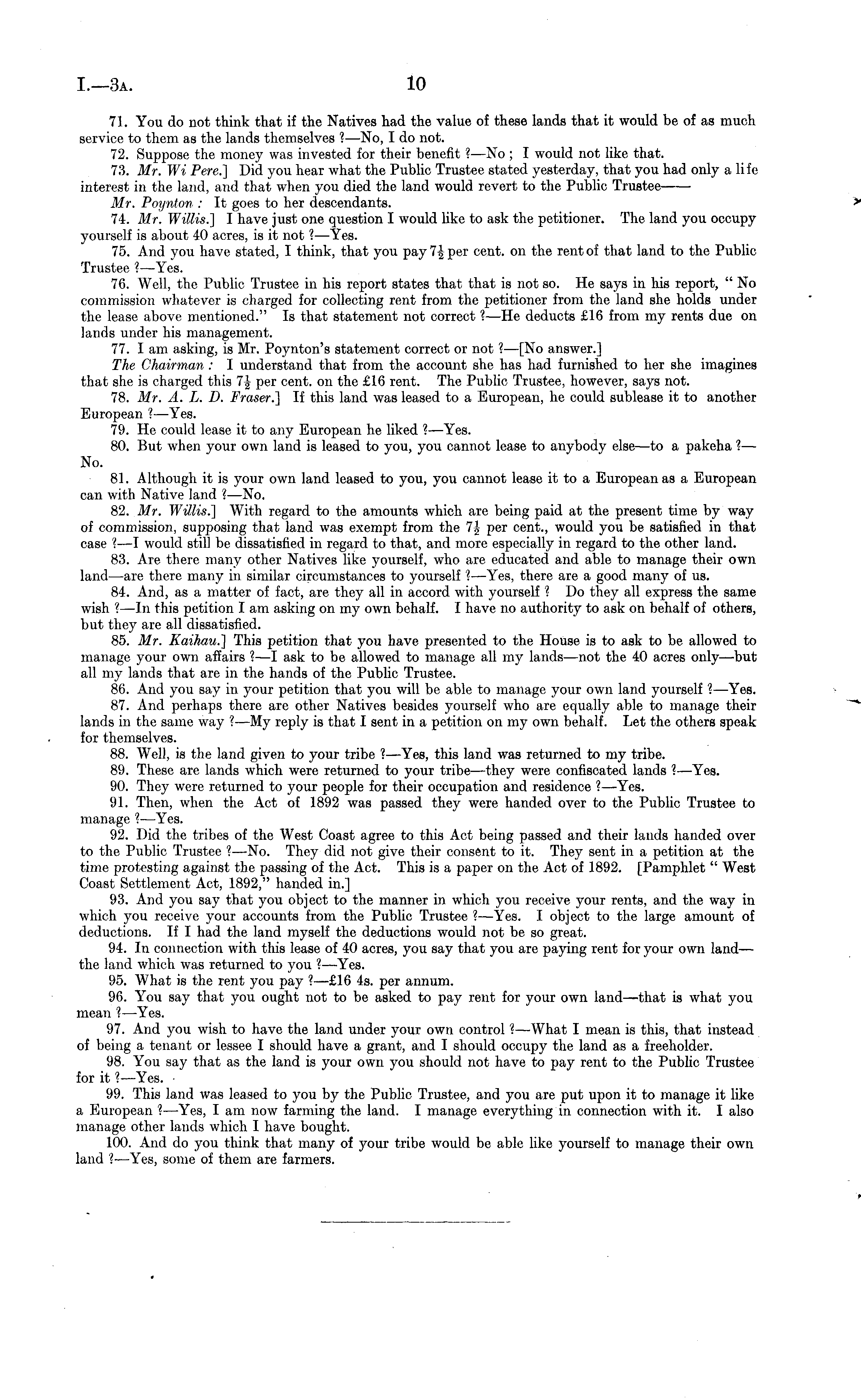 71. You do not think that if the Natives had the value of these lands that it would be of as much service to them as the lands themselves ? —No, I do not. 72. Suppose the money was invested for their benefit ?—No ; I would not like that. 73. Mr. Wi Pere.] Did you hear what the Public Trustee stated yesterday, that you had only a life interest in the land, and that when you died the land would revert to the Public Trustee • Mr. Poynton : It goes to her descendants. 74. Mr. Willis.] I have just one question I would like to ask the petitioner. The land you occupy yourself is about 40 acres, is it not ? —Yes. 75. And you have stated, I think, that you pay 7_ per cent, on the rent of that land to the Public Trustee I—Yes.1 —Yes. 76. Well, the Public Trustee in his report states that that is not so. He says in his report, "No commission whatever is charged for collecting rent from the petitioner from the land she holds under the lease above mentioned." Is that statement not correct *? —He deducts £16 from my rents due on lands under his management. 77. I am asking, is Mr. Poynton's statement correct or not ?—[No answer.] The Chairman : I understand that from the account she has had furnished to her she imagines that she is charged this 7_ per cent, on the £16 rent. The Public Trustee, however, says not. 78. Mr. A. L. D. Fraser.] If this land was leased to a European, he could sublease it to another European ?—Yes. 79. He could lease it to any European he liked ?—Yes. 80. But when your own land is leased to you, you cannot lease to anybody else —to a pakeha ? — No. 81. Although it is your own land leased to you, you cannot lease it to a European as a European can with Native land ? —No. 82. Mr. Willis.] With regard to the amounts which are being paid at the present time by way of commission, supposing that land was exempt from the 7_ per cent., would you be satisfied in that case ? —I would still be dissatisfied in regard to that, and more especially in regard to the other land. 83. Are there many other Natives like yourself, who are educated and able to manage their own land —are there many in similar circumstances to yourself ? —Yes, there are a good many of us. 84. And, as a matter of fact, are they all in accord with yourself ? Do they all express the same wish ? —ln this petition lam asking on my own behalf. I have no authority to ask on behalf of others, but they are all dissatisfied. 85. Mr. Kaihau.] This petition that you have presented to the House is to ask to be allowed to manage your own affairs ? —I ask to be allowed to manage all my lands —not the 40 acres only —but all my lands that are in the hands of the Public Trustee. 86. And you say in your petition that you will be able to manage your own land yourself ?—Yes. 87. And perhaps there are other Natives besides yourself who are equally able to manage their lands in the same way ?—My reply is that I sent in a petition on my own behalf. Let the others speak for themselves. 88. Well, is the land given to your tribe ? —Yes, this land was returned to my tribe. 89. These are lands which were returned to your tribe—they were confiscated lands ?—Yes. 90. They were returned to your people for their occupation and residence ?—Yes. 91. Then, when the Act of 1892 was passed they were handed over to the Public Trustee to manage ?—Yes. 92. Did the tribes of the West Coast agree to this Act being passed and their lands handed over to the Public Trustee *? —No. They did not give their consent to it. They sent in a petition at the time protesting against the passing of the Act. This is a paper on the Act of 1892. [Pamphlet " West Coast Settlement Act, 1892," handed in.] 93. And you say that you object to the manner in which you receive your rents, and the way in which you receive your accounts from the Public Trustee ?—Yes. I object to the large amount of deductions. If I had the land myself the deductions would not be so great. 94. In connection with this lease of 40 acres, you say that you are paying rent for your own land— the land which was returned to you ? —Yes. 95. What is the rent you pay ? —£l6 4s. per annum. 96. You say that you ought not to be asked to pay rent for your own land—that is what you mean ? —Yes. 97. And you wish to have the land under your own control ?—What I mean is this, that instead of being a tenant or lessee I should have a grant, and I should occupy the land as a freeholder. 98. You say that as the land is your own you should not have to pay rent to the Public Trustee for it ? —Yes. 99. This land was leased to you by the Public Trustee, and you are put upon it to manage it like a European ? —Yes, lam now farming the land. I manage everything in connection with it. I also manage other lands which I have bought. 100. And do you think that many of your tribe would be able like yourself to manage their own land ? —Yes, some of them are farmers.