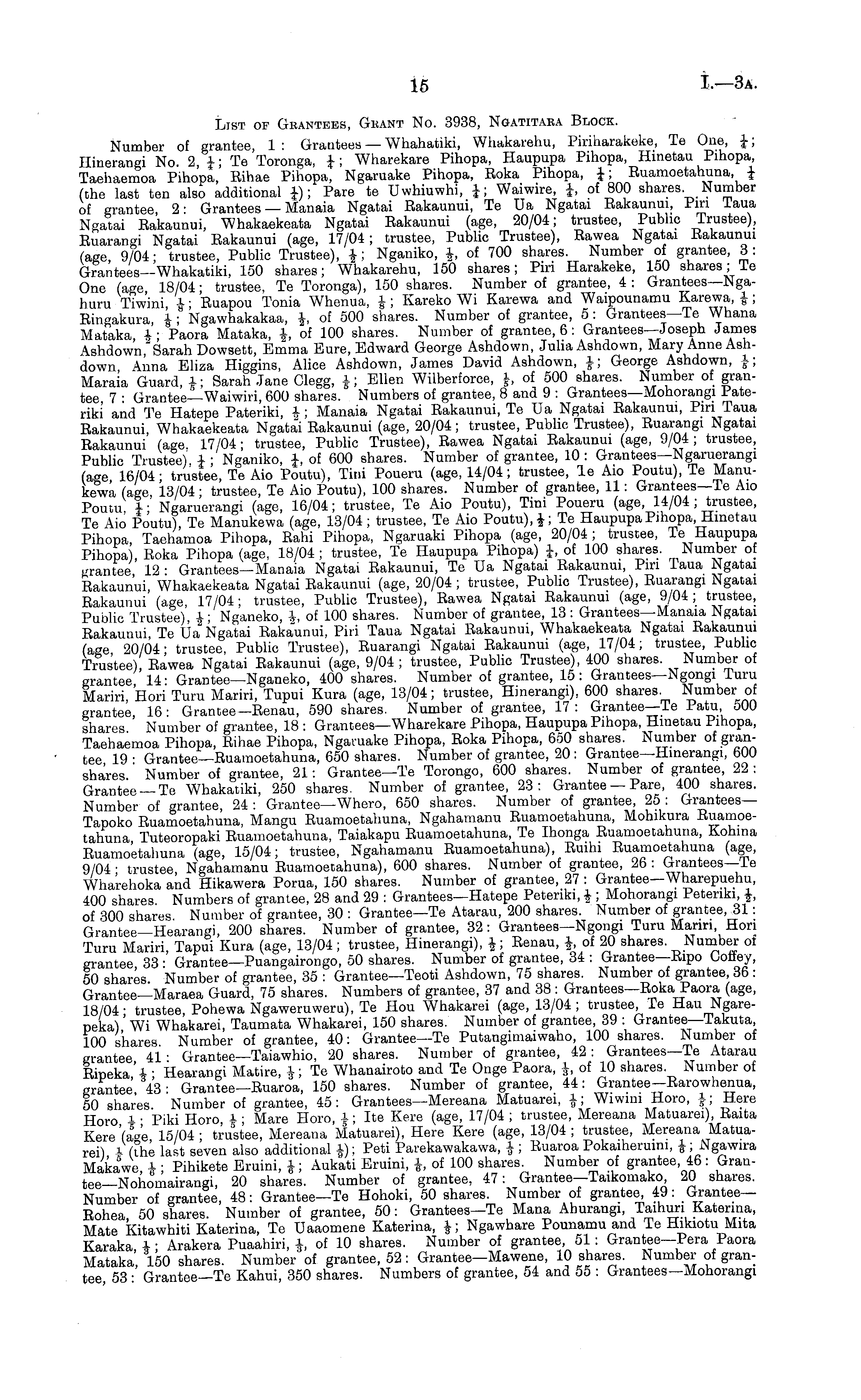 List of Grantees, Grant No. 3938, Ngatitara Block. Number of grantee, 1 : Grantees — Whahatiki, Whakarehu, Piriliarakeke, Te One, _■ ; Hinerangi No. 2, \ ; Te Toronga, \ ; Wharekare Pihopa, Haupupa Pihopa, Hinetau Pihopa, Taehaemoa Pihopa, Rihae Pihopa, Ngaruake Pihopa, Roka Pihopa, \; Ruamoetahuna, \ (the last ten also additional I); Pare te Uwhiuwhi, \; Waiwire, \, of 800 shares Number of grantee, 2: Grantees — Manaia Ngatai Rakaunui, Te Ua Ngatai Rakaunm, Pin Taua Ngatai Rakaunui, Whakaekeata Ngatai Rakaunui (age, 20/04; trustee, Public Trustee), Ruarangi Ngatai Rakaunui (age, 17/04; trustee, Public Trustee), Rawea Ngatai Rakaunui (age, 9/04; trustee, Public Trustee), \; Nganiko, \, of 700 shares. Number of grantee, 8: Grantees—Whakatiki, 150 shares; Whakarehu, 150 shares; Piri Harakeke, 150 shares; Te One (age, 18/04; trustee, Te Toronga), 150 shares. Number of grantee, 4: Grantees—Ngahuru Tiwini \ ; Ruapou Tonia Whenua, \ ; Kareko Wi Karewa and Waipounamu Karewa, \ ; Ringakura, 4 ; Ngawhakakaa, _, of 500 shares. Number of grantee, 5: Grantees—Te Whana Mataka, *; Paora Mataka, i, of 100 shares. Number of grantee, 6: Grantees—Joseph James Ashdown,"Sarah Dowsett, Emma Eure, Edward George Ashdown, Julia Ashdown, Mary Anne Ashdown Anna Eliza Higgins, Alice Ashdown, James David Ashdown, -J; George Ashdown, _; Maraia Guard, 4; Sarah Jane Clegg, J; Ellen Wilberforce, 4, of 500 shares. Number of grantee 7 ' Grantee—Waiwiri, 600 shares. Numbers of grantee, 8 and 9 : Grantees—Mohorangi Pateriki and Te Hatepe Pateriki, \ ; Manaia Ngatai Rakaunui, Te Ua Ngatai Rakaunui, Pin Taua Rakaunui, Whakaekeata Ngatai Rakaunui (age, 20/04; trustee, Public Trustee), Ruarangi Ngatai Rakaunui (age. 17/04; trustee, Public Trustee), Rawea Ngatai Rakaunui (age, 9/04; trustee, Public Trustee) 4 ; Nganiko, \, of 600 shares. Number of grantee, 10 : Grantees—Ngaruerangi (age 16/04; trustee, Te Aio Poutu), Tini Poueru (age, 14/04; trustee, le Aio Poutu), Te ManuLewa (age, 13/04 ; trustee, Te Aio Poutu), 100 shares. Number of grantee, 11: Grantees—Te Aio Poutu 4- Ngaruerangi (age, 16/04; trustee, Te Aio Poutu), Tini Poueru (age, 14/04; trustee, Te Aio Poutu), Te Manukewa (age, 13/04; trustee, Te Aio Poutu), _; Te Haupupa Pihopa, Hinetau Pihopa, Taehamoa Pihopa, Rahi Pihopa, Ngaruaki Pihopa (age, 20/04 ; trustee, Te Haupupa Pihopa), Roka Pihopa (age, 18/04; trustee, Te Haupupa Pihopa) J, of 100 shares. Number of grantee, 12 : Grantees—Manaia Ngatai Rakaunui, Te Ua Ngatai Rakaunui, Pm lava Ngatai Rakaunui, Whakaekeata Ngatai Rakaunui (age, 20/04 ; trustee, Public Trustee), Ruarangi Ngatai Rakaunui (age, 17/04; trustee, Public Trustee), Rawea Ngatai Rakaunui (age, 9/04; trustee, Public Trustee), £; Nganeko, 4, of 100 shares. Number of grantee, 13 : Grantees—Manaia Ngatai Rakaunui Te Ua Ngatai Rakaunui, Piri Taua Ngatai Rakaunui, Whakaekeata Ngatai Rakaunui (age 20/04; trustee, Public Trustee), Ruarangi Ngatai Rakaunui (age, 17/04; trustee, Public Trustee) Rawea Ngatai Rakaunui (age, 9/04 ; trustee, Public Trustee), 400 shares. Number of grantee 14- Grantee—Nganeko, 400 shares. Number of grantee, 15: Grantees—Ngongi Turu Mariri, Hori Turu Mariri, Tupui Kura (age, 13/04; trustee, Hinerangi), 600 shares. Number of <_antee, 16: Grantee—Renau, 590 shares. Number of grantee, 17 : Grantee—Te Patu 500 shares Number of grantee, 18 : Grantees—Wharekare Pihopa, Haupupa Pihopa, Hinetau Pihopa, Taehaemoa Pihopa, Rihae Pihopa, Ngaruake Pihopa, Roka Pihopa, 650 shares. Number of grantee 19 ■ Grantee—Ruamoetahuna, 650 shares. Number of grantee, 20 : Grantee—Hinerangi, 600 shares Number of grantee, 21: Grantee—Te Torongo, 600 shares. Number of grantee 22 : Grantee —Te Whakatiki, 250 shares. Number of grantee, 23: Grantee — Pare, 400 shares. Number of grantee, 24: Grantee—Whero, 650 shares. Number of grantee, 25: Grantees— Tapoko Ruamoetahuna, Mangu Ruamoetahuna, Ngahamanu Ruamoetahuna, Mohikura Ruamoetahuna Tuteoropaki Ruamoetahuna, Taiakapu Ruamoetahuna, Te Ihonga Ruamoetahuna, Kohina Ruamoetahuna (age, 15/04; trustee, Ngahamanu Ruamoetahuna), Ruihi Ruamoetahuna (age, 9/04 • trustee, Ngahamanu Ruamoetahuna), 600 shares. Number of grantee, 26 : Grantees—Te Wha'rehoka and Hikawera Porua, 150 shares. Number of grantee, 27 : Grantee—Wharepuehu, 400 shares Numbers of grantee, 28 and 29 : Grantees—Hatepe Petenki, £ ; Mohorangi Petenki, \, of 300 shares. Number of grantee, 30 : Grantee—Te Atarau, 200 shares. Number of grantee, 31: Grantee—Hearangi, 200 shares. Number of grantee, 32 : Grantees—Ngongi Turu Mann, Hon Turu Mariri, Tapui Kura (age, 13/04 ; trustee, Hinerangi), \ ; Renau, _, of 20 shares. Number ot grantee 33 : Grantee—Puangairongo, 50 shares. Number of grantee, 34 : Grantee—Ripo Coffey, 50 shares Number of grantee, 35 : Grantee—Teoti Ashdown, 75 shares. Number of grantee, 36 : Grantee—Maraea Guard, 75 shares. Numbers of grantee, 37 and 38 : Grantees—Roka Paora (age, 18/04- trustee, Pohewa Ngaweruweru), Te Hou Whakarei (age, 13/04 ; trustee, Te Hau Ngarepeka)' Wi Whakarei, Taumata Whakarei, 150 shares. Number of grantee, 39 : Grantee—Takuta, 100 shares Number of grantee, 40: Grantee—Te Putangimaiwaho, 100 shares. Number of grantee 41- Grantee—Taiawhio, 20 shares. Number of grantee, 42: Grantees—Te Atarau Ripeka 'J- * Hearangi Matire, i ; Te Whanairoto and Te Onge Paora, £, of 10 shares. Number of grantee '43: Grantee—Ruaroa, 150 shares. Number of grantee, 44: Grantee—Rarowhenua, 50 shares Number of grantee, 45: Grantees—Mereana Matuarei, ±; Wiwini Horo, 4; Here Horo A • Piki Horo, 4; Mare Horo, 4 ; Ite Kere (age, 17/04 ; trustee, Mereana Matuarei), Raita KereVaVe 15/04; trustee, Mereana Matuarei), Here Kere (age, 13/04; trustee, Mereana Matuarei) 4 (the last seven also additional §) ; Peti Parekawakawa, £ ; Ruaroa Pokaiherumi, 4,; Ngawira MakaVe 4 ; Pihikete Eruini, \ ; Aukati Eruini, \, of 100 shares. Number of grantee, 46 : Grantee—