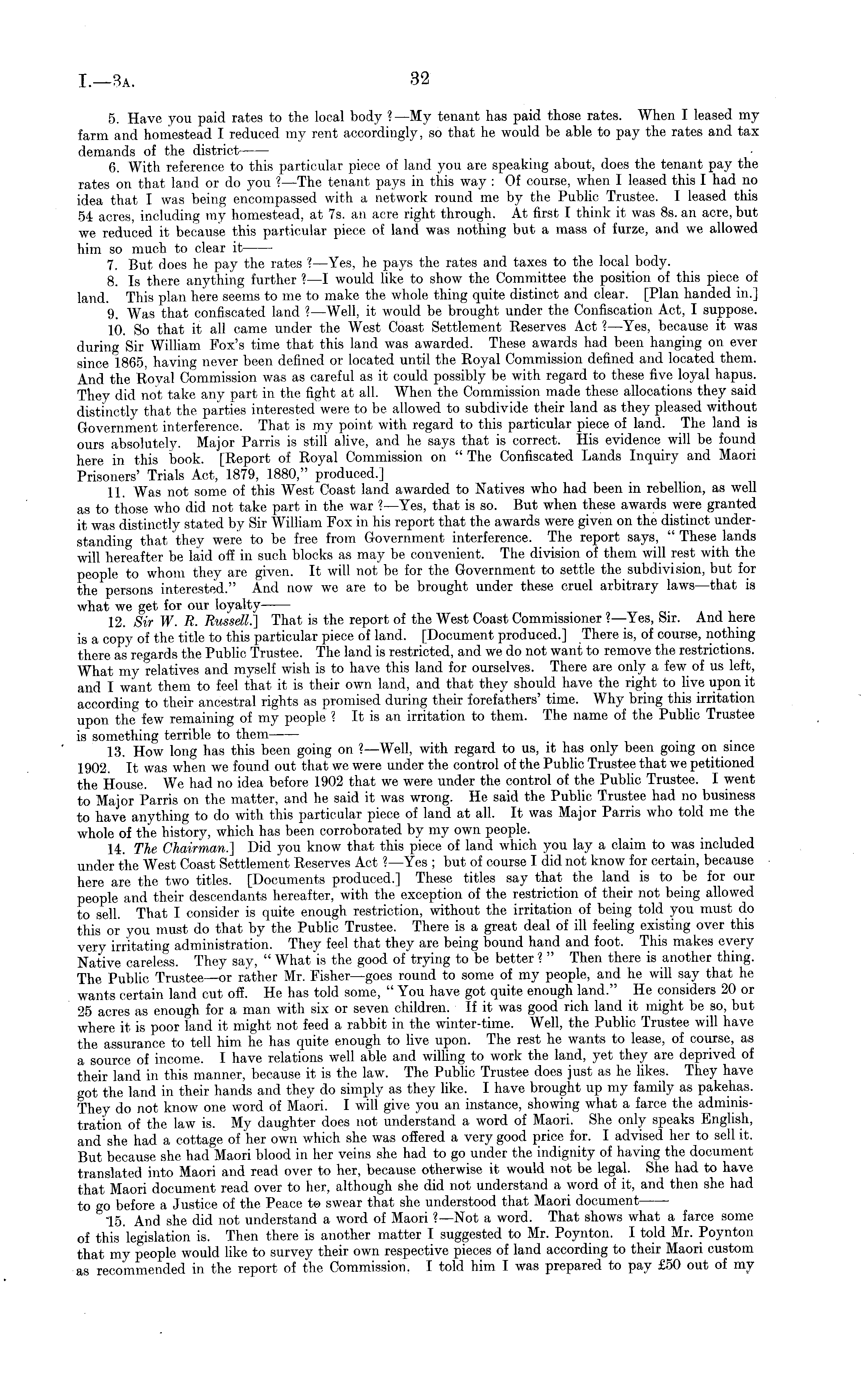 5. Have you paid rates to the local body ?—My tenant has paid those rates. When I leased my farm and homestead I reduced my rent accordingly, so that he would be able to pay the rates and tax demands of the district 6. With reference to this particular piece of land you are speaking about, does the tenant pay the rates on that land or do you ?—The tenant pays in this way : Of course, when I leased this I had no idea that I was being encompassed with a network round me by the Public Trustee. I leased this 54 acres, including my homestead, at 7s. an acre right through. At first I think it was Bs. an acre, but we reduced it because this particular piece of land was nothing but a mass of furze, and we allowed him so much to clear it 7. But does he pay the rates ? —Yes, he pays the rates and taxes to the local body. 8. Is there anything further ?—I would like to show the Committee the position of this piece of land. This plan here seems to me to make the whole thing quite distinct and clear. [Plan handed in.] 9. Was that confiscated land ? —Well, it would be brought under the Confiscation Act, I suppose. 10. So that it all came under the West Coast Settlement Reserves Act ?— Yes, because it was during Sir William Fox's time that this land was awarded. These awards had been hanging on ever since 1865, having never been defined or located until the Royal Commission defined and located them. And the Royal Commission was as careful as it could possibly be with regard to these five loyal hapus. They did not take any part in the fight at all. When the Commission made these allocations they said distinctly that the parties interested were to be allowed to subdivide their land as they pleased without Government interference. That is my point with regard to this particular piece of land. The land is ours absolutely. Major Parris is still alive, and he says that is correct. His evidence will be found here in this book. [Report of Royal Commission on " The Confiscated Lands Inquiry and Maori Prisoners' Trials Act, 1879, 1880," produced.] 11. Was not some of this West Coast land awarded to Natives who had been in rebellion, as well as to those who did not take part in the war ?—Yes, that is so. But when these awards were granted it was distinctly stated by Sir William Fox in his report that the awards were given on the distinct understanding that they were to be free from Government interference. The report says, " These lands will hereafter be laid off in such blocks as may be convenient. The division of them will rest with the people to whom they are given. It will not be for the Government to settle the subdivision, but for the persons interested." And now we are to be brought under these cruel arbitrary laws—that is what we get for our loyalty 12. Sir W. R. Russell.) That is the report of the West Coast Commissioner ?—Yes, Sir. And here is a copy of the title to this particular piece of land. [Document produced.] There is, of course, nothing there as regards the Public Trustee. The land is restricted, and we do not want to remove the restrictions. What my relatives and myself wish is to have this land for ourselves. There are only a few of us left, and I want them to feel that it is their own land, and that they should have the right to live upon it according to their ancestral rights as promised during their forefathers' time. Why bring this irritation upon the few remaining of my people ? It is an irritation to them. The name of the Public Trustee is something terrible to them 13. How long has this been going on ?—Well, with regard to us, it has only been going on since 1902. It was when we found out that we were under the control of the Public Trustee that we petitioned the House. We had no idea before 1902 that we were under the control of the Public Trustee. I went to Major Parris on the matter, and he said it was wrong. He said the Public Trustee had no business to have anything to do with this particular piece of land at all. It was Major Parris who told me the whole of the history, which has been corroborated by my own people. 14. The Chairman.] Did you know that this piece of land which you lay a claim to was included under the West Coast Settlement Reserves Act ?—Yes ; but of course I did not know for certain, because here are the two titles. [Documents produced.] These titles say that the land is to be for our people and their descendants hereafter, with the exception of the restriction of their not being allowed to sell. That I consider is quite enough restriction, without the irritation of being told you must do this or you must do that by the Public Trustee. There is a great deal of ill feeling existing over this very irritating administration. They feel that they are being bound hand and foot. This makes every Native careless. They say, " What is the good of trying to be better ? " Then there is another thing. The Public Trustee—or rather Mr. Fisher—goes round to some of my people, and he will say that he wants certain land cut off. He has told some, " You have got quite enough land." He considers 20 or 25 acres as enough for a man with six or seven children. If it was good rich land it might be so, but where it is poor land it might not feed a rabbit in the winter-time. Well, the Public Trustee will have the assurance to tell him he has quite enough to live upon. The rest he wants to lease, of course, as a source of income. I have relations well able and willing to work the land, yet they are deprived of their land in this manner, because it is the law. The Public Trustee does just as he likes. They have got the land in their hands and they do simply as they like. I have brought up my family as pakehas. They do not know one word of Maori. I will give you an instance, showing what a farce the administration of the law is. My daughter does not understand a word of Maori. She only speaks English, and she had a cottage of her own which she was offered a very good