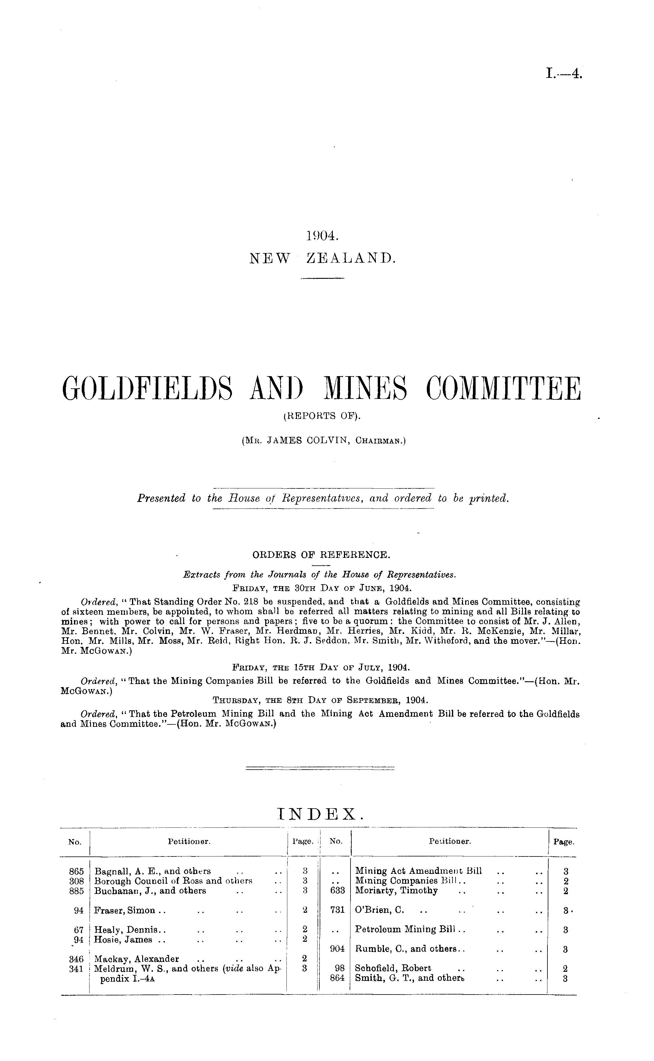 Extracts from the Journals of the House of Representatives. Friday, the 30th Day of June, 1904. Ordered, " That Standing Order No. 218 be suspended, and that a Goldfields and Mines Committee, consisting of sixteen members, be appointed, to whom shall be referred all matters relating to mining and all Bills relating to mines; with power to call for persons and papers; five to be a quorum: the Committee to consist of Mr. J. Allen, Mr. Bennet. Mr. Colvin, Mr. W. Fraser, Mr. Herdman, Mr. Hemes, Mr. Kidd, Mr. K. McKenzie, Mr. Millar, Hon. Mr. Mills, Mr. Moss, Mr. Reid, Right Hon. R. J. Seddon, Mr. Smith, Mr. Witheford, and the mover."—(Hon. Mr. McGowan.) Friday, the 15th Day of July, 1904. Ordered, " That the Mining Companies Bill be referred to the Goldfields and Mines Committee."—(Hon. Mr. McGowan.) Thursday, the Bth Day of September, 1904. Ordered, " That the Petroleum Mining Bill and the Mining Act Amendment Bill be referred to the Goldfields and Mines Committee." —(Hon. Mr. McGowan.)