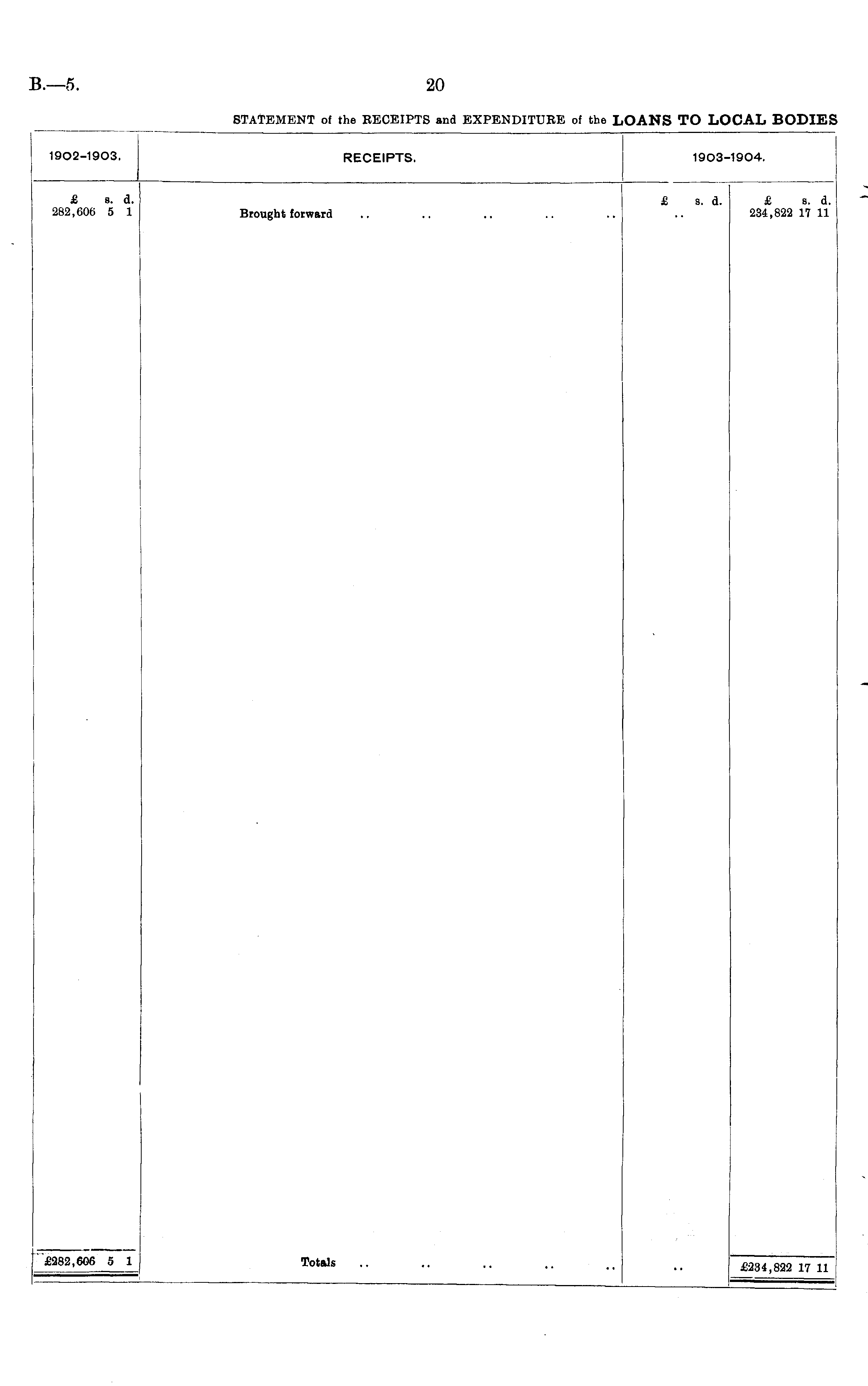1902-1903. RECEIPTS. 1903-1904. £ s. d. 282,606 5 1 £ s. d. £ s. d. 234,822 17 11 Brought forward £282,606 5 1 Totals £234,822 17 11