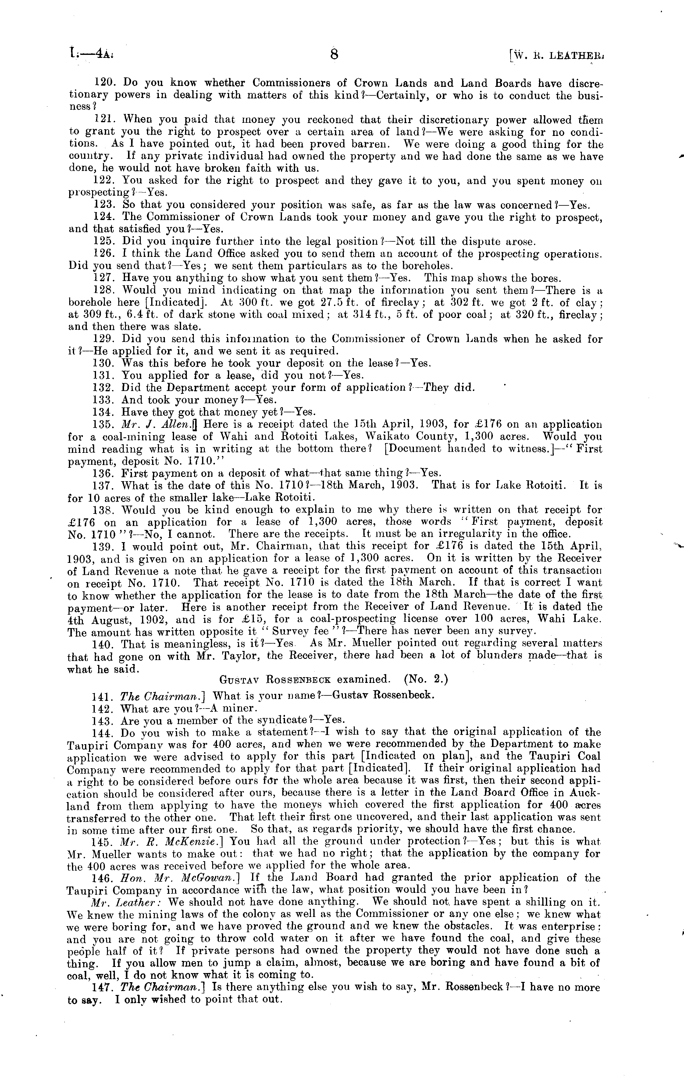 120. Do you know whether Commissioners of Crown Lands and Land Boards have discretionary powers in dealing with matters of this kind? —Certainly, or who is to conduct the business? 121. When you paid that money you reckoned that their discretionary power allowed them to grant you the right to prospect over a certain area of land? —We were asking for no conditions. As I have pointed out, it had been proved barren. We were doing a good thing for the country. If any private individual hud owned the property and we had done the same as we have done, he would not have broken faith with us. 122. You asked for the right to prospect and they gave it to you, and you spent money on prospecting!— Yes. 123. So that you considered your position was safe, as far as the law was concerned? —Yes. 124. The Commissioner of Crown Lands took your money and gave you the right to prospect, and that satisfied you ? —Yes. 125. Did you inquire further into the legal position? —Not till the dispute arose. 126. I think the Land Office asked you to send them an account of the prospecting operations. Did you send that? —Yes; we sent them particulars as to the boreholes. 127. Have you anything to show what you sent them? -Yes. This map shows the bores. 128. Would you mind indicating on that map the information you sent them? —There is a borehole here [Indicated]. At 300 ft. we got 27.5 ft. of fireclay; at 302 ft. we got 2 ft. of clay ; at 309 ft., 6.4 ft. of dark stone with coal mixed; at 314 ft., sft. of poor coal; at 320 ft., fireclay; and then there was slate. 129. Did you send this infoiination to the Commissioner of Crown Lands when he asked for it? —He applied for it, and we sent it as required. 130. Was this before he took your deposit on the lease? —Yes. 131. You applied for a lease, did you not? —Yes. 132. Did the Department accept your form of application? They did. 133. And took your money? —Yes. 134. Have they got chat money yet?— Yes. 135. Mr. J. Here is a receipt dated the 15th April, 1903, for £176 on an application for a coal-mining lease of Wahi and Rotoiti Lakes, W T aikato County, 1,300 acres. Would you mind reading what is in writing at the bottom there? [Document handed to witness.] —"First payment, deposit No. 1710." 136. First payment on a deposit of what—that same thing? —Yes. 137. What is the date of this No. 1710?—18th March, 1903. That is for Lake Rotoiti. It is for 10 acres of the smaller lake -Lake Rotoiti. 138. Would you be kind enough to explain to me why there i« written on that receipt for ,£176 on an application for a lease of 1,300 acres, those words " First payment, deposit No. 1710 " ? —No, I cannot. There are the receipts. It must be an irregularity in the office. 139. I would point out, Mr. Chairman, that this receipt for £176 is dated the 15th April, 1903, and is given on an application for a lease of 1,300 acres. On it is written by the Receiver of Land Revenue a note that he gave a receipt for the first payment on account of this transaction on receipt No. 1710. That receipt No. 1710 is dated the 18th March. If that is correct I want to know whether the application for the lease is to date from the 18th March —the date of the first payment —or later. Here is another receipt from the Receiver of Land Revenue. It is dated the 4th August, 1902, and is for £15, for a coal-prospecting license over 100 acres, Wahi Lake. The amount has written opposite it " Survey fee " I— There has never been any survey. 140. That is meaningless, is it? —Yes. As Mr. Mueller pointed out regarding several matters that had gone on with Mr. Taylor, the Receiver, there had been a lot of blunders made —that is what he said. Gustav Rossenbeck examined. (No. 2.) 141. The Chairman.} What is your name?—Gustav Rossenbeck. 142. What are you? -A miner. 143. Are you a "member of the syndicate?— Yes. 144. Do you wish to make a statement? —I wish to say that the original application of the Taupiri Company was for 400 acres, and when we were recommended by the Department to make application we were advised to apply for this part [Indicated on plan], and the Taupiri Coal Company were recommended to apply for that part [Indicated]. If their original application had a right to be considered before ours fdr the whole area because it was first, then their second application should be considered after ours, because there is a letter in the Land Board Office in Auckland from them applying to have the moneys which covered the first application for 400 a«res transferred to the other one. That left their first one uncovered, and their last application was sent in some time after our first one. So that, as regards priority, we should have the first chance. 145. Mr. R. McKenzie.] You had all the ground under protection? —Yes: but this is what Mr. Mueller wants to make out: that we had no right; that the application by the company for the 400 acres was received before we applied for the whole area. 146. Hon. Mr. McGowan.] If the Land Board had granted the prior application of the Taupiri Company in accordance with the law, what position would you have been in ? Mr. Leather: We should not have done anything. We should not have spent a shilling on it. We knew the mining laws of the colony as well as the Commissioner or any one else : we knew what we were boring for, and we have proved the ground and we knew the obstacles. It was enterprise : and you are not going to throw cold water on it after we have found the coal, and give these people half of it? If private persons had owned the property they would not have done such a thing. If you allow men to jump a claim, almost, because we are boring and have found a bit of coal, well, I do not know what it is coming to. 147. The Chairman.] Is there anything else you wish to say, Mr. Rossenbeck? —I have no more to say. I only wished to point that out.