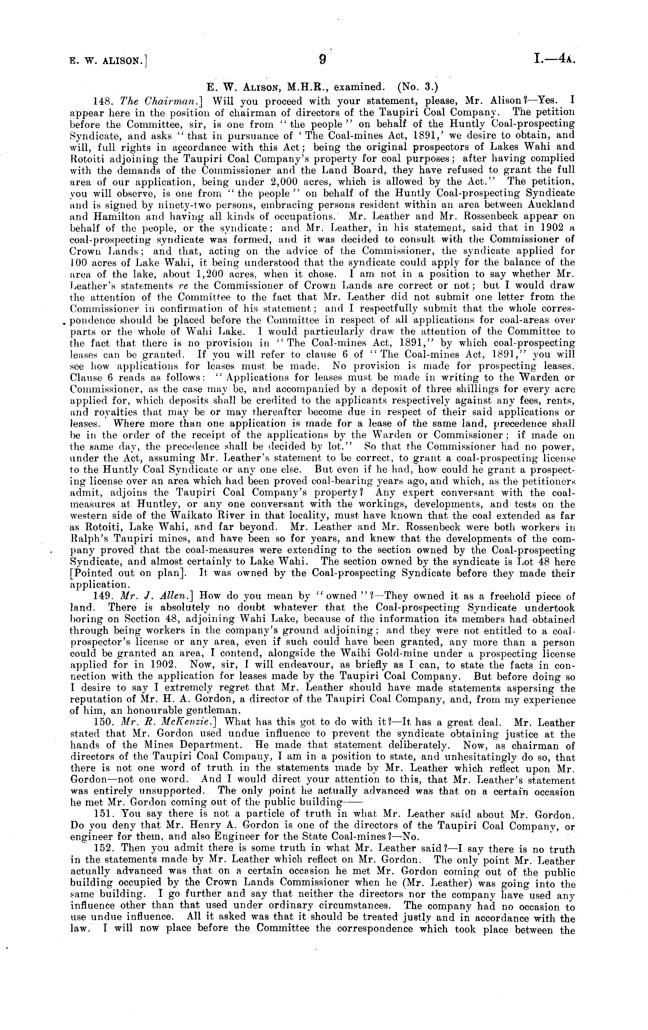 E. W. Alison, M.H.R., examined. (No. 3.) 148. The Chairman.] Will you proceed with your statement, please, Mr. Alison? —Yes. I appear here in the position of chairman of directors of the Taupiri Coal Company. The petition before the Committee, sir, is one from " the people " on behalf of the Huntly Coal-prospecting Syndicate, and asks " that in pursuance of ' The Coal-mines Act, 1891,' we desire to obtain, and will, full rights in accordance with this Act; being the original prospectors of Lakes Wahi and Rotoiti adjoining the Taupiri Coal Company's property for coal purposes; after having complied with the demands of the Commissioner and the Land Board, they have refused to grant the full area of our application, being under 2,000 acres, which is allowed by the Act." The petition, you will observe, is one from " the people " on behalf of the Huntly Coal-prospecting Syndicate and is signed by ninety-two persons, embracing persons resident within an area between Auckland and Hamilton and having all kinds of occupations. Mr. Leather and Mr. Rossenbeck appear on behalf of the people, or the syndicate; and Mr. Leather, in his statement, said that in 1902 a coal-prospecting syndicate was formed, and it was decided to consult with the Commissioner of Crown Lands; and that, acting on the advice of the Commissioner, the syndicate applied for 100 acres of Lake Wahi, it being understood that the syndicate could apply for the balance of the urea of the lake, about 1,200 acres, when it chose. I am not in a position to say whether Mr. Leather's statements re the Commissioner of Crown Lands are correct or not; but I would draw the attention of the Committee to the fact that Mr. Leather did not submit one letter from the Commissioner in confirmation of his statement; and I respectfully submit that the whole correspondence should be placed before the Committee in respect of all applications for coal-areas over parts or the whole of Wahi Lake. I would particularly draw the attention of the Committee to the fact that there is no provision in "The Coal-mines Act, 1891," by which coal-prospecting leases can be granted. If you will refer to clause 6 of " The Coal-mines Act, 1891," you will see how applications for leases must be made. No provision is made for prospecting leases. Clause 6 reads as follows: " Applications for leases must be made in writing to the Warden or Commissioner, as the case may be, and accompanied by a deposit of three shillings for every acre applied for, which deposits shall be credited to the applicants respectively against any fees, rents, and royalties that may be or may thereafter become due in respect of their said applications or leases. Where more than one application is made for a lease of the same land, precedence shall be in the order of the receipt of the applications by the Warden or Commissioner ; if made on the same day, the precedence shall be decided by lot." So that the Commissioner had no power, under the Act, assuming Mr. Leather's statement to be correct, to grant a coal-prospecting license to the Huntly Coal Syndicate or any one else. But even if he had, how could he grant a prospecting license over an area which had been proved coal-bearing years ago, and which, as the petitioners admit, adjoins the Taupiri Coal Company's property? Any expert conversant with the coalmeasures at Huntley, or any one conversant with the workings, developments, and tests on the western side of the Waikato River in that locality, must have known that the coal extended as far as Rotoiti, Lake Wahi, and far beyond. Mr. Leather and Mr. Rossenbeck were both workers in Ralph's Taupiri mines, and have been so for years, and knew that the developments of the company proved that the coal-measures were extending to the section owned by the Coal-prospecting Syndicate, and almost certainly to Lake Wahi. The section owned by the syndicate is Lot 48 here [Pointed out on plan]. It was owned by the Coal-prospecting Syndicate before they made their application. 149. Mr. J. Allen.'] How do you mean by "owned "1 —They owned it as a freehold piece of land. There is absolutely no doubt whatever that the Coal-prospecting Syndicate undertook boring on Section 48, adjoining Wahi Lake, because of the information its members had obtained through being workers in the company's ground adjoining ; and they were not entitled to a coalprospector's license or any area, even if such could have been granted, any more than a person could be granted an area, I contend, alongside the Waihi Gold-mine under a prospecting license applied for in 1902. Now, sir, I will endeavour, as briefly as I can, to state the facts in connection with the application for leases made by the Taupiri Coal Company. But before doing so I desire to say I extremely regret that Mr. Leather should have made statements aspersing the reputation of Mr. H. A. Gordon, a director of the Taupiri Coal Company, and, from my experience of him, an honourable gentleman. 150. Mr. R. McKenzie.] What has this got to do with it? —It has a great deal. Mr. Leather stated that Mr. Gordon used undue influence to prevent the syndicate obtaining justice at the hands of the Mines Department. He made that statement deliberately. Now, as chairman of directors of the Taupiri Coal Company, I am in a position to state, and unhesitatingly do so, that there is not one word of truth in the statements made by Mr. Leather which reflect upon Mr. Gordon —not one word. And I would direct your attention to this, that Mr. Leather's statement was entirely unsupported. The only point he actually advanced was that on a certain occasion he met Mr. Gordon coming out of the public building 151. You say there is not a particle of truth in what Mr. Leather said about Mr. Gordon. Do you deny that Mr. Henry A. Gordon is one of the directors of the Taupiri Coal Company, or engineer for them, and also Engineer for the State Coal-mines? —No. 152. Then you admit there is some truth in wha