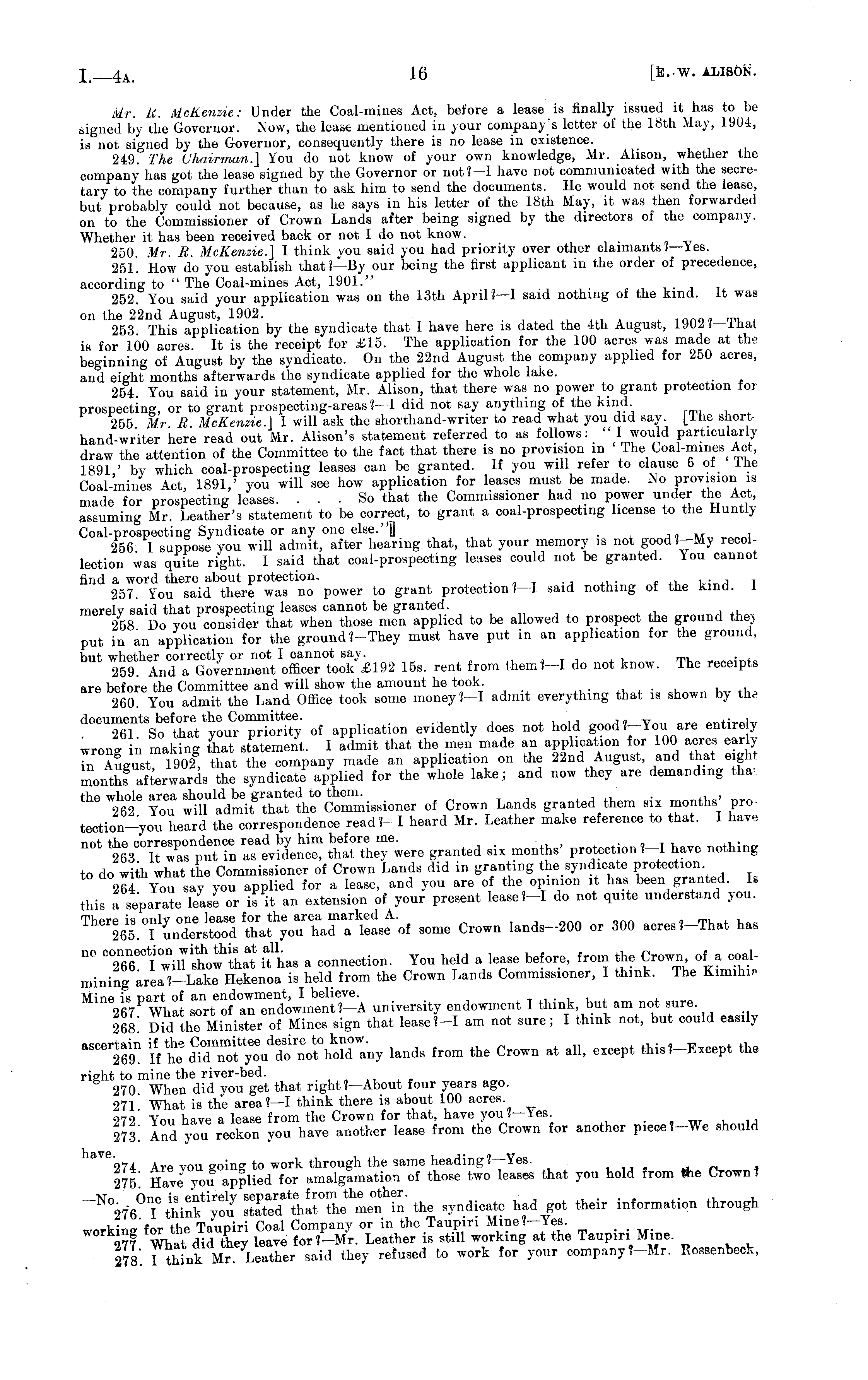 Mr. It. McKenzie: Under the Coal-mines Act, before a lease is finally issued it has to be signed by the Governor. Now, the lease mentioned in your company's letter of the 18th May, 1904, is not signed by the Governor, consequently there is no lease in existence. 249. The Chairman.] You do not know of your own knowledge, Mr. Alison, whether the company has got the lease signed by the Governor or not?—l have not communicated with the secretary to the company further than to ask him to send the documents. He would not send the lease, but probably could not because, as he says in his letter of the 18th May, it was then forwarded on to the Commissioner of Crown Lands after being signed by the directors of the company. Whether it has been received back or not I do not know. 250 Mr. B. McKenzie.] I think you said you had priority over other claimants?— Yes. 251. How do you establish that?—By our being the first applicant in the order of precedence, according to " The Coal-mines Act, 1901." 252. You said your application was on the 13th April?—l said nothing of the kind, it was on the 22nd August, 1902. . ' 253 This application by the syndicate that I have here is dated the 4th August, 1902 I— Inat is for 100 acres. It is the receipt for £15. The application for the 100 acres was made at the beginning of August by the syndicate. On the 22nd August the company applied for 250 acres, and eight months afterwards the syndicate applied for the whole lake. 254. You said in your statement, Mr. Alison, that there was no power to grant protection for prospecting, or to grant prospecting-areas ?—I did not say anything of the kind 255 Mr B McKenzie.] I will ask the shorthand-writer to read what you did say. [ihe short hand-writer here read out Mr. Alison's statement referred to as follows: "I would particularly draw the attention of the Committee to the fact that there is no provision in The Coal-mines Act, 1891 ' by which coal-prospecting leases can be granted. If you will refer to clause 6of ihe Coal-mines Act, 1891,' you will see how application for leases must be made. No provision is made for prospecting leases. ... So that the Commissioner had no power under the Act, assuming Mr. Leather's statement to be correct, to grant a coal-prospecting license to the Huntly Coal-prospecting Syndicate or any one else."[] . .. „ , 256 I suppose you will admit, after hearing that, that your memory is not good?-My recollection was quite right. I said that coal-prospecting leases could not be granted. You cannot find a word there about protection, 257. You said there was no power to grant protection?—! said nothing of the kind. 1 merely said that prospecting leases cannot be granted. 258 Do you consider that when those men applied to be allowed to prospect the ground thej put in an application for the ground ?-They must have put in an application for the ground, but whether correctly or not I cannot say. ' And a Government officer took £192 15s. rent from them?-I do not know. The receipts are before the Committee and will show the amount he took. ~,.„, , v + , 260. You admit the Land Office took some money?-! admit everything that is shown by th* of application evidently does not hold good?-You are entirely wrong n making that statement. I admit that the men made an application for 100 acres early L August, 1902 S that the company made an application on the 22nd August, and that eight months afterwards the syndicate applied for the whole lake; and now they are demanding tha. fhA whole area should be granted to them. . the whole area ano, Commisgioner of Crown Laild s granted them six months pro-tection-you heard the correspondence read?-I heard Mr. Leather make reference to that. I have not. the correspondence read by him before me. . not the oorrosp granted hg , p tect n1 t have nothing to do with what the Commissioner of Crown Lands did in granting the syndicate protection 264 You say you applied for a lease, and you are of the opinion it has been granted. Is this a separate lease or is it an extension of your present lease ?-I do not quite understand you. some Crown lands-200 or 300 acres?-That has no connection with^ at .11 mining areal-Lake Hekenoa is held from the Crown Lands Commissioner, I think. The Kimihi, Mine is Dart of an endowment, I believe. 267 What sort of an endowmentl-A university endowment I think but am not sure. 268! Did the Minister of Mines sign that lease?-I am not sure; I think not, but could easily ascertain if the Committee desire to know. . , ascertain £™£ yQu do nQt hold any lands {rom the Crown at all, except this?-Except the right to mine the river-bed. 270 When did you get that right?-About four years ago. 271 What is the area?—l think there is about 100 acres. 272' You have a lease from the Crown for that, have you?—ltes. 273. And you reckon you have another lease from the Crown for another piece ?-We should ha l 7 75/ ** h m. *- *■ c —* N syndicate had got their information through wnTldntr'for the Taupiri Coal Company or in the Taupiri Mine?— Yes. 277 What did they leave fort-Mr. Leather is still working at the Taupm Mine. 278. Ithink Mr. Leather said they refused to work for your company t-Mr. Rossenbeck,