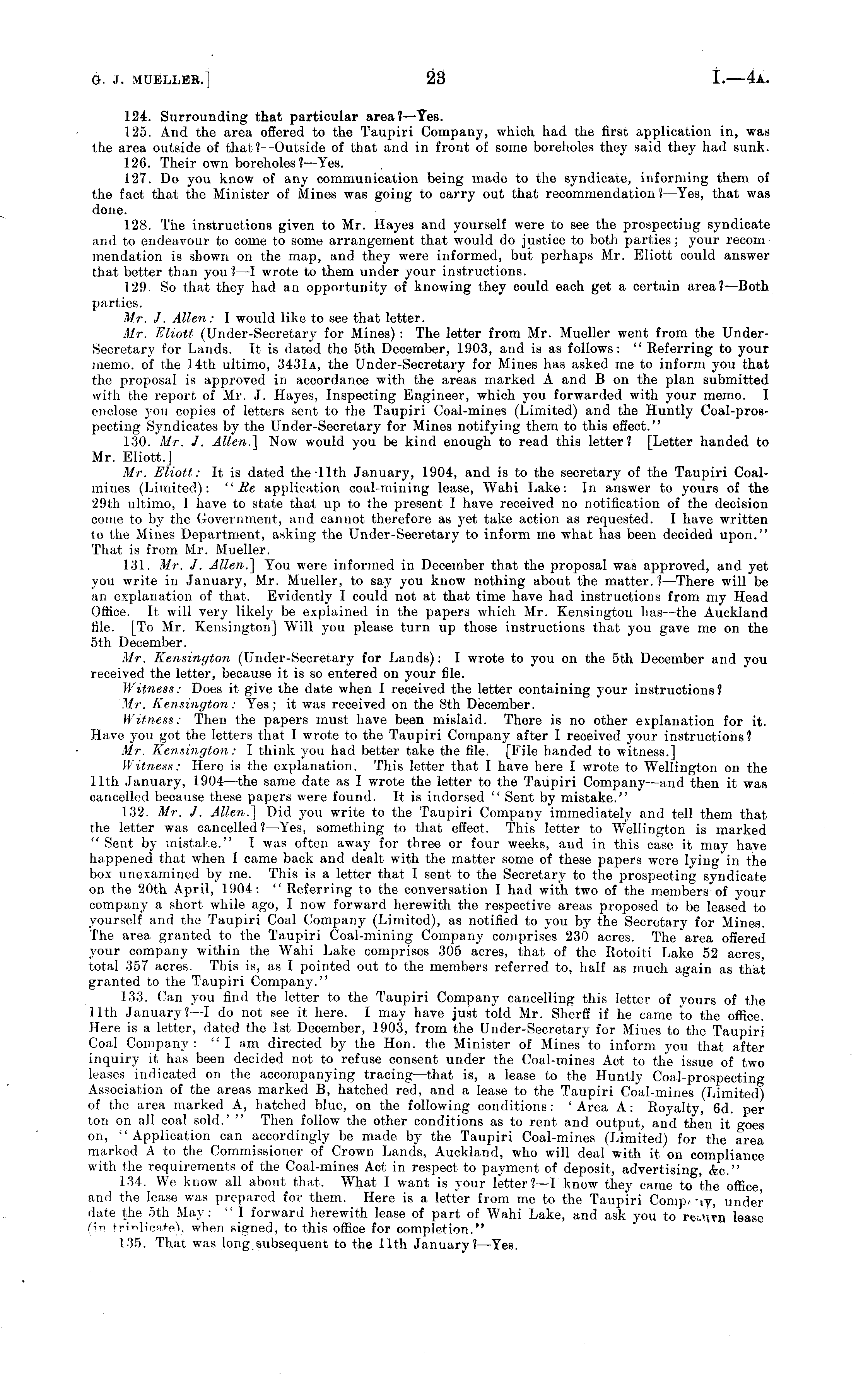 124. Surrounding that particular area? —Yes. 125. And the area offered to the Taupiri Company, which had the first application in, was the area outside of that ? —Outside of that and in front of some boreholes they said they had sunk. 126. Their own boreholes I— Yes. 127. Do you know of any communication being made to the syndicate, informing them of the fact that the Minister of Mines was going to carry out that recommendation ? —Yes, that was done. 128. The instructions given to Mr. Hayes and yourself were to see the prospecting syndicate and to endeavour to come to some arrangement that would do justice to both parties; your recom mendation is shown on the map, and they were informed, but perhaps Mr. Eliott could answer that better than you? —I wrote to them under your instructions. 129. So that they had an opportunity of knowing they could each get a certain area? —Both parties. Mr. J. Allen: I would like to see that letter. Mr. Eliott (Under-Secretary for Mines) : The letter from Mr. Mueller went from the Undersecretary for Lands. It is dated the sth December, 1903, and is as follows: " Referring to your memo, of the 14th ultimo, 3431 a, the Under-Secretary for Mines has asked me to inform you that the proposal is approved in accordance with the areas marked A and B on the plan submitted with the report of Mr. J. Hayes, Inspecting Engineer, which you forwarded with your memo. I enclose you copies of letters sent to the Taupiri Coal-mines (Limited) and the Huntly Coal-pros-pecting Syndicates by the Under-Secretary for Mines notifying them to this effect." 130. Mr. J. Allen.] Now would you be kind enough to read this letter? [Letter handed to Mr. Eliott.] Mr. Eliott: It is dated the 11th January, 1904, and is to the secretary of the Taupiri Coalmines (Limited): "Be application coal-mining lease, Wahi Lake: In answer to yours of the 29th ultimo, I have to state that up to the present I have received no notification of the decision come to by the Government, and cannot therefore as jet take action as requested. I have written to the Mines Department, asking the Under-Secretary to inform me what has been decided upon." That is from Mr. Mueller. 131. Mr. J. Allen.] You were informed in December that the proposal was approved, and yet you write in January, Mr. Mueller, to say you know nothing about the matter. ? —There will be an explanation of that. Evidently I could not at that time have had instructions from my Head Office. It will very likely be explained in the papers which Mr. Kensington has---the Auckland file. [To Mr. Kensington] Will you please turn up those instructions that you gave me on the sth December. Mr. Kensington (Under-Secretary for Lands): I wrote to you on the sth December and you received the letter, because it is so entered on your file. Witness: Does it give the date when I received the letter containing your instructions? Mr. Kensington: Yes; it was received on the Bth December. Witness: Then the papers must have been mislaid. There is no other explanation for it. Have you got the letters that I wrote to the Taupiri Company after I received your instructions? Mr. Kensington: I think you had better take the file. [File handed to witness.] Witness: Here is the explanation. This letter that I have here I wrote to Wellington on the 11th January, 1904 —the same date as I wrote the letter to the Taupiri Company —and then it was cancelled because these papers were found. It is indorsed " Sent by mistake." 132. Mr. J . Allen.] Did you write to the Taupiri Company immediately and tell them that the letter was cancelled? —Yes, something to that effect. This letter to Wellington is marked " Sent by mistake." I was often away for three or four weeks, and in this case it may have happened that when I came back and dealt with the matter some of these papers were lying in the box unexamined by me. This is a letter that I sent to the Secretary to the prospecting syndicate on the 20th April, 1904: " Referring to the conversation I had with two of the members of jour company a short while ago, I now forward herewith the respective areas proposed to be leased to yourself and the Taupiri Coal Company (Limited), as notified to you by the Secretary for Mines. The area granted to the Taupiri Coal-mining Company comprises 230 acres. The area offered your company within the Wahi Lake comprises 305 acres, that of the Rotoiti Lake 52 acres, total 357 acres. This is, as I pointed out to the members referred to, half as much again as that granted to the Taupiri Company." 133. Can you find the letter to the Taupiri Company cancelling this letter of yours of the 11th January? —I do not see it here. I may have just told Mr. Sherff if he came to the office. Here is a letter, dated the Ist December, 1903, from the Under-Secretary for Mines to the Taupiri Coal Company : "I am directed by the Hon. the Minister of Mines to inform you that after inquiry it has been decided not to refuse consent under the Coal-mines Act to the issue of two leases indicated on the accompanying tracing —that is, a lease to the Huntly Coal-prospecting Association of the areas marked B, hatched red, and a lease to the Taupiri Coal-mines (Limited) of the area marked A, hatched blue, on the following conditions: 'Area A: Royalty, 6d. per ton on all coal sold.' ' Then follow the other conditions as to rent and output, and then it goes on, "Application can accordingly be made by the Taupiri Coal-mines (Limited) for the area marked A to the Commissioner of Crown Lands, Auckland, who will deal with it on compliance with the requirements of the Coal-mines Act in respect to payment of deposit, advertising, &c." 134. We know all about that. What I want is your letter?—l know they came to the office, and the lease was prepared for them. Here is a letter from me to the Taupiri iy, under date the sth May: " I forward herewith lease of part of Wahi Lake, and ask you to return lease ([ v trir>licn>e), when sign