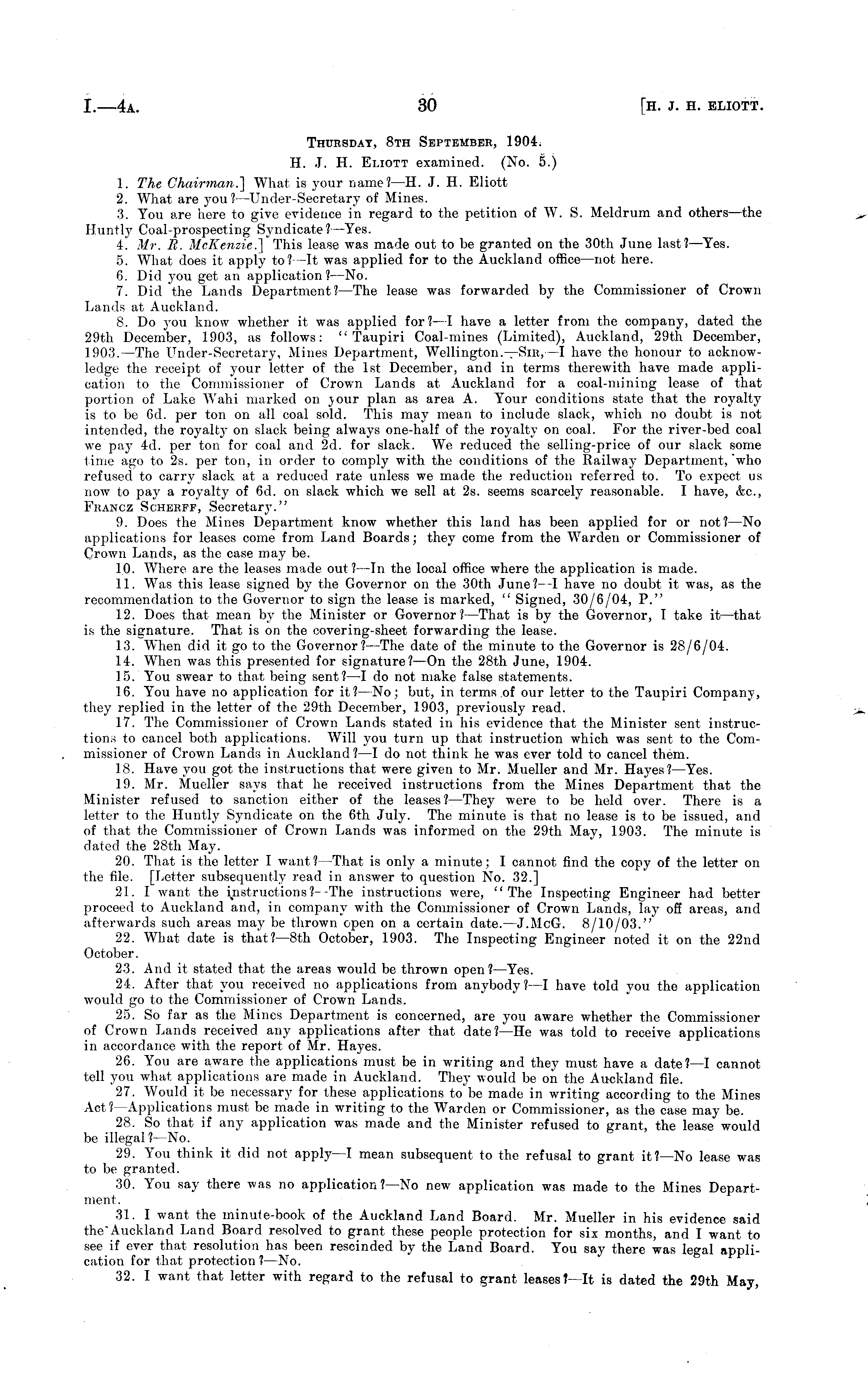 Thursday, Bth September, 1904; H. J. H. Eliott examined. (No. 5.) 1. The Chairman.} What is your name?—H. J. H. Eliott 2. What are you ? —Under-Secretary of Mines. 3. You are here to give evidence in regard to the petition of W. S. Meldrum and others —the Huntly Coal-prospecting Syndicate? —Yes. 4. Mr. B. McKenzie.] This lease was made out to be granted on the 30th June last? —Yes. 5. What does it apply to? —It was applied for to the Auckland office —not here. 6. Did you get an application? —No. 7. Did the Lands Department? —The lease was forwarded by the Commissioner of Crown Lands at Auckland. 8. Do you know whether it was applied for? —I have a letter from the company, dated the 29th December, 1903, as follows: "Taupiri Coal-mines (Limited), Auckland, 29th December, 1903. —The Under-Secretary, Mines Department, Wellington.—Sir, —I have the honour to acknowledge the receipt of your letter of the Ist December, and in terms therewith have made application to the Commissioner of Crown Lands at Auckland for a coal-mining lease of that portion of Lake Wahi marked on jour plan as area A. Your conditions state that the royalty is to be 6d. per ton on all coal sold. This may mean to include slack, which no doubt is not intended, the royalty on slack being always one-half of the royalty on coal. For the river-bed coal we pay 4d. per ton for coal and 2d. for slack. We reduced the selling-price of our slack some time ago to 2s. per ton, in order to comply with the conditions of the Railway Department, who refused to carry slack at a reduced rate unless we made the reduction referred to. To expect us now to pay a royalty of 6d. on slack which we sell at 2s. seems scarcely reasonable. I have, &c, Francz Scherpf, Secretary." 9. Does the Mines Department know whether this land has been applied for or not? —No applications for leases come from Land Boards; they come from the Warden or Commissioner of Crown Lands, as the case may be. 10. Where are the leases made out? —In the local office where the application is made. 11. Was this lease signed by the Governor on the 30th June?--I have no doubt it was, as the recommendation to the Governor to sign the lease is marked, " Signed, 30/6/04, P." 12. Does that mean by the Minister or Governor? —That is by the Governor, I take it —that is the signature. That is on the oovering-sheet forwarding the lease. 13. When did it go to the Governor? —The date of the minute to the Governor is 28/6/04. 14. When was this presented for signature? —On the 28th June, 1904. 15. You swear to that being sent? —I do not make false statements. 16. You have no application for it? —No; but, in terms of our letter to the Taupiri Company, they replied in the letter of the i!9th December, 1903, previously read. 17. The Commissioner of Crown Lands stated in his evidence that the Minister sent instructions to cancel both applications. Will you turn up that instruction which was sent to the Commissioner of Crown Lands in Auckland? —I do not think he was ever told to cancel them. 18. Have you got the instructions that were given to Mr. Mueller and Mr. Hayes? —Yes. 19. Mr. Mueller says that he received instructions from the Mines Department that the Minister refused to sanction either of the leases? —They were to be held over. There is a letter to the Huntly Syndicate on the 6th July. The minute is that no lease is to be issued, and of that the Commissioner of Crown Lands was informed on the 29th May, 1903. The minute is dated the 28th May. 20. That is the letter I want? —That is only a minute; I cannot find the copy of the letter on the file. [Letter subsequently read in answer to question No. 32.] 21. I want the instructions?--The instructions were, "The Inspecting Engineer had better proceed to Auckland and, in company with the Commissioner of Crown Lands, lay oft areas, and afterwards such areas may be thrown open on a certain date. —J.MoG. 8/10/03." 22. What date is that?—Bth October, 1903. The Inspecting Engineer noted it on the 22nd October. 23. And it stated that the areas would be thrown open? —Yes. 24. After that you received no applications from anybody?—l have told you the application would go to the Commissioner of Crown Lands. 25. So far as the Mines Department is concerned, are you aware whether the Commissioner of Crown Lands received any applications after that date? —He was told to receive applications in accordance with the report of Mr. Hayes. 26. You are aware the applications must be in writing and they must have a date?—l cannot tell you what applications are made in Auckland. They would be on the Auckland file. 27. Would it be necessary for these applications to be made in writing according to the Mines Act?— Applications must be made in writing to the Warden or Commissioner, as the case may be. 28. So that if any application was made and the Minister refused to grant, the lease would be illegal ?—No. 29. You think it did not appfy—l mean subsequent to the refusal to grant it?—No lease was to be granted. 30. You say there was no application ?—No new application was made to the Mines Department. 31. I want the ininui e-book of the Auckland Land Board. Mr. Mueller in his evidence said the' Auckland Land Board resolved to grant these people protection for six months, and I want to see if ever that resolution has been rescinded by the Land Board. You say there was legal application for that protection I—No.1 —No. 32. I want that letter with regard to the refusal to grant leases?—lt is dated the 29th May,