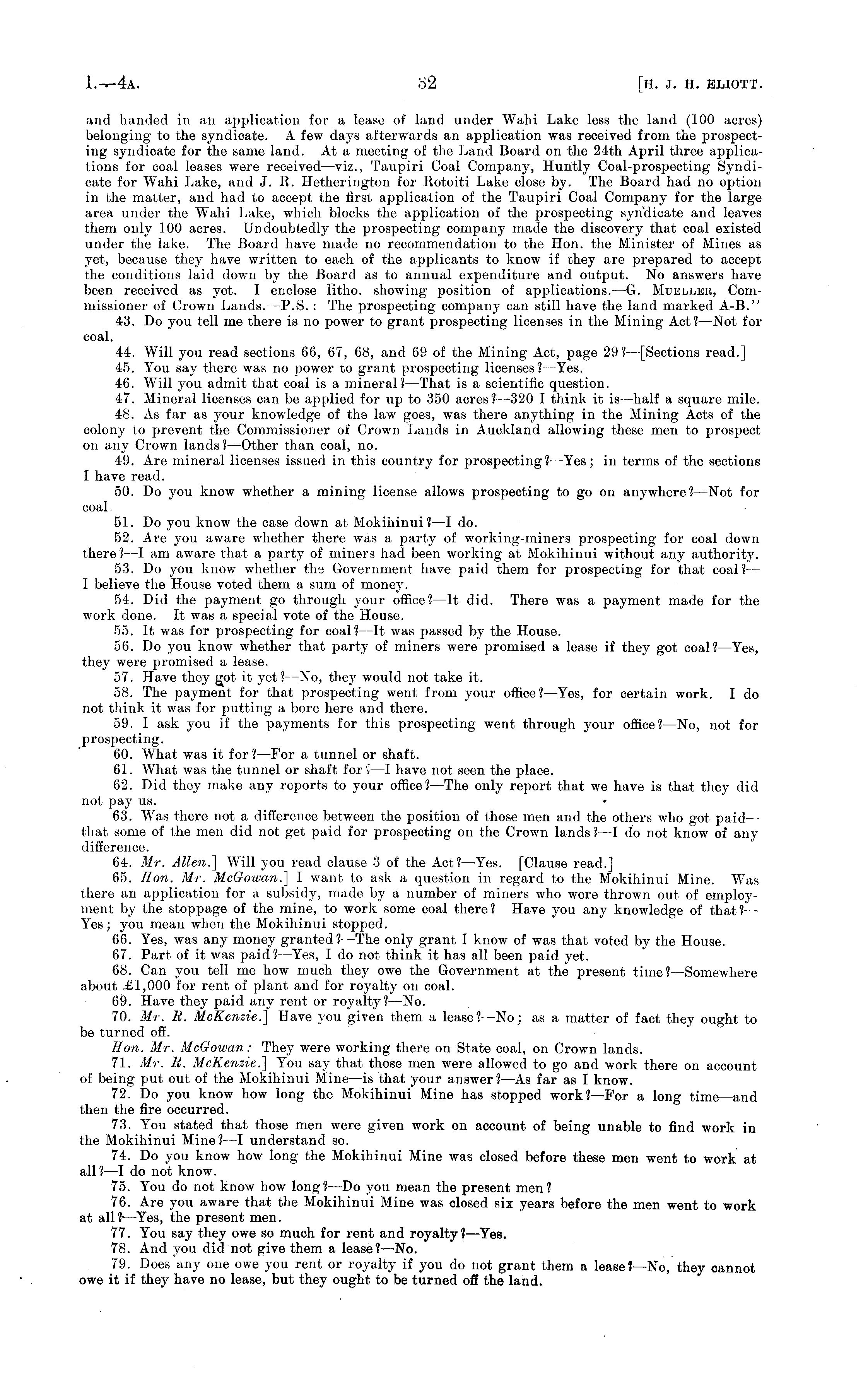and handed in an application for a lease of land under Wahi Lake less the land (100 acres) belonging to the syndicate. A few days afterwards an application was received from the prospecting syndicate for the same land. At a meeting of the Land Board on the 24th April three applications for coal leases were received —viz., Taupiri Coal Company, Huntly Coal-prospecting Syndicate for Wahi Lake, and J. 11. Hetherington for Rotoiti Lake close by. The Board had no option in the matter, and had to accept the first application of the Taupiri Coal Company for the large area under the Wahi Lake, which blocks the application of the prospecting syndicate and leaves them only 100 acres. Undoubtedly the prospecting company made the discovery that coal existed under the lake. The Board have made no recommendation to the Hon. the Minister of Mines as yet, because they have written to each of the applicants to know if chey are prepared to accept the conditions laid down by the Board as to annual expenditure and output. No answers have been received as yet. I enclose litho. showing position of applications. —G. Mueller, Commissioner of Crown Lands.-—P.S. : The prospecting company can still have the land marked A-B." 43. Do you tell me there is no power to grant prospecting licenses in the Mining Act? —Not for coal. 44. Will you read sections 66, 67, 68, and 69 of the Mining Act, page 29? —[Sections read.] 45. You say there was no power to grant prospecting licenses? —Yes. 46. Will you admit that coal is a mineral? —That is a scientific question. 47. Mineral licenses can be applied for up to 350 acres? —320 I think it is—half a square mile. 48. As far as your knowledge of the law goes, was there anything in the Mining Acts of the colony to prevent the Commissioner of Crown Lands in Auckland allowing these men to prospect on any Crown lands ? —Other than coal, no. 49. Are mineral licenses issued in this country for prospecting? —Yes; in terms of the sections I have read. 50. Do you know whether a mining license allows prospecting to go on anywhere? —Not for coal. 51. Do you know the case down at Mokihinui? —I do. 52. Are you aware whether there was a party of working-miners prospecting for coal down there? —I am aware that a party of miners had been working at Mokihinui without any authority. 53. Do you know whether the Government have paid them for prospecting for that coal? — I believe the House voted them a sum of money. 54. Did the payment go through your office? —It did. There was a payment made for the work done. It was a special vote of the House. 55. It was for prospecting for coal? —It was passed by the House. 56. Do you know whether that party of miners were promised a lease if they got coal? —Yes, they were promised a lease. 57. Have they got it yet? —No, they would not take it. 58. The payment for that prospecting went from your office? —Yes, for certain work. I do not think it was for putting a bore here and there. 59. I ask you if the payments for this prospecting went through your office? —No, not for prospecting. 60. What was it for ? —For a tunnel or shaft. 61. What was the tunnel or shaft for , ! —I have not seen the place. 62. Did they make any reports to your office? —The only report that we have is that they did not pay us. 63. Was there not a difference between the position of those men and the others who got paid--that some of the men did not get paid for prospecting on the Crown lands ? —I do not know of any difference. 64. Mr. Allen.'] Will you read clause 3 of the Act? —Yes. [Clause read.] 65. Hon. Mr. McGowan.] I want to ask a question in regard to the Mokihinui Mine. Was there an application for a subsidy, made by a number of miners who were thrown out of employment by the stoppage of the mine, to work some coal there? Have you any knowledge of that? — Yes; you mean when the Mokihinui stopped. 66. Yes, was any money granted? -The only grant I know of was that voted by the House. 67. Part of it was paid? —Yes, I do not think it has all been paid yet. 68. Can you tell me how much they owe the Government at the present time? —Somewhere about £1,000 for rent of plant and for royalty on coal. 69. Have they paid any rent or royalty? —No. 70. Mr. B. McKcnzie.] Have you given them a lease?--No; as a matter of fact they ought to be turned off. Hon. Mr. McGowan: They were working there on State coal, on Crown lands. 71. Mr. It. McKenzie.] You say that those men were allowed to go and work there on account of being put out of the Mokihinui Mme —is that your answer? —As far as I know. 72. Do you know how long the Mokihinui Mine has stopped work? —For a long time —and then the fire occurred. 73. You stated that those men were given work on account of being unable to find work in the Mokihinui Mine? —I understand so. 74. Do you know how long the Mokihinui Mine was closed before these men went to work at all? —I do not know. 75. You do not know how long? —Do you mean the present men? 76. Are you aware that the Mokihinui Mine was closed six years before the men went to work at all I— Yes, the present men. 77. You say they owe so much for rent and royalty? —Yes. 78. And you did not give them a lease? —No. 79. Does any one owe you rent or royalty if you do not grant them a lease?-—No, they cannot owe it if they have no lease, but they ought to be turned off the land.