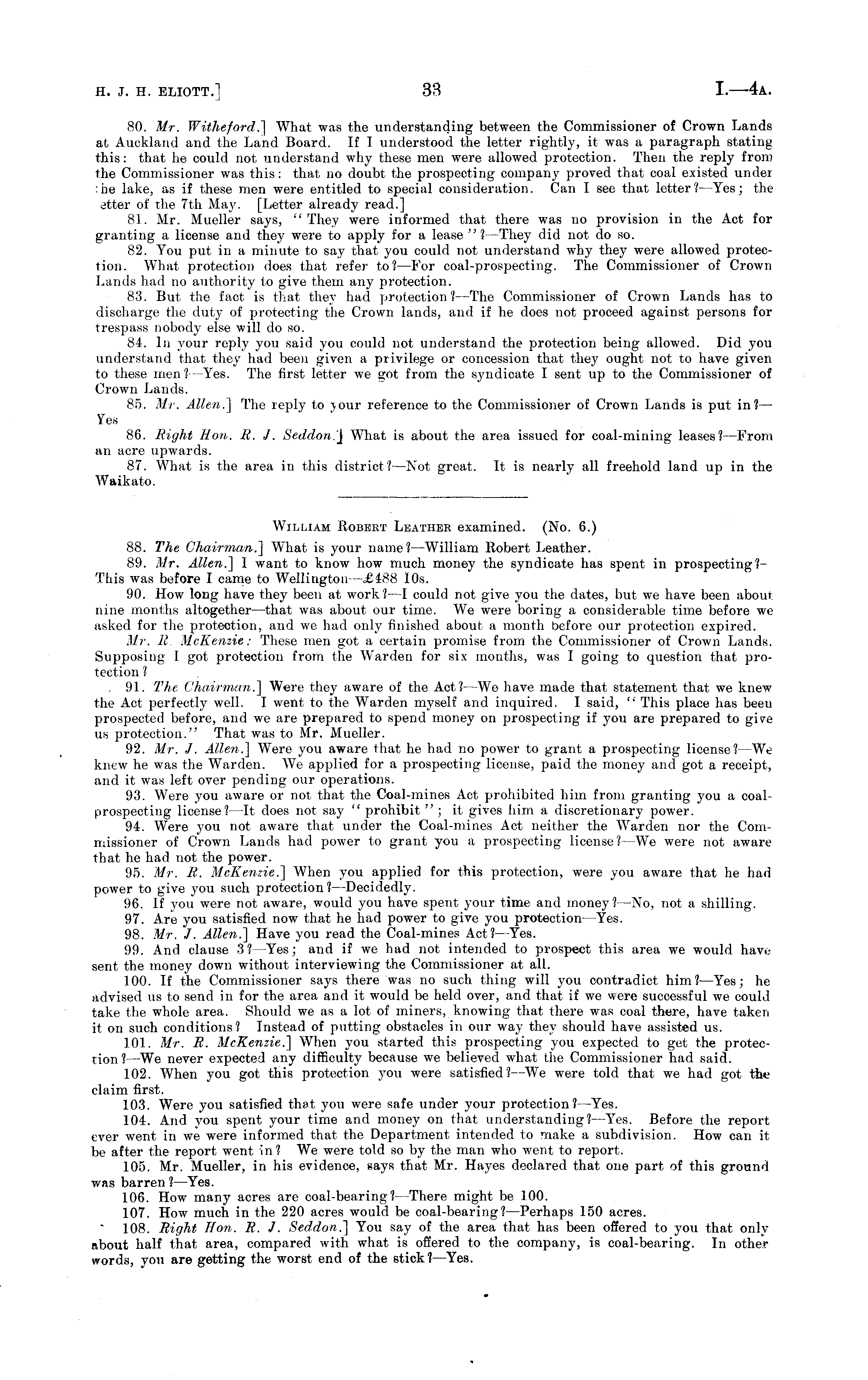 80. Mr. Witheford .] What was the understanding between the Commissioner of Crown Lands at Auckland and the Land Board. If I understood the letter rightly, it was a paragraph stating this: that he could not understand why these men were allowed protection. Then the reply from the Commissioner was this: that no doubt the prospecting company proved that coal existed under :he lake, as if these men were entitled to special consideration. Can I see that letter? —Yes; the stter of the 7th Ma)'. [Letter already read.] 81. Mr. Mueller says, "They were informed that there was no provision in the Act for granting a license and they were to apply for a lease "1 —They did not do so. 82. You put in a minute to say that you could not understand why they were allowed protection. What protection does that refer to? —For coal-prospecting. The Commissioner of Crown Lands had no authority to give them any protection. 83. But the fact is that they had protection ?— The Commissioner of Crown Lands has to discharge the duty of protecting the Crown lands, and if he does not proceed against persons for trespass nobody else will do so. 84. In your reply you said you could not understand the protection being allowed. Did you understand that they had been given a privilege or concession that they ought not to have given to these men? -Yes. The first letter we got from the syndicate I sent up to the Commissioner of Crown Lands. 85. Mr. Allen.] The reply to \our reference to the Commissioner of Crown Lands is put in? — Yes 86. Eight Hon. It. J. Seddon.'j What is about the area issued for coal-mining leases? —From an acre upwards. 87. What is the area in this district? —Not great. It is nearly all freehold land up in the Waikato.