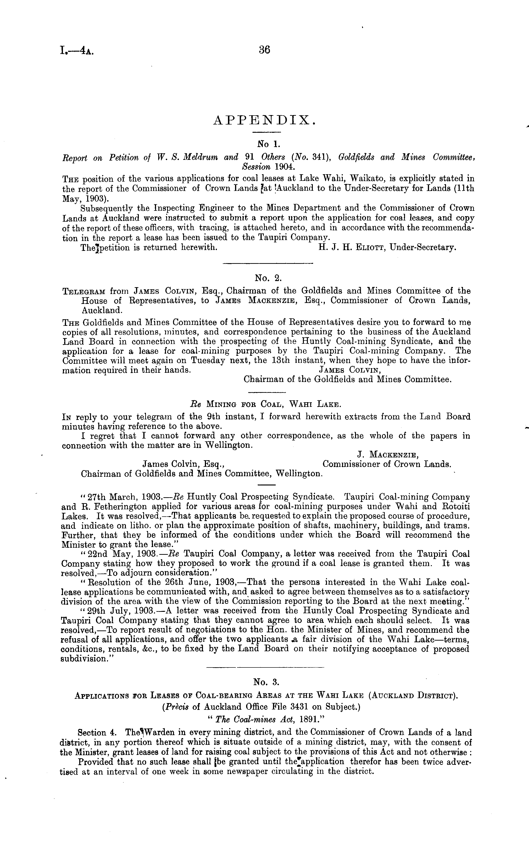 Bβ Mining fob Coal, Wahi Lake. In reply to your telegram of the 9th instant, I forward herewith extracts from the Land Board minutes having reference to the above. I regret that I cannot forward any other correspondence, as the whole of the papers in connection with the matter are in Wellington. J. Mackenzie, James Colvin, Esq., Commissioner of Crown Lands. Chairman of Goldfields and Mines Committee, Wellington.