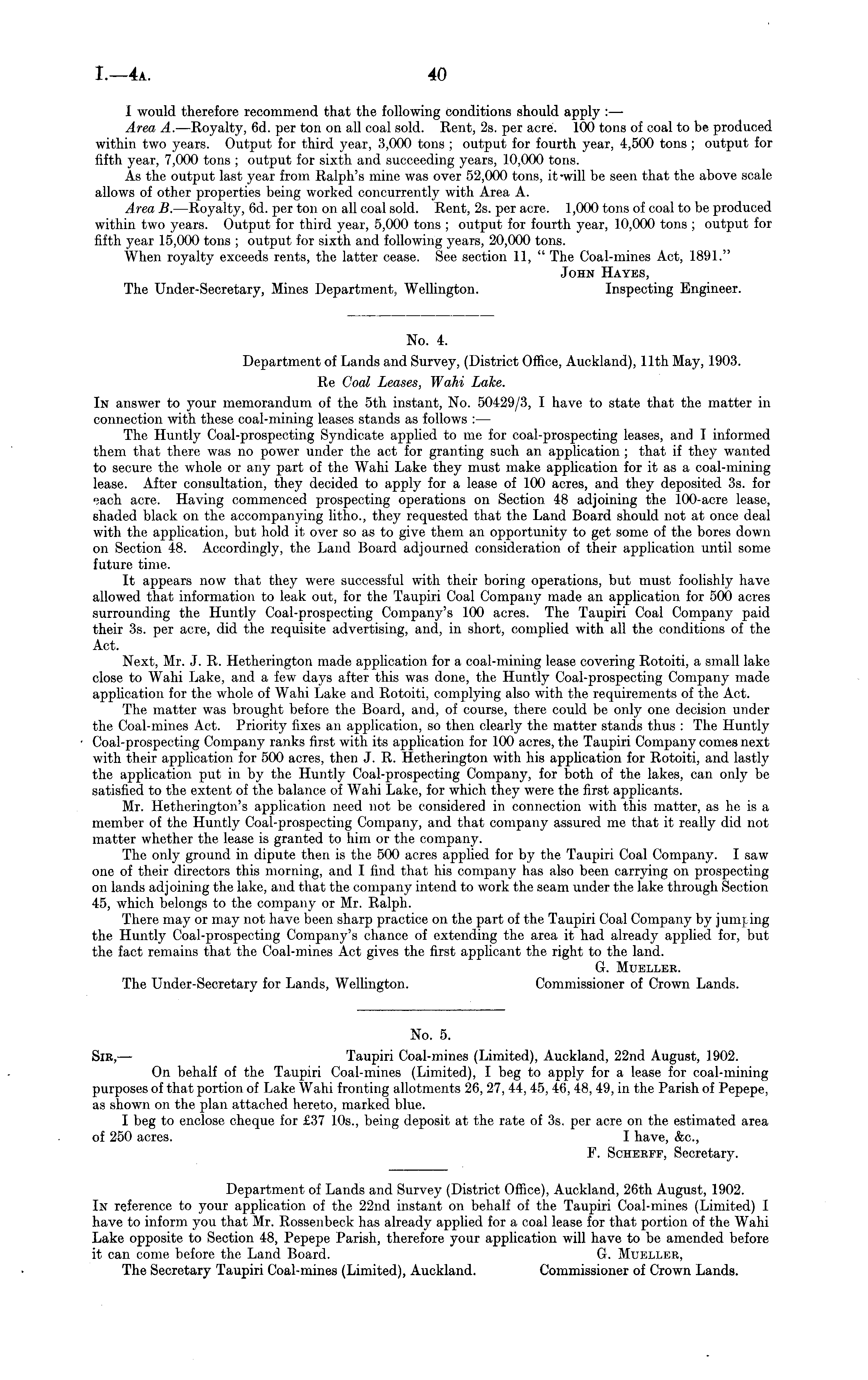 No. 5. Sir, — Taupiri Coal-mines (Limited), Auckland, 22nd August, 1902. On behalf of the Taupiri Coal-mines (Limited), I beg to apply for a lease for coal-mining purposes of that portion of Lake Wahi fronting allotments 26, 27, 44, 45, 46, 48, 49, in the Parish of Pepepe, as shown on the plan attached hereto, marked blue. I beg to enclose cheque for £37 10s., being deposit at the rate of 3s. per acre on the estimated area of 250 acres. I have, &c, F. Scherff, Secretary.
