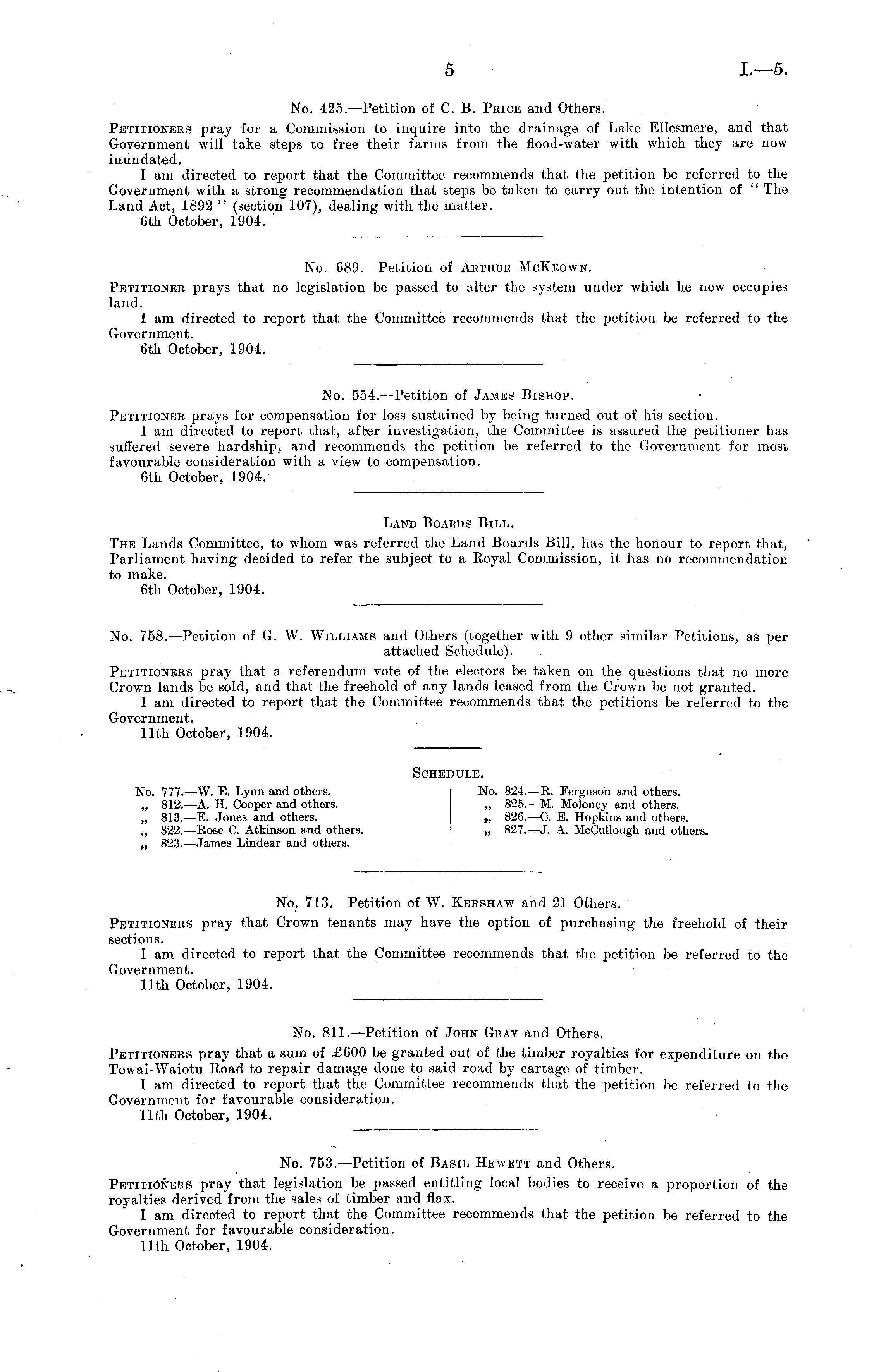 No. 713.—Petition of W. Kershaw and 21 Others. Petitioners pray that Crown tenants may have the option of purchasing the freehold of their sections. I am directed to report that the Committee recommends that the petition be referred to the Government. 11th October, 1904.
