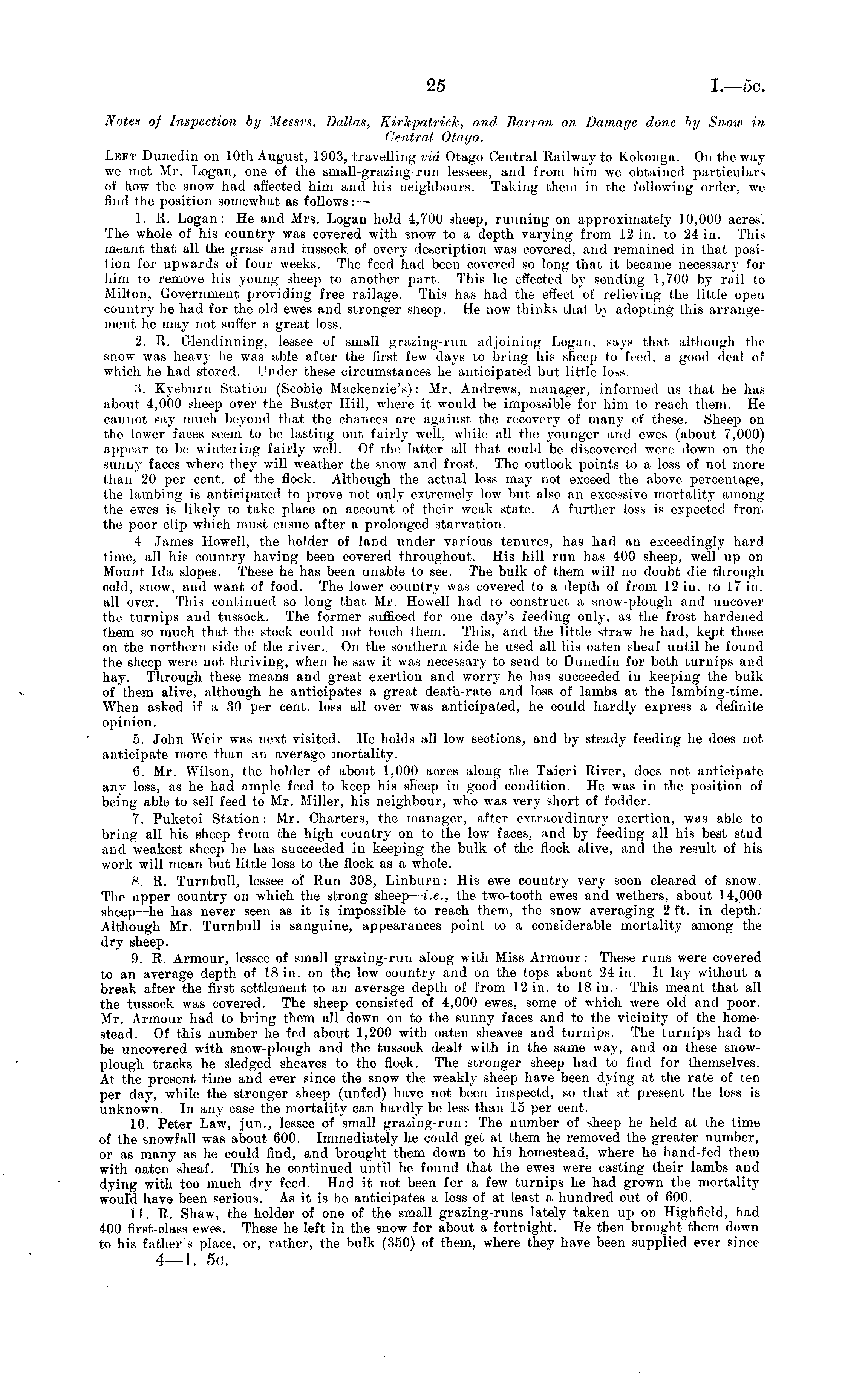 Notes of Inspection by Messrs. Dallas, Kirkpatrick, and Barton on Damage done by Snow in Central Otayo. Left Dunedin on 10th August, 1903, travelling via Otago Central Railway to Kokonga. On the way we met Mr. Logan, one of the small-grazing-run lessees, and from him we obtained particulars of how the snow had affected him and his neighbours. Taking them in the following order, we find the position somewhat as follows: — 1. R. Logan: He and Mrs. Logan hold 4,700 sheep, running on approximately 10,000 acres. The whole of his country was covered with snow to a depth varying from 12 in. to 24 in. This meant that all the grass and tussock of every description was covered, and remained in that position for upwards of four weeks. The feed had been covered so long that it became necessary for him to remove his young sheep to another part. This he effected by sending 1,700 by rail to Milton, Government providing free railage. This has had the effect of relieving the little open country he had for the old ewes and stronger sheep. He now thinks that by adopting this arrangement he may not suffer a great loss. 2. R. Glendinning, lessee of small grazing-run adjoining Logan, says that although the snow was heavy he was able after the first few days to bring liis sheep to feed, a good deal of which he had stored. Under these circumstances he anticipated but litile loss. ■'!. Kyeburn Station (Scobie Mackenzie's): Mr. Andrews, manager, informed us that he has about 4,000 sheep over the Buster Hill, where it would be impossible for him to reach them. He cannot say much beyond that the chances are against the recovery of many of these. Sheep on the lower faces seem to be lasting out fairly well, while all the younger and ewes (about 7,000) appear to be wintering fairly well. Of the latter all that could be discovered were down on the sunny faces where they will weather the snow and frost. The outlook points to a loss of not more than 20 per cent, of the flock. Although the actual loss may not exceed the above percentage, the lambing is anticipated to prove not only extremely low but also an excessive mortality among the ewes is likely to take place on account of their weak state. A further loss is expected from the poor clip which must ensue after a prolonged starvation. 4 James Howell, the holder of land under various tenures, has had an exceedingly hard time, all his country having been covered throughout. His hill run has 400 sheep, well up on Mount Ida slopes. These he has been unable to see. The bulk of them will no doubt die through cold, snow, and want of food. The lower country was covered to a depth of from 12 in. to 17 in. all over. This continued so long that Mr. Howell had to construct a snow-plough and uncover tho turnips and tussock. The former sufficed for one day's feeding onty, as the frost hardened them so much that the stock could not touch them. This, and the little straw he had, kept those on the northern side of the river. On the southern side he used all his oaten sheaf until he found the sheep were not thriving, when he saw it was necessary to send to Dunedin for both turnips and hay. Through these means and great exertion and worry he has succeeded in keeping the bulk of them alive, although he anticipates a great death-rate and loss of lambs at the lambing-time. When asked if a 30 per cent, loss all over was anticipated, he could hardly express a definite opinion. 5. John Weir was next visited. He holds all low sections, and by steady feeding he does not anticipate more than an average mortality. 6. Mr. Wilson, the holder of about 1,000 acres along the Taieri River, does not anticipate any loss, as he had ample feed to keep his sKeep in good condition. He was in the position of being able to sell feed to Mr. Miller, his neighbour, who was very short of fodder. 7. Puketoi Station: Mr. Charters, the manager, after extraordinary exertion, was able to bring all his sheep from the high country on to the low faces, and by feeding all his best stud and weakest sheep he has succeeded in keeping the bulk of the flock alive, and the result of his work will mean but little loss to the flock as a whole. H. R. Turnbull, lessee of Run 308, Linburn: His ewe country very soon cleared of snow. The tipper country on which the strong sheep — i.e., the two-tooth ewes and wethers, about 14,000 sheep —he has never seen as it is impossible to reach them, the snow averaging 2 ft. in depth. Although Mr. Turnbull is sanguine, appearances point to a considerable mortality among the dry sheep. 9. R. Armour, lessee of small grazing-run along with Miss Armour: These runs were covered to an average depth of 18 in. on the low country and on the tops about 24 in. It lay without a break after the first settlement to an average depth of from 12 in. to 18 in. This meant that all the tussock was covered. The sheep consisted of 4,000 ewes, some of which were old and poor. Mr. Armour had to bring them all down on to the sunny faces and to the vicinity of the homestead. Of this number he fed about 1,200 with oaten sheaves and turnips. The turnips had to be uncovered with snow-plough and the tussock dealt with in the same way, and on these snowplough tracks he sledged sheaves to the flock. The stronger sheep had to find for themselves. At the present time and ever since the snow the weakly sheep have been dying at the rate of ten per day, while the stronger sheep (unfed) have not been inspectd, so that at present the loss is unknown. In any case the mortality can hardly be less than 15 per cent. 10. Peter Law, jun., lessee of small grazing-run: The number of sheep he held at the time of the snowfall was about 600. Immediately he could get at them he removed the greater number, or as many as he could find, and brought them down to his homestead, where he hand-fed them with oaten sheaf. This he continued until he found that the ewes were casting their lambs and dying with too much dry feed. Had it not been for a f