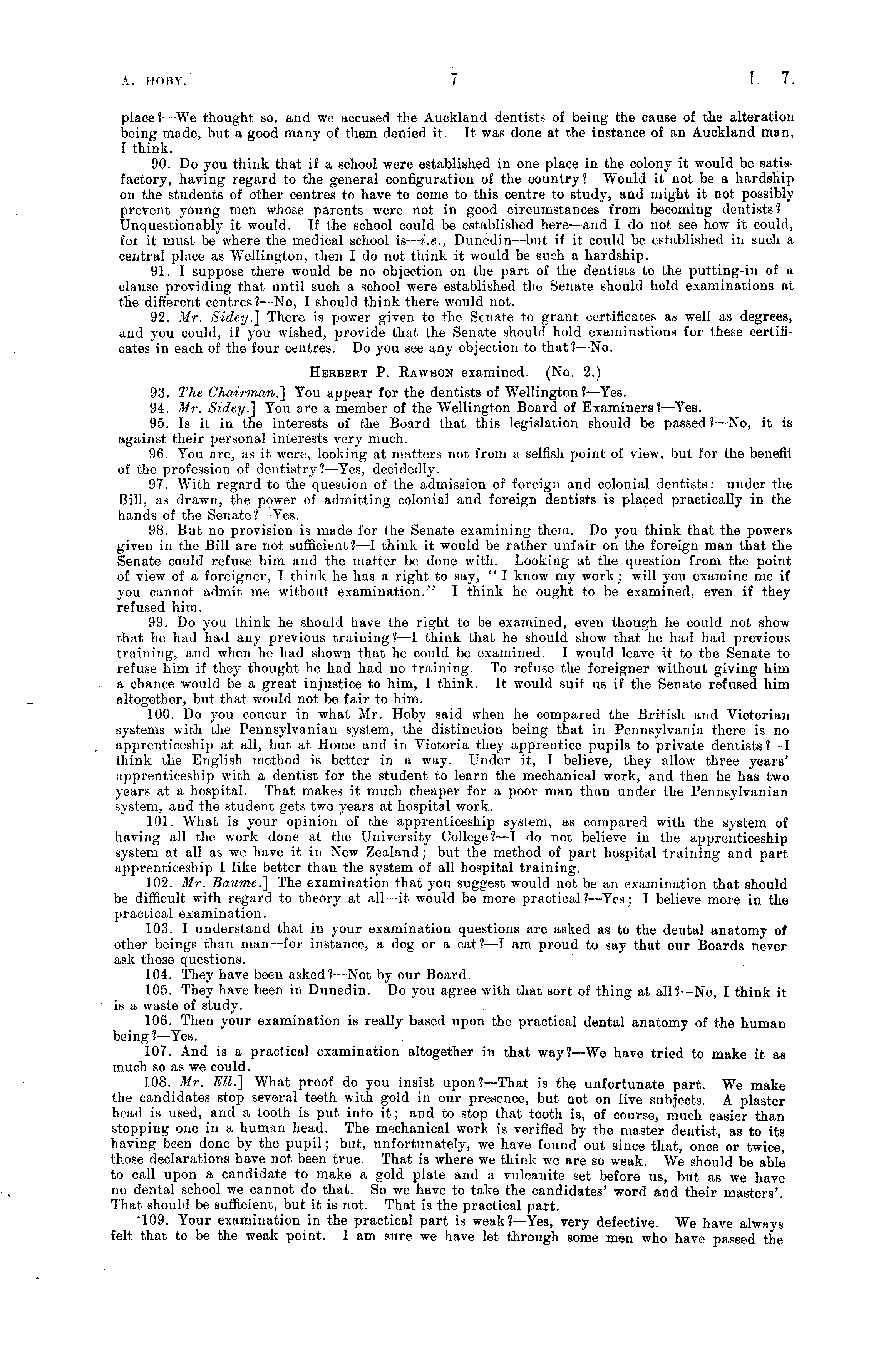 place?—We thought so, and we accused the Auckland dentists of being the cause of the alteration being made, but a good many of them denied it. It was clone at the instance of an Auckland man, I think. 90. Do you think that if a school were established in one place in the colony it would be satisfactory, having regard to the general configuration of the country ? Would it not be a hardship on the students of other centres to have to come to this centre to study, and might it not possibly prevent young men whose parents were not in good circumstances from becoming dentists ?—- Unquestionably it would. If the school could be established here —and Ido not see how it could, for it must be where the medical school is— i.e., Dunedin —but if it could be established in such a central place as Wellington, then I do not think it would be such a hardship. 91. I suppose there would be no objection on the part of the dentists to the putting-in of a clause providing that until such a school were established the Senate should hold examinations at the different centres? —No, I should think there would not. 92. Mr. Sidey.] There is power given to the Senate to grant certificates as well as degrees, and you could, if you wished, provide that the Senate should hold examinations for these certificates in each of the four centres. Do you see any objection to that?— No. Herbert P. Rawson examined. (No. 2.) 93. The Chairman.] You appear for the dentists of Wellington? —Yes. 94. Mr. Sidey.] You are a member of the Wellington Board of Examiners? —Yes. 95. Is it in the interests of the Board that this legislation should be passed?—No, it is against their personal interests very much. 96. You are, as it were, looking at matters not from a selfish point of view, but for the benefit of the profession of dentistry? —Yes, decidedly. 97. With regard to the question of the admission of foreign and colonial dentists: under the Bill, as drawn, the power of admitting colonial and foreign dentists is placed practically in the hands of the Senate? —Yes. 98. But no provision is made for the Senate examining them. Do you think that the powers given in the Bill are not sufficient? —I think it would be rather unfair on the foreign man that the Senate could refuse him and the matter be done with. Looking at the question from the point of view of a foreigner, I think he has a right to say, " I know my work; will you examine me if you cannot admit me without examination." I think he ought to be examined, even if they refused him. 99. Do you think he should have the right to be examined, even though he could not show that he had had any previous training? —I think that he should show that he had had previous training, and when he had shown that he could be examined. I would leave it to the Senate to refuse him if they thought he had had no training. To refuse the foreigner without giving him a chance would be a great injustice to him, I think. It would suit us if the Senate refused him altogether, but that would not be fair to him. 100. Do you concur in what Mr. Hoby said when he compared the British and Victorian systems with the Pennsylvanian system, the distinction being that in Pennsylvania there is no apprenticeship at all, but at Home and in Victoria they apprentice pupils to private dentists? —I think the English method is better in a way. Under it, I believe, they allow three years' apprenticeship with a dentist for the student to learn the mechanical work, and then he has two years at a hospital. That makes it much cheaper for a poor man than under the Pennsylvanian system, and the student gets two years at hospital work. 101. What is your opinion of the apprenticeship system, as compared with the system of having all the work done at the University College? —I do not believe in the apprenticeship system at all as we have it in New Zealand; but the method of part hospital training and part apprenticeship I like better than the system of all hospital training. 102. Mr. Baume.] The examination that you suggest would not be an examination that should be difficult with regard to theory at all —it would be more practical ? —Yes; I believe more in the practical examination. 103. I understand that in your examination questions are asked as to the dental anatomy of other beings than man —for instance, a dog or a cat? —I am proud to say that our Boards never ask those questions. 104. They have been asked? —Not by our Board. 105. They have been in Dunedin. Do you agree with that sort of thing at all? —No, I think it is a waste of study. 106. Then your examination is really based upon the practical dental anatomy of the human being? —Yes. 107. And is a practical examination altogether in that way?—We have tried to make it as much so as we could. 108. Mr. Ell.] What proof do you insist upon?— That is the unfortunate part. We make the candidates stop several teeth with gold in our presence, but not on live subjects. A plaster head is used, and a tooth is put into it; and to stop that tooth is, of course, much easier than stopping one in a human head. The mechanical work is verified by the master dentist, as to its having been done by the pupil; but, unfortunately, we have found out since that, once or twice, those declarations have not been true. That is where we think we are so weak. We should be able to call upon a candidate to make a gold plate and a vulcanite set before us, but as we have no dental school we cannot do that. So we have to take the candidates' Trord and their masters'. That should be sufficient, but it is not. That is the practical part. ■109. Your examination in the practical part is weak? —Yes, very defective. We have always felt that to be the weak point. I am sure we have let through some men who have passed the