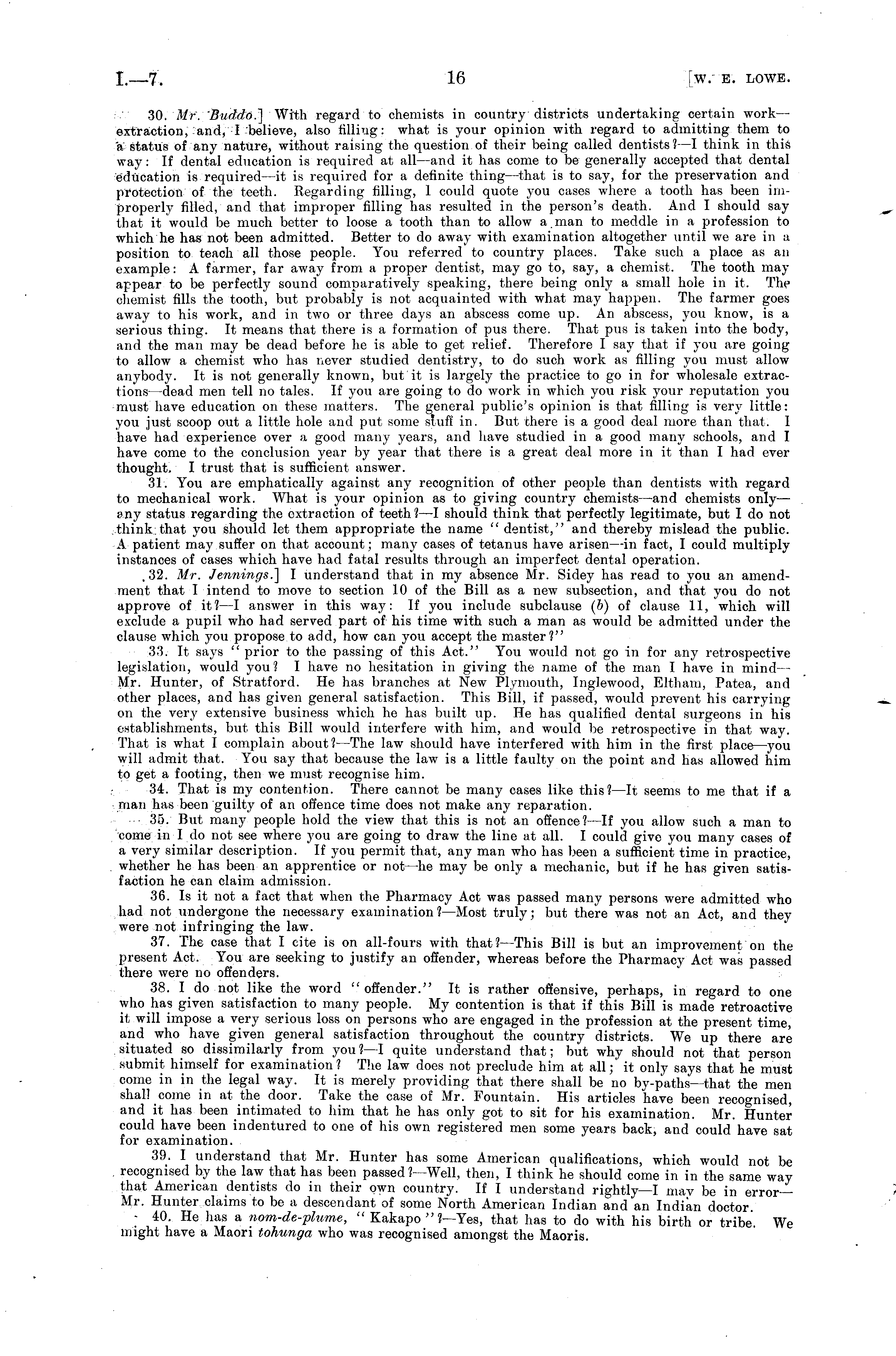 30. Mr. 'Buddo.] With regard to chemists in country districts undertaking certain workextraction, and, I believe, also filling: what is your opinion with regard to admitting them to a status of any nature, without raising the question of their being called dentists ? —I think in this way: If dental education is required at all —and it has come to be generally accepted that dental education is required —it is required for a definite thing —that is to say, for the preservation and protection of the teeth. Regarding filling, 1 could quote you cases where a tooth has been improperly filled, and that improper filling has resulted in the person's death. And I should say that it would be much better to loose a tooth than to allow a.man to meddle in a profession to which he has not been admitted. Better to do away with examination altogether until we are in a position to teach all those people. You referred to country places. Take such a place as an example: A farmer, far away from a proper dentist, may go to, say, a chemist. The tooth may appear to be perfectly sound comparatively speaking, there being only a small hole in it. The chemist fills the tooth, but probably is not acquainted with what may happen. The farmer goes away to his work, and in two or three days an abscess come up. An abscess, you know, is a serious thing. It means that there is a formation of pus there. That pus is taken into the body, and the man may be dead before he is able to get relief. Therefore I say that if you are going to allow a chemist who has never studied dentistry, to do such work as filling you must allow anybody. It is not generally known, but it is largely the practice to go in for wholesale extractions —dead men tell no tales. If you are going to do work in which you risk your reputation you must have education on those matters. The general public's opinion is that filling is very little: you just scoop out a little hole and put some stuff in. But there is a good deal more than that. I have had experience over a good many years, and have studied in a good many schools, and I have come to the conclusion year by year that there is a great deal more in it than I had ever thought. I trust that is sufficient answer. 31. You are emphatically against any recognition of other people than dentists with regard to mechanical work. What is your opinion as to giving country chemists —and chemists only — any status regarding the extraction of teeth? —I should think that perfectly legitimate, but Ido not think:that you should let them appropriate the name " dentist," and thereby mislead the public. A patient may suffer on that account; many cases of tetanus have arisen—in fact, I could multiply instances of cases which have had fatal results through an imperfect dental operation. .32. Mr. Jennings.] I understand that in my absence Mr. Sidey has read to you an amendment that I intend to move to section 10 of the Bill as a new subsection, and that you do not approve of it? —I answer in this way: If you include subclause (6) of clause 11, which will exclude a pupil who had served part of his time with such a man as would be admitted under the clause which you propose to add, how can you accept the master?" 33. It says prior to the passing of this Act." You would not go in for any retrospective legislation, would you? I have no hesitation in giving the name of the man I have in mmd — Mr. Hunter, of Stratford. He has branches at New Plymouth, Inglewood, Eltham, Patea, and other places, and has given general satisfaction. This Bill, if passed, would prevent his carrying on the very extensive business which he has built up. He has qualified dental surgeons in his establishments, but this Bill would interfere with him, and would be retrospective in that way. That is what I complain about? —The law should have interfered with him in the first place—you will admit that. You say that because the law is a little faulty on the point and has allowed him to get a footing, then we must recognise him. 34. That is my contention. There cannot be many cases like this? —It seems to me that if a man has been guilty of an offence time does not make any reparation. ■ 35. But many people hold the view that this is not an offence? —If you allow such a man to come in Ido not see where you are going to draw the line at all. I could give you many cases of a very similar description. If you permit that, any man who has been a sufficient time in practice, whether he has been an apprentice or not —he may be only a mechanic, but if he has given satisfaction he can claim admission. 36. Is it not a fact that when the Pharmacy Act was passed many persons were admitted who had not undergone the necessary examination ?—Most truly; but there was not an Act, and they were not infringing the law. 37. The case that I cite is on all-fours with that?— This Bill is but an improvement on the present Act. You are seeking to justify an offender, whereas before the Pharmacy Act was passed there were no offenders. 38. I do not like the word "offender." It is rather offensive, perhaps, in regard to one who has given satisfaction to many people. My contention is that if this Bill is made retroactive it will impose a very -serious loss on persons who are engaged in the profession at the present time, and who have given general satisfaction throughout the country districts. We up there are situated so dissimilarly from you ?—I quite understand that; but why should not that person submit himself for examination ? The law does not preclude him at all; it only says that he must come in in the legal way. It is merely providing that there shall be no by-paths—that the men shall come in at the door. Take the case of Mr. Fountain. His articles have been recognised, and it has been intimated to him that he has only got to sit for his examination, Mr. Hunter could have been indentured to one of his own registered men some years back, and co