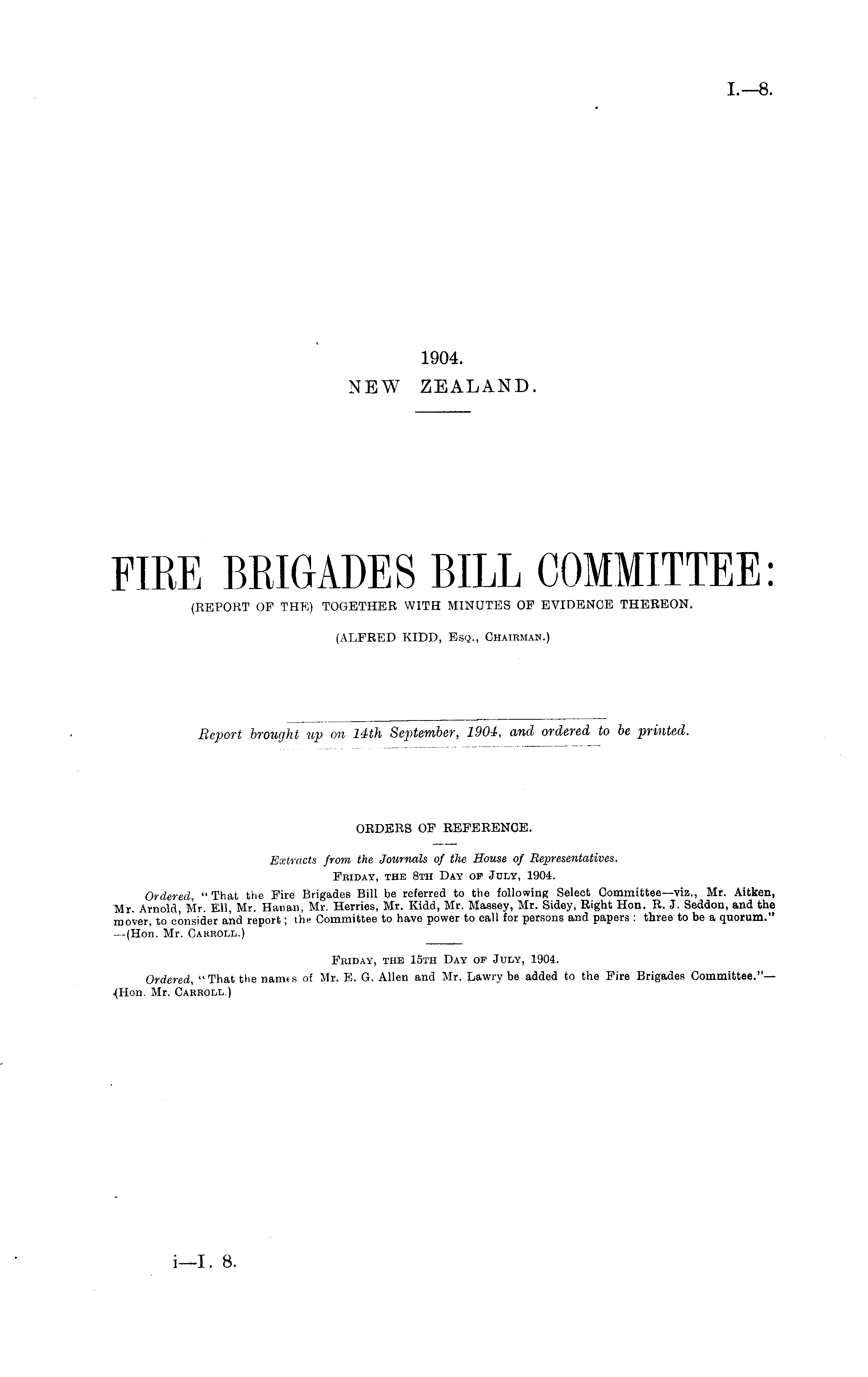 ORDERS OF REFERENCE. Extracts from the Journals of the House of Representatives. Friday, the Bth Day op July, 1904. Ordered "That the Fire Brigades Bill be referred to the following Select Committee—viz., Mr. Aitken, Mr. Arnold, Mr. Ell, Mr. Hanan, Mr. Hemes, Mr. Kidd, Mr. Maasey, Mr. Sidey, Right Hon. R. J. Seddon, and the mover, to consider and report; the Committee to have power to call for persons and papers : three to be a quorum." —(Hon. Mr. Cakroll.) Friday, the 15th Day op July, 1904. Ordered, "That the names of Mr. E. G. Allen and Mr. Lawry be added to the Fire Brigades Committee."— .(Hon. Mr. Carroll.)