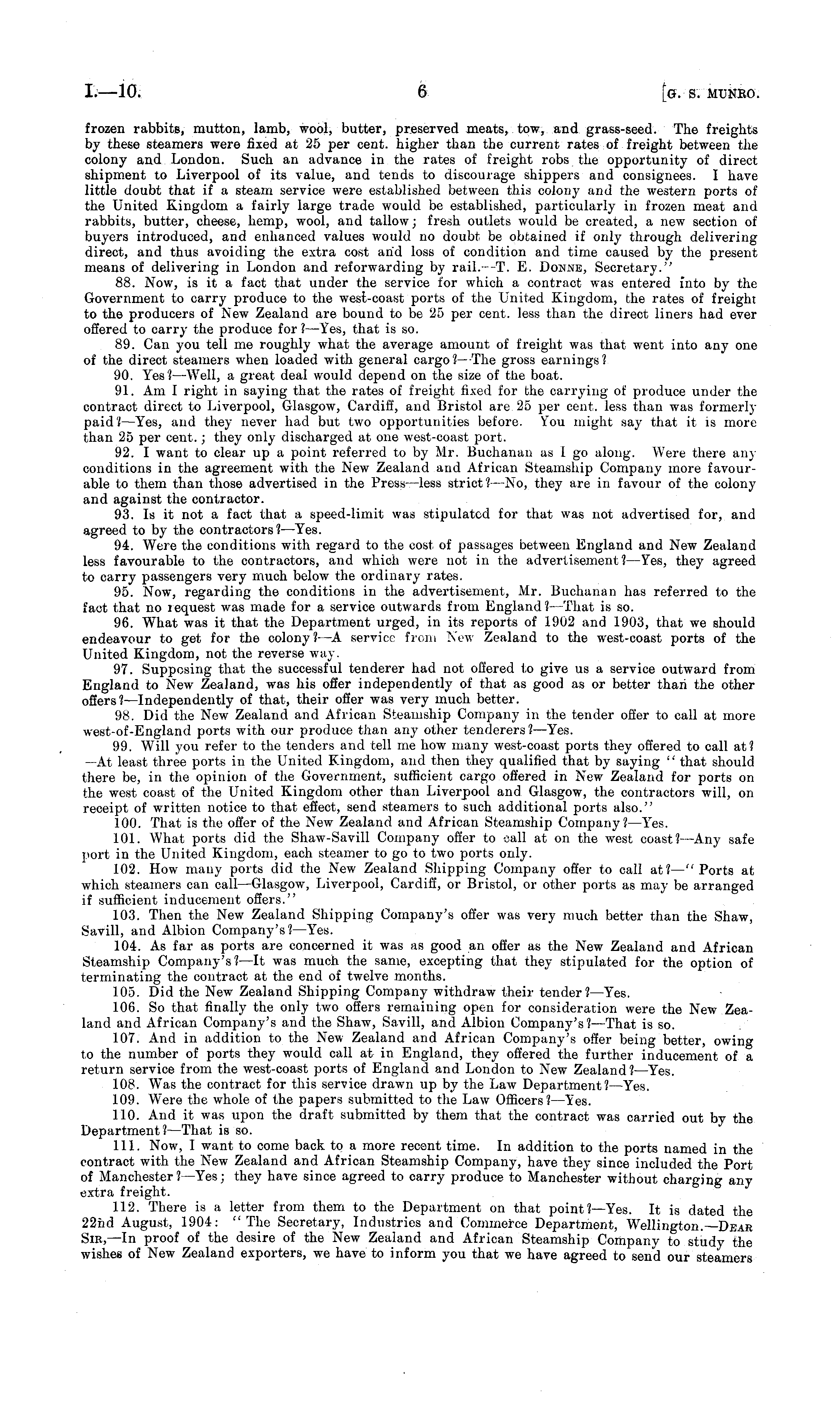 frozen rabbits, mutton, lamb, wool, butter, preserved meats, tow, and grass-seed. The freights by these steamers were fixed at 25 per cent, higher than the current rates of freight between the colony and London. Such an advance in the rates of freight robs the opportunity of direct shipment to Liverpool of its value, and tends to discourage shippers and consignees. I have little doubt that if a steam service were established between this colony and the western ports of the United Kingdom a fairly large trade would be established, particularly in frozen meat and rabbits, butter, cheese, hemp, wool, and tallow; fresh outlets would be created, a new section of buyers introduced, and enhanced values would no doubt be obtained if only through delivering direct, and thus avoiding the extra cost arid loss of condition and time caused by the present means of delivering in London and reforwarding by rail.--T. E. Donne, Secretary." 88. Now, is it a fact that under the service for which a contract was entered Into by the Government to carry produce to the west-coast ports of the United Kingdom, the rates of freight to the producers of New Zealand are bound to be 25 per cent, less than the direct liners had ever offered to carry the produce for ? —Yes, that is so. 89. Can you tell me roughly what the average amount of freight was that went into any one of the direct steamers when loaded with general cargo? —The gross earnings? 90. Yes? —Well, a great deal would depend on the size of the boat. 91. Am I right in saying that the rates of freight fixed for the carrying of produce under the contract direct to Liverpool, Glasgow, Cardiff, and Bristol are 25 per cent, less than was formerly paid? —Yes, and they never had but two opportunities before. You might say that it is more than 25 per cent.; they only discharged at one west-coast port. 92. I want to clear up a point referred to by Mr. Buchanan as Igo along. Were there an) conditions in the agreement with the New Zealand and African Steamship Company more favourable to them than those advertised in the Press —less strict ? —No, they are in favour of the colony and against the contractor. 93. Is it not a fact that a speed-limit was stipulated for that was not advertised for, and agreed to by the contractors? —Yes. 94. Were the conditions with regard to the cost of passages between England and New Zealand less favourable to the contractors, and which were not in the advertisement? —Yes, they agreed to carry passengers very much below the ordinary rates. 95. Now, regarding the conditions in the advertisement, Mr. Buchanan has referred to the fact that no request was made for a service outwards from England? —That is so. 96. What was it that the Department urged, in its reports of 1902 and 1903, that we should endeavour to get for the colony? —A service from New Zealand to the west-coast ports of the United Kingdom, not the reverse way. 97. Supposing that the successful tenderer had not offered to give us a service outward from England to New Zealand, was his offer independently of that as good as or better than the other offers? —Independently of that, their offer was very much better. 98. Did the New Zealand and African Steamship Company in the tender offer to call at more west-of-England ports with our produce than any other tenderers? —Yes. 99. Will you refer to the tenders and tell me how many west-coast ports they offered to call at? —At least three ports in the United Kingdom, and then they qualified that by saying " that should there be, in the opinion of the Government, sufficient cargo offered in New Zealand for ports on the west coast of the United Kingdom other than Liverpool and Glasgow, the contractors will, on receipt of written notice to that effect, send steamers to such additional ports also." 100. That is the offer of the New Zealand and African Steamship Company? —Yes. 101. What ports did the Shaw-Savill Company offer to call at on the west coast? —Any safe port in the United Kingdom, each steamer to go to two ports only. 102. How many ports did the New Zealand Shipping Company offer to call at? —"Ports at which steamers can call —Glasgow, Liverpool, Cardiff, or Bristol, or other ports as may be arranged if sufficient inducement offers." 103. Then the New Zealand Shipping Company's offer was very much better than the Shaw, Savill, and Albion Company's? —Yes. 104. As far as ports are concerned it was as good an offer as the New Zealand and African Steamship Company's? —It was much the same, excepting that they stipulated for the option of terminating the contract at the end of twelve months. 105. Did the New Zealand Shipping Company withdraw their tender? —Yes. 106. So that finally the only two offers remaining open for consideration were the New Zealand and African Company's and the Shaw, Savill, and Albion Company's? —That is so. 107. And in addition to the New Zealand and African Company's offer being better, owin» to the number of ports they would call at in England, they offered the further inducement of a return service from the west-coast ports of England and London to New Zealand ? —Yes. 108. Was the contract for this service drawn up by the Law Department?— Yes. 109. Were the whole of the papers submitted to the Law Officers? —Yes. 110. And it was upon the draft submitted by them that the contract was carried out by the Department? —That is so. 111. Now, I want to come back to a more recent time. In addition to the ports named in the contract with the New Zealand and African Steamship Company, have they since included the Port of Manchester I— Yes; they have since agreed to carry produce to Manchester without charging any extra freight. 112. There is a letter from them to the Department on that point?— Yes. It is dated the 22hd August, 1904: "The Secretary, Industries and Commerce Department, Wellington. Dear Sir,—ln proof of the desire of the New Zealand and African Ste