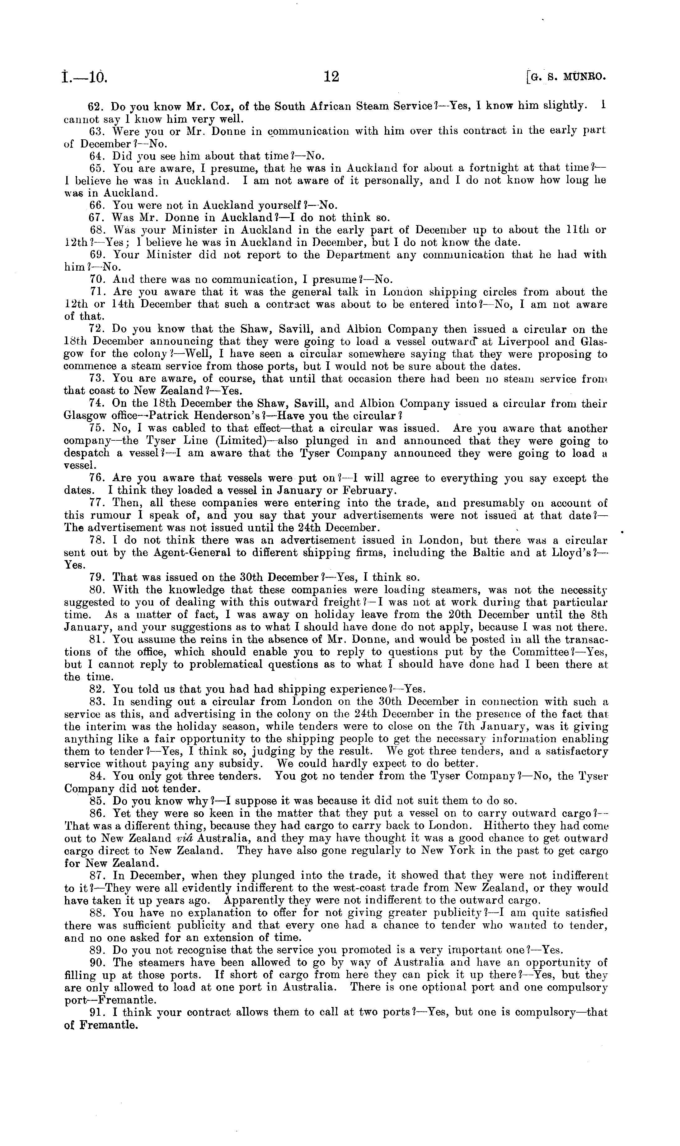 62. Do you know Mr. Cox, of the South African Steam Service ?•—Yes, I know him slightly. 1 cannot say 1 know him very well. 63. Were you or Mr. Donne in communication with him over this contract in the early part of December ? —No. 64. Did you see him about that time? —No. 65. You are aware, I presume, that he was in Auckland for about a fortnight at that time?- — 1 believe he was in Auckland. lam not aware of it personally, and Ido not know how long he was in Auckland. 66. You were not in Auckland yourself? —No. 67. Was Mr. Donne in Auckland? —I do not think so. 68. Was your Minister in Auckland in the early part of December up to about the 11th or 12th? —Yes; 1 believe he was in Auckland in December, but I do not know the date. 69. Your Minister did not report to the Department any communication that he had with him I— No. 70. And there was no communication, I presume? —No. 71. Are you aware that it was the general talk in London shipping circles from about the 12th or 14th December that such a contract was about to be entered into? —No, I am not aware of that. 72. Do you know that the Shaw, Savill, and Albion Company then issued a circular on the 18th December announcing that they were going to load a vessel outward* at Liverpool and Glasgow for the colony ? —Well, I have seen a circular somewhere saying that they were proposing to commence a steam service from those ports, but I would not be sure about the dates. 73. You are aware, of course, that until that occasion there had been no steam service from that coast to New Zealand ? —Yes. 74. On the 18th December the Shaw, Savill, and Albion Company issued a circular from their Glasgow office—Patrick Henderson's? —Have you the circular? 75. No, I was cabled to that effect —that a circular was issued. Are you aware that another company —the Tyser Line (Limited) —also plunged in and announced that they were going to despatch a vessel? —I am aware that the Tyser Company announced they were going to load a vessel. 76. Are you aware that vessels were put on ? —I will agree to everything you say except the dates. I think they loaded a vessel in January or February. 77. Then, all these companies were entering into the trade, and presumably on account of this rumour I speak of, and you say that your advertisements were not issued at that date? — The advertisement was not issued until the 24th December. 78. I do not think there was an advertisement issued in London, but there was a circular sent out by the Agent-General to different shipping firms, including the Baltic and at Lloyd's ? — Yes. 79. That was issued on the 30th December? —Yes, I think so. 80. With the knowledge that these companies were loading steamers, was not the necessity suggested to you of dealing with this outward freight?—l was not at work during that particular time. As a matter of fact, I was away on holiday leave from the 20th December until the Bth January, and your suggestions as to what I should have done do not apply, because 1 was not there. 81. You assume the reins in the absence of Mr. Donne, and would be posted in all the transactions of the office, which should enable you to reply to questions put by the Committee? —Yes, but 1 cannot reply to problematical questions as to what I should have done had I been there at the time. 82. You told us that you had had shipping experience? —Yes. 83. In sending out a circular from London on the 30th December in connection with such a service as this, and advertising in the colony on the 24th December in the presence of the fact that the interim was the holiday season, while tenders were to close on the 7th January, was it giving anything like a fair opportunity to the shipping people to get the necessary information enabling them to tender? —Yes, I think so, judging by the result. We got three tenders, and a satisfactory service without paying any subsidy. We could hardly expect to do better. 84. You only got three tenders. You got no tender from the Tyser Company ? —No, the Tyser Company did not tender. 85. Do you know why? —I suppose it was because it did not suit them to do so. 86. Yet they were so keen in the matter that they put a vessel on to carry outward cargo ?-- That was a different thing, because they had cargo to carry back to London. Hitherto they had come out to New Zealand via Australia, and they may have thought it was a good chance to get outward cargo direct to New Zealand. They have also gone regularly to New York in the past to get cargo for New Zealand. 87. In December, when they plunged into the trade, it showed that they were not indifferent to it? —They were all evidently indifferent to the west-coast trade from New Zealand, or they would have taken it up years ago. Apparently they were not indifferent to the outward cargo. 88. You have no explanation to offer for not giving greater publicity? —I am quite satisfied there was sufficient publicity and that every one had a chance to tender who wanted to tender, and no one asked for an extension of time. 89. Do you not recognise that the service you promoted is a very important one? —Yes. 90. The steamers have been allowed to go by way of Australia and have an opportunity of filling up at those ports. If short of cargo from here they can pick it up there? —Yes, but they are only allowed to load at one port in Australia. There is one optional port and one compulsory port —Fremantle. 91. I think your contract allows them to call at two ports? —Yes, but one is compulsory —that of Fremantle.