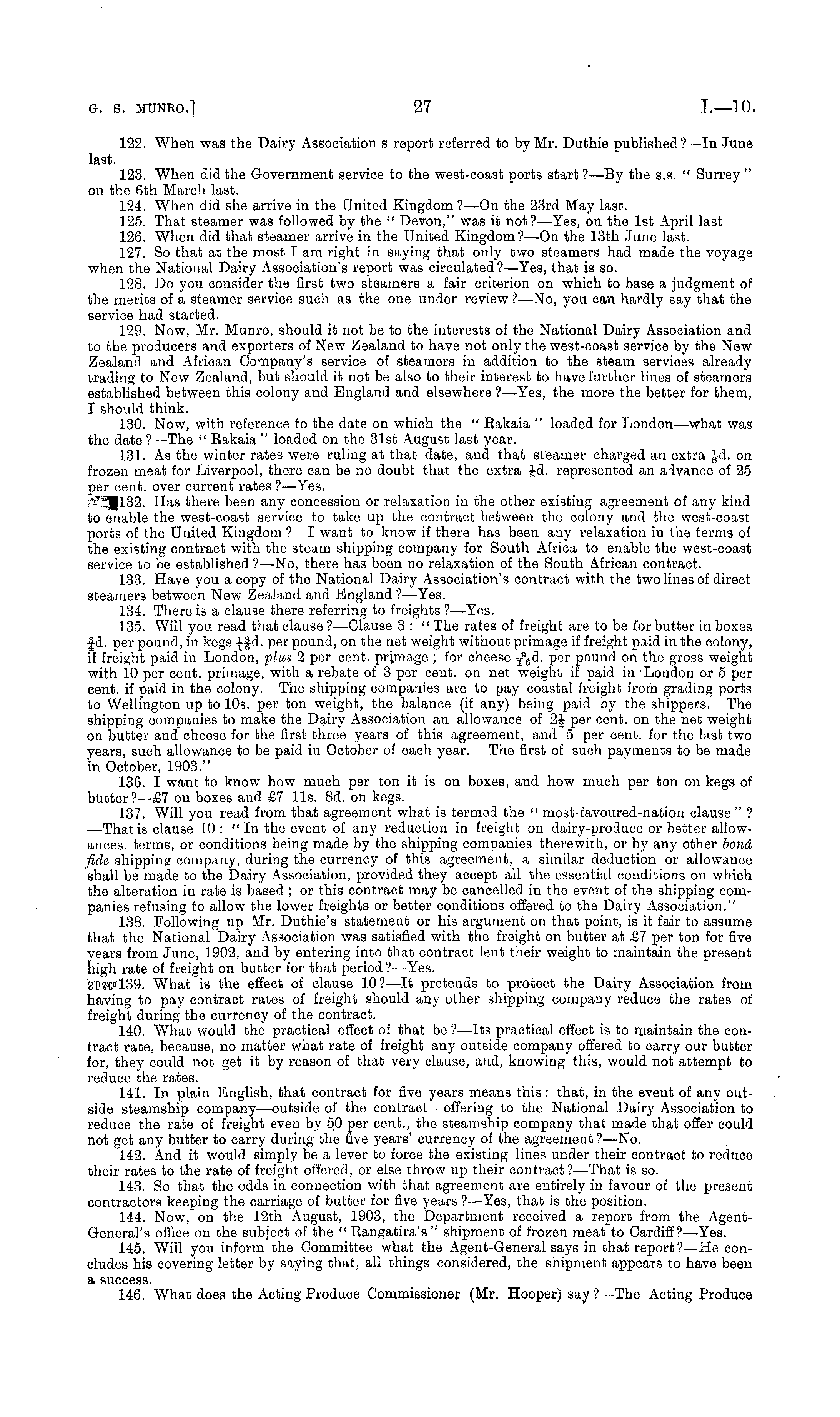 122. When was the Dairy Association s report referred to by Mr. Duthie published?—ln June last. 123. When did the Government service to the west-coast ports start ?—By the s.s. " Surrey " on the 6th March last. 124. When did she arrive in the United Kingdom ?—On the 23rd May last. 125. That steamer was followed by the " Devon," was it not?— Yes, on the Ist April last. 126. When did that steamer arrive in the United Kingdom?—-On the 13th June last. 127. So that at the most I am right in saying that only two steamers had made the voyage when the National Dairy Association's report was circulated?— Yes, that is so. 128. Do you consider the first two steamers a fair criterion on which to base a judgment of the merits of a steamer service such as the one under review ?—No, you can hardly say that the service had started. 129. Now, Mr. Munro, should it not be to the interests of the National Dairy Association and to the producers and exporters of New Zealand to have not only the west-coast service by the New Zealand and African Company's service of steamers in addition to the steam services already trading to New Zealand, but should it not be also to their interest to have further lines of steamers established between this colony and England and elsewhere ?—Yes, the more the better for them, I should think. 130. Now, with reference to the date on which the " Rakaia " loaded for London—-what was the date?— The "Rakaia" loaded on the 31st August last year. 131. As the winter rates were ruling at that date, and that steamer charged an extra Jd. on frozen meat for Liverpool, there can be no doubt that the extra Jd. represented an advance of 25 per cent, over current rates ? —Yes. • ,,r '"3132. Has there been any concession or relaxation in the other existing agreement of any kind to enable the west-coast service to take up the contract between the colony and the west-coast ports of the United Kingdom ? I want to know if there has been any relaxation in the terms of the existing contract with the steam shipping company for South Africa to enable the west-coast service to be established?—No, there has been no relaxation of the South African contract. 133. Have you a copy of the National Dairy Association's contract with the two lines of direct steamers between New Zealand and England ?—Yes. 134. There is a clause there referring to freights ?—Yes. 135. Will you read that clause ?—Clause 3 : " The rates of freight are to be for butter in boxes fd. per pound, in kegs per pound, on the net weight without primage if freight paid in the colony, if freight paid in London, plus 2 per cent, prunage ; for cheese T 9 ff d. per pound on the gross weight with 10 per cent, primage, with a rebate of 3 per cent, on net weight if paid in London or 5 per cent, if paid in the colony. The shipping companies are to pay coastal freight from grading ports to Wellington up to 10s. per ton weight, the balance (if any) being paid by the shippers. The shipping companies to make the Dairy Association an allowance of 2J per cent, on the net weight on butter and cheese for the first three years of this agreement, and 5 per cent, for the last two years, such allowance to be paid in October of each year. The first of such payments to be made in October, 1903." 136. I want to know how much per ton it is on boxes, and how much per ton on kegs of butter? —£7 on boxes and £7 lis. Bd. on kegs. 137. Will you read from that agreement what is termed the " most-favoured-nation clause" ? —-Thatis clause 10 : "In the event of any reduction in freight on dairy-produce or better allowances, terms, or conditions being made by the shipping companies therewith, or by any other bond fide shipping company, during the currency of this agreement, a similar deduction or allowance shall be made to the Dairy Association, provided they accept all the essential conditions on which the alteration in rate is based ; or this contract may be cancelled in the event of the shipping companies refusing to allow the lower freights or better conditions offered to the Dairy Association." 138. Following up Mr. Duthie's statement or his argument on that point, is it fair to assume that the National Dairy Association was satisfied with the freight on butter at £7 per ton for five years from June, 1902, and by entering into that contract lent their weight to maintain the present high rate of freight on butter for that period ?—Yes. 2'8w139. What is the effect of clause 10?—-It pretends to protect the Dairy Association from having to pay contract rates of freight should any other shipping company reduce the rates of freight during the currency of the contract. 140. What would the practical effect of that be ?—lts practical effect is to maintain the contract rate, because, no matter what rate of freight any outside company offered to carry our butter for, they could not get it by reason of that very clause, and, knowing this, would not attempt to reduce the rates. 141. In plain English, that contract for five years means this : that, in the event of any outside steamship company—outside of the contract —offering to the National Dairy Association to reduce the rate of freight even by 50 per cent., the steamship company that made that offer could not get any butter to carry during the five years' currency of the agreement ?—No. 142. And it would simply be a lever to force the existing lines under their contract to reduce their rates to the rate of freight offered, or else throw up their contract ?—That is so. 143. So that the odds in connection with that agreement are entirely in favour of the present contractors keeping the carriage of butter for five years ? —Yes, that is the position. 144. Now, on the 12th August, 1903, the Department received a report from the AgentGeneral's office on the subject of the " Rangatira's " shipment of frozen meat to Cardiff?—-Yes. 145. Will you inform the Committee what the Agent-Gen