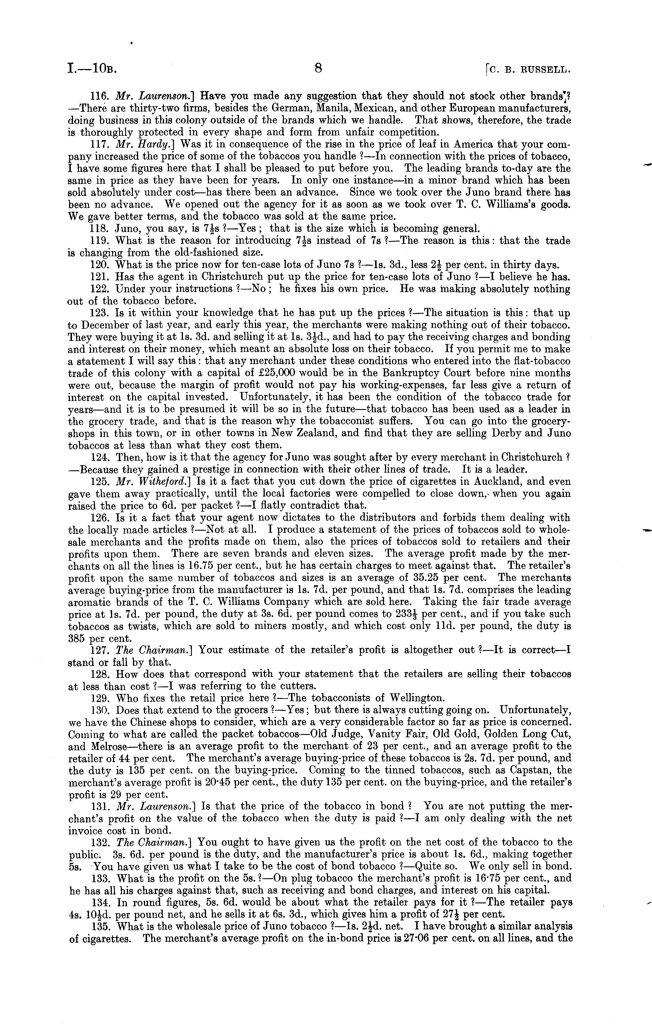 116. Mr. Laurenson.] Have you made any suggestion that they should not stock other brands"? —There are thirty-two firms, besides the German, Manila, Mexican, and other European manufacturers, doing business in this colony outside of the brands which we handle. That shows, therefore, the trade is thoroughly protected in every shape and form from unfair competition. 117. Mr. Hardy.] Was it in consequence of the rise in the price of leaf in America that your company increased the price of some of the tobaccos you handle ?—ln connection with the prices of tobacco, I have some figures here that I shall be pleased to put before you. The leading brands to-day are the same in price as they have been for years. In only one instance—in a minor brand which has been sold absolutely under cost —has there been an advance. Since we took over the Juno brand there has been no advance. We opened out the agency for it as soon as we took over T. C. Williams's goods. We gave better terms, and the tobacco was sold at the same price. 118. Juno, you say, is 7Js ? —Yes ; that is the size which is becoming general. 119. What is the reason for introducing 7|s instead of 7s ?—The reason is this: that the trade is changing from the old-fashioned size. 120. What is the price now for ten-case lots of Juno 7s ? —ls. 3d., less 2| per cent, in thirty days. 121. Has the agent in Christchurch put up the price for ten-case lots of Juno ? —I believe he has. 122. Under your instructions ?—No ;he fixes his own price. He was making absolutely nothing out of the tobacco before. 123. Is it within your knowledge that he has put up the prices ? —The situation is this: that up to December of last year, and early this year, the merchants were making nothing out of their tobacco. They were buying it at Is. 3d. and selling it at Is. 3|d., and had to pay the receiving charges and bonding and interest on their money, which meant an absolute loss on their tobacco. If you permit me to make a statement I will say this : that any merchant under these conditions who entered into the flat-tobacco trade of this colony with a capital of £25,000 would be in the Bankruptcy Court before nine months were out, because the margin of profit would not pay his working-expenses, far less give a return of interest on the capital invested. Unfortunately, it has been the condition of the tobacco trade for years —and it is to be presumed it will be so in the future—that tobacco has been used as a leader in the grocery trade, and that is the reason why the tobacconist suffers. You can go into the groceryshops in this town, or in other towns in New Zealand, and find that they are selling Derby and Juno tobaccos at less than what they cost them. 124. Then, how is it that the agency for Juno was sought after by every merchant in Christchurch ? —Because they gained a prestige in connection with their other lines of trade. It is a leader. 125. Mr. Witheford.] Is it a fact that you cut down the price of cigarettes in Auckland, and even gave them away practically, until the local factories were compelled to close down,- when you again raised the price to 6d. per packet ? —I flatly contradict that. 126. Is it a fact that your agent now dictates to the distributors and forbids them dealing with the locally made articles ? —Not at all. I produce a statement of the prices of tobaccos sold to wholesale merchants and the profits made on them, also the prices of tobaccos sold to retailers and their profits upon them. There are seven brands and eleven sizes. The average profit made by the merchants on all the lines is 16.75 per cent., but he has certain charges to meet against that. The retailer's profit upon the same number of tobaccos and sizes is an average of 35.25 per cent. The merchants average buying-price from the manufacturer is Is. 7d. per pound, and that Is. 7d. comprises the leading aromatic brands of the T. C. Williams Company which are sold here. Taking the fair trade average price at Is. 7d. per pound, the duty at 3s. 6d. per pound comes to 233J per cent., and if you take such tobaccos as twists, which are sold to miners mostly, and which cost only lid. per pound, the duty is 385 per cent. 127. The Chairman.] Your estimate of the retailer's profit is altogether out ? —lt is correct—l stand or fall by that. 128. How does that correspond with your statement that the retailers are selling their tobaccos at less than cost ?—I was referring to the cutters. 129. Who fixes the retail price here ?—The tobacconists of Wellington. 130. Does that extend to the grocers ?—Yes; but there is always cutting going on. Unfortunately, we have the Chinese shops to consider, which are a very considerable factor so far as price is concerned. Coming to what are called the packet tobaccos —Old Judge, Vanity Fair, Old Gold, Golden Long Cut, and Melrose —there is an average profit to the merchant of 23 per cent., and an average profit to the retailer of 44 per cent. The merchant's average buying-price of these tobaccos is 2s. 7d. per pound, and the duty is 135 per cent, on the buying-price. Coming to the tinned tobaccos, such as Capstan, the merchant's average profit is 2045 per cent., the duty 135 per cent, on the buying-price, and the retailer's profit is 29 per cent. 131. Mr. Laurenson.] Is that the price of the tobacco in bond ? You are not putting the merchant's profit on the value of the tobacco when the duty is paid ?—I am only dealing with the net invoice cost in bond. 132. The Chairman.] You ought to have given us the profit on the net cost of the tobacco to the public. 3s. 6d. per pound is the duty, and the manufacturer's price is about Is. 6d., making together ss. You have given us what I take to be the cost of bond tobacco ?—Quite so. We only sell in bond. 133. What is the profit on the ss.? —On plug tobacco the merchant's profit is 16-75 per cent., and he has all his charges against that, such as receiving and bond charges