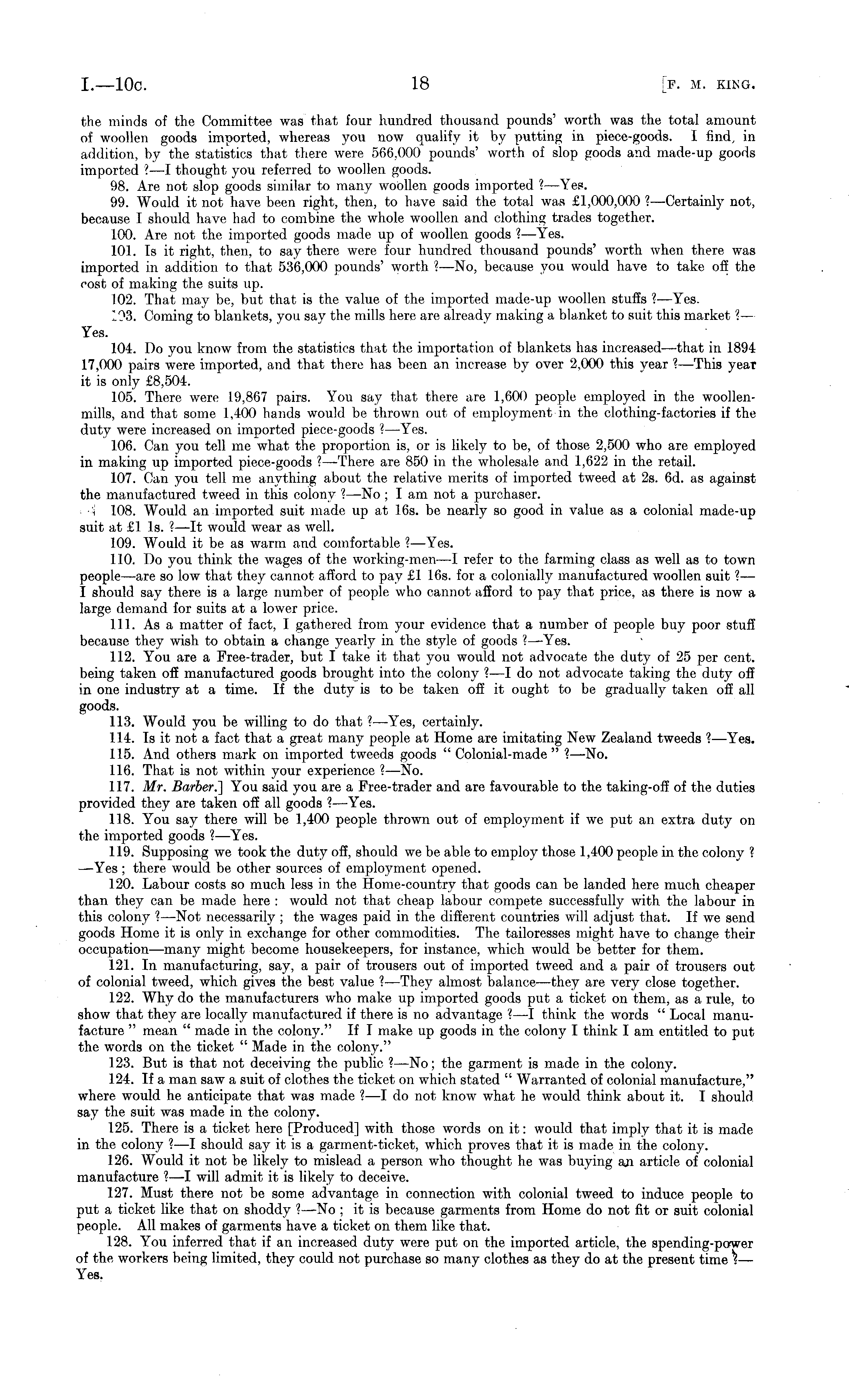 the minds of the Committee was that four hundred thousand pounds' worth was the total amount of woollen goods imported, whereas you now qualify it by putting in piece-goods. I find, in addition, by the statistics that there were 566,000 pounds' worth of slop goods and made-up goods imported ? —I thought you referred to woollen goods. 98. Are not slop goods similar to many woollen goods imported ?—Yes. 99. Would it not have been right, then, to have said the total was £1,000,000 ? —Certainly not, because I should have had to combine the whole woollen and clothing trades together. 100. Are not the imported goods made up of woollen goods ?—Yes. 101. Is it right, then, to say there were four hundred thousand pounds' worth when there was imported in addition to that 536,000 pounds' worth ?—No, because you would have to take off the cost of making the suits up. 102. That may be, but that is the value of the imported made-up woollen stuffs ?—Yes. 103. Coming to blankets, you say the mills here are already making a blanket to suit this market \ — Yes. 104. Do you know from the statistics that the importation of blankets has increased—that in 1894 17,000 pairs were imported, and that there has been an increase by over 2,000 this year ?—This year it is only £8,504. 105. There were 19,867 pairs. You say that there are 1,600 people employed in the woollenmills, and that some 1,400 hands would be thrown out of employment in the clothing-factories if the duty were increased on imported piece-goods ?—Yes. 106. Can you tell me what the proportion is, or is likely to be, of those 2,500 who are employed in making up imported piece-goods ?—There are 850 in the wholesale and 1,622 in the retail. 107. Can you tell me anything about the relative merits of imported tweed at 2s. 6d. as against the manufactured tweed in this colony ?—No ; I am not a purchaser. 108. Would an imported suit made up at 16s. be nearly so good in value, as a colonial made-up suit at £1 Is. ?—lt would wear as well. 109. Would it be as warm and comfortable ?—Yes. 110. Do you think the wages of the working-men —I refer to the farming class as well as to town people —are so low that they cannot afford to pay £1 16s. for a colonially manufactured woollen suit ?— I should say there is a large number of people who cannot afford to pay that price, as there is now a large demand for suits at a lower price. 111. As a matter of fact, I gathered from your evidence that a number of people buy poor stuff because they wish to obtain a change yearly in the style of goods ? —Yes. 112. You are a Free-trader, but I take it that you would not advocate the duty of 25 per cent, being taken off manufactured goods brought into the colony ?—I do not advocate taking the duty off in one industry at a time. If the duty is to be taken off it ought to be gradually taken off all goods. 113. Would you be willing to do that ? —Yes, certainly. 114. Is it not a fact that a great many people at Home are imitating New Zealand tweeds ? —Yes. 115. And others mark on imported tweeds goods " Colonial-made " ?—No. 116. That is not within your experience ?—No. 117. Mr. Barber .] You said you are a Free-trader and are favourable to the taking-off of the duties provided they are taken off all goods ? —Yes. 118. You say there will be 1,400 people thrown out of employment if we put an extra duty on the imported goods ? —Yes. 119. Supposing we took the duty off, should we be able to employ those 1,400 people in the colony ? —Yes ; there would be other sources of employment opened. 120. Labour costs so much less in the Home-country that goods can be landed here much cheaper than they can be made here : would not that cheap labour compete successfully with the labour in this colony ?—Not necessarily ; the wages paid in the different countries will adjust that. If we send goods Home it is only in exchange for other commodities. The tailoresses might have to change their occupation—many might become housekeepers, for instance, which would be better for them. 121. In manufacturing, say, a pair of trousers out of imported tweed and a pair of trousers out of colonial tweed, which gives the best value ? —They almost balance —they are very close together. 122. Why do the manufacturers who make up imported goods put a ticket on them, as a rule, to show that they are locally manufactured if there is no advantage % —I think the words " Local manufacture " mean " made in the colony." If I make up goods in the colony I think lam entitled to put the words on the ticket " Made in the colony." 123. But is that not deceiving the public ?—No; the garment is made in the colony. 124. If a man saw a suit of clothes the ticket on which stated " Warranted of colonial manufacture," where would he anticipate that was made ?—I do not know what he would think about it. I should say the suit was made in the colony. 125. There is a ticket here [Produced] with those words on it: would that imply that it is made in the colony ?—I should say it is a garment-ticket, which proves that it is made in the colony. 126. Would it not be likely to mislead a person who thought he was buying aji article of colonial manufacture ? —I will admit it is likely to deceive. 127. Must there not be some advantage in connection with colonial tweed to induce people to put a ticket like that on shoddy ?—No ; it is because garments from Home do not fit or suit colonial people. All makes of garments have a ticket on them like that. 128. You inferred that if an increased duty were put on the imported article, the spending-power of the workers being limited, they could not purchase so many clothes as they do at the present time ) — Yes.