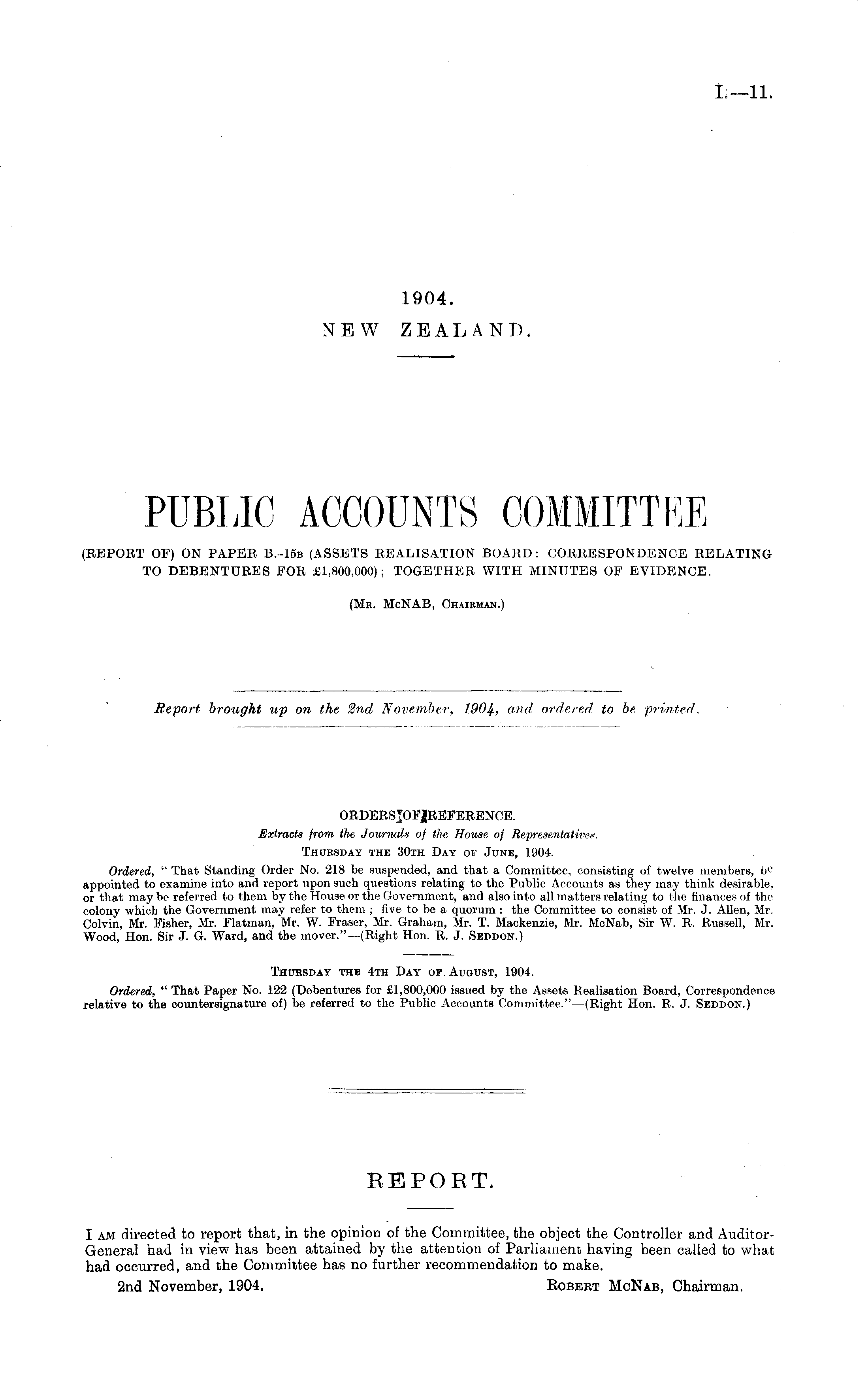 Thursday the 4th Day of. August, 1904. Ordered, " That Paper No. 122 (Debentures for £1,800,000 issued by the Assets Realisation Board, Correspondence relative to the countersignature of) be referred to the Public Accounts Committee."—(Right Hon. R. J. Seddon.)