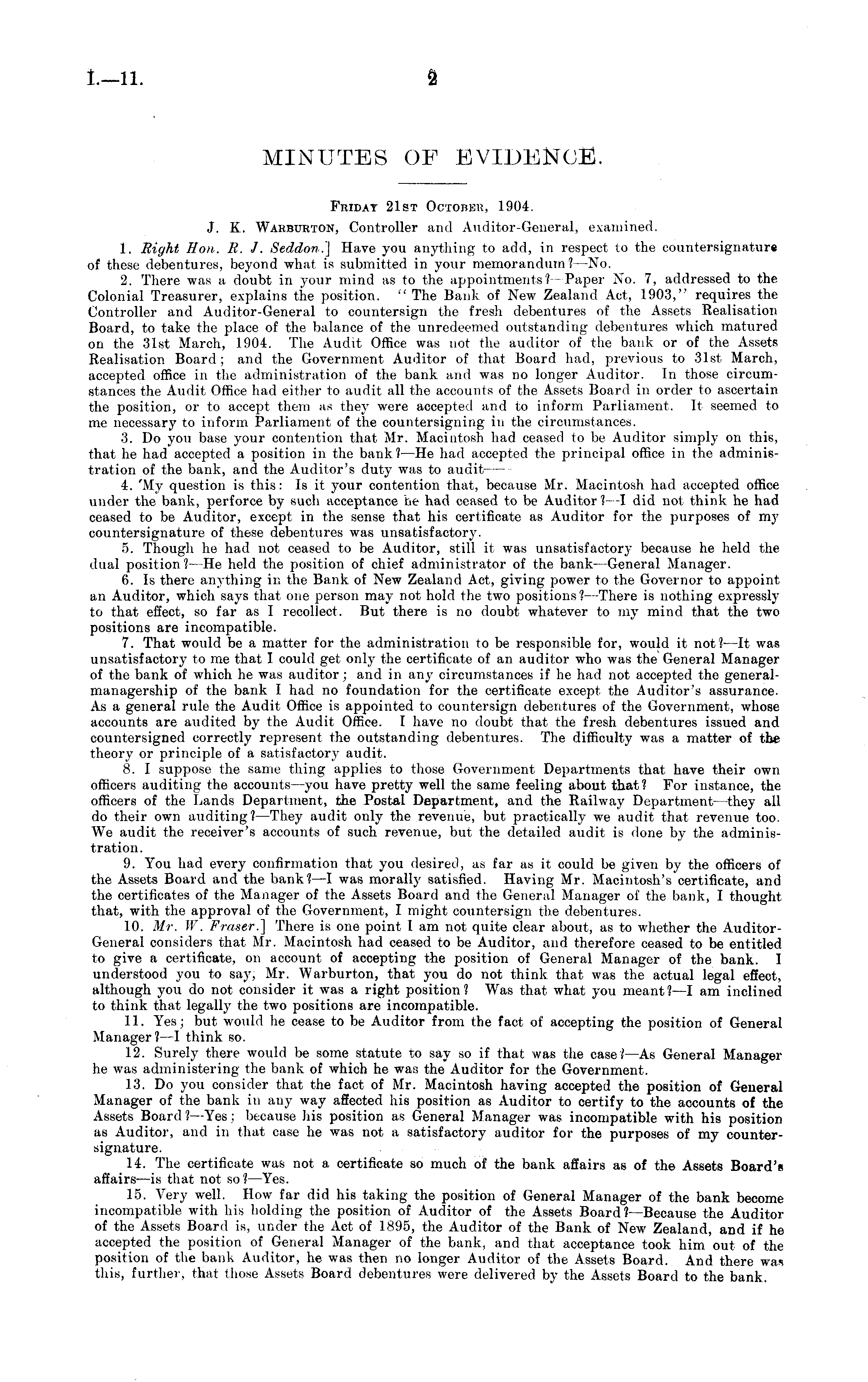 Friday 21st October, 1904. J. K. Warburton, Controller and Auditor-General, examined. 1. Right Hon. R. J. Seddon.] Have you anything to add, in respect to the countersignature of these debentures, beyond what is submitted in your memorandum? —No. 2. There was a doubt in your mind as to the appointments? -Paper No. 7, addressed to the Colonial Treasurer, explains the position. " The Bank of New Zealand Act, 1903," requires the Controller and Auditor-General to countersign the fresh debentures of the Assets Realisation Board, to take the place of the balance of the unredeemed outstanding debentures which matured on the 31st March, 1904. The Audit Office was not the auditor of the bank or of the Assets Realisation Board ; and the Government Auditor of that Board had, previous to 31st March, accepted office in the administration of the bank and was no longer Auditor. In those circumstances the Audit Office had either to audit all the accounts of the Assets Board in order to ascertain the position, or to accept them as they were accepted and to inform Parliament. It seemed to me necessary to inform Parliament of the countersigning in the circumstances. 3. Do you base your contention that Mr. Macintosh had ceased to be Auditor simply on this, that he had accepted a position in the bank ? —He had accepted the principal office in the administration of the bank, and the Auditor's duty was to audit 4. 'My question is this: Is it your contention that, because Mr. Macintosh had accepted office under the bank, perforce by such acceptance he had ceased to be Auditor?- -I did not think he had ceased to be Auditor, except in the sense that his certificate as Auditor for the purposes of my countersignature of these debentures was unsatisfactory. 5. Though he had not ceased to be Auditor, still it was unsatisfactor}- because he held the dual position? —He held the position of chief administrator of the bank —General Manager. 6. Is there anything in the Bank of New Zealand Act, giving power to the Governor to appoint an Auditor, which says that one person may not hold the two positions? —There is nothing expressly to that effect, so far as I recollect. But there is no doubt whatever to my mind that the two positions are incompatible. 7. That would be a matter for the administration to be responsible for, would it not? —It was unsatisfactory to me that I could get only the certificate of an auditor who was the General Manager of the bank of which he was auditor; and in any circumstances if he had not accepted the generalmanagership of the bank I had no foundation for the certificate except the Auditor's assurance. As a general rule the Audit Office is appointed to countersign debentures of the Government, whose accounts are audited by the Audit Office. I have no doubt that the fresh debentures issued and countersigned correctly represent the outstanding debentures. The difficulty was a matter of the theory or principle of a satisfactory audit. 8. I suppose the same thing applies to those Government Departments that have their own officers auditing the accounts —you have pretty well the same feeling about that? For instance, the officers of the Lands Department, the Postal Department, and the Railway Department —they all do their own auditing ? —They audit only the revenue, but practically we audit that revenue too. We audit the receiver's accounts of such revenue, but the detailed audit is done by the administration. 9. You had every confirmation that you desired, as far as it could be given by the officers of the Assets Board and the bank? —I was morally satisfied. Having Mr. Macintosh's certificate, and the certificates of the Manager of the Assets Board and the General Manager of the bank, I thought that, with the approval of the Government, I might countersign the debentures. 10. Mr. W. Fraser.] There is one point I am not quite clear about, as to whether the AuditorGeneral considers that Mr. Macintosh had ceased to be Auditor, and therefore ceased to be entitled to give a certificate, on account of accepting the position of General Manager of the bank. I understood you to say, Mr. Warburton, that you do not think that was the actual legal effect, although you do not consider it was a right position? Was that what you meant? —I am inclined to think that legally the two positions are incompatible. 11. Yes ; but would he cease to be Auditor from the fact of accepting the position of General Manager? —I think so. 12. Surely there would be some statute to say so if that was the case? —As General Manager he was administering the bank of which he was the Auditor for the Government. 13. Do you consider that the fact of Mr. Macintosh having accepted the position of General Manager of the bank in any way affected his position as Auditor to certify to the accounts of the Assets Board ? —Yes ; because his position as General Manager was incompatible with his position as Auditor, and in that case he was not a satisfactory auditor for the purposes of my countersignature. 14. The certificate was not a certificate so much of the bank affairs as of the Assets Board's affairs—is that not so? —Yes. 15. Very well. How far did his taking the position of General Manager of the bank become incompatible with his holding the position of Auditor of the Assets Board ?—Because the Auditor of the Assets Board is, under the Act of 1895, the Auditor of the Bank of New Zealand, and if he accepted the position of General Manager of the bank, and that acceptance took him out of the position of the bank Auditor, he was then no longer Auditor of the Assets Board. And there wa* this, further, that those Assets Board debentures were delivered by the Assets Board to the bank.