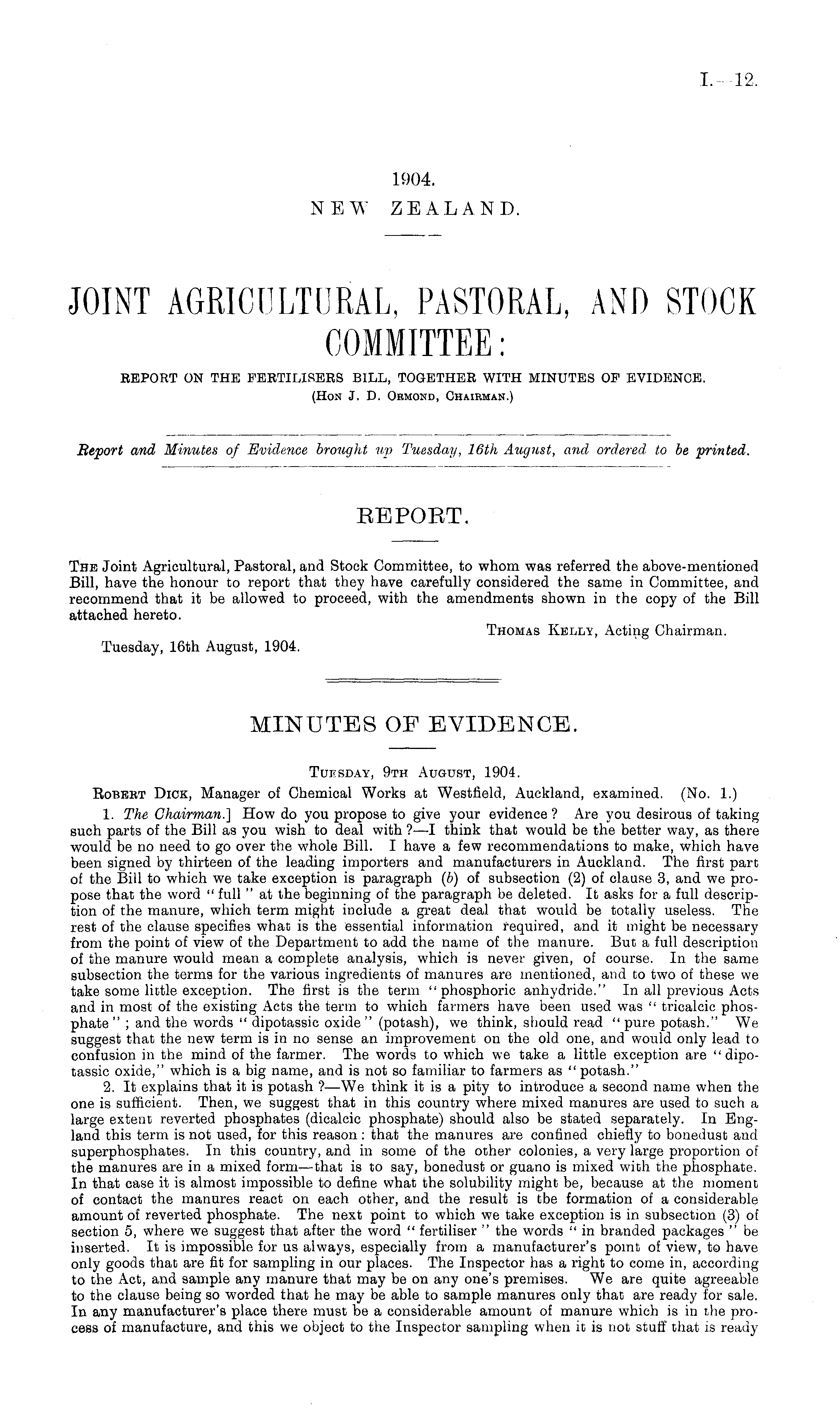 JOINT AGRICULTURAL, PASTORAL, AND STOCK COMMITTEE: REPORT ON THE FERTILISERS BILL, TOGETHER WITH MINUTES OF EVIDENCE. (Hon J. D. Ormond, Chairman.)