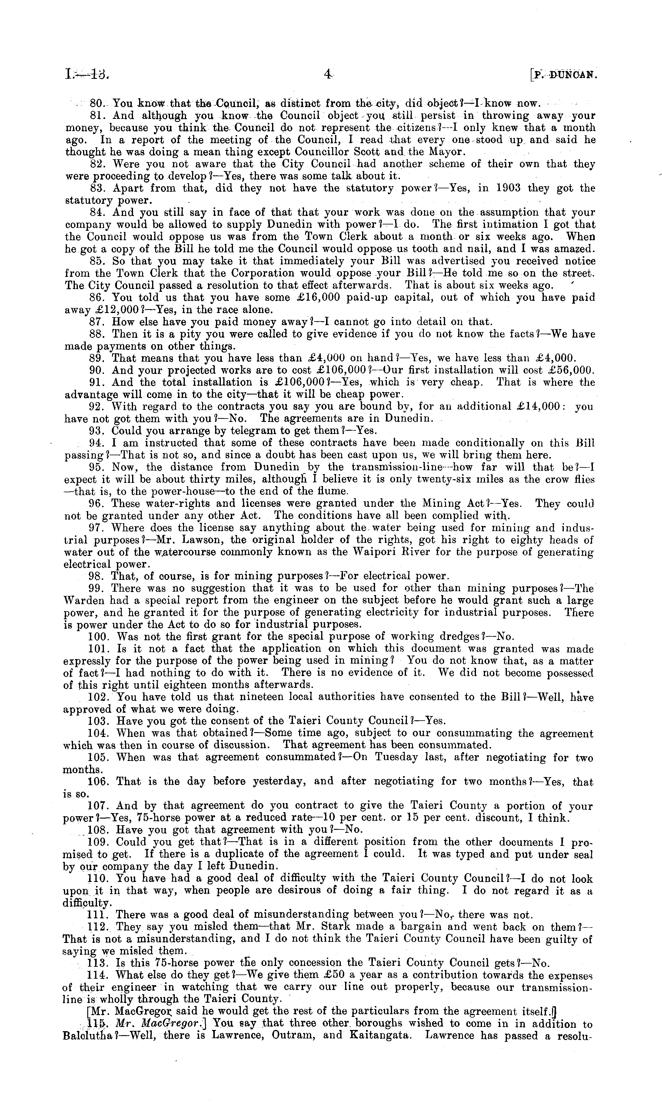 80. You know that the Council, as distinct from the city, did object? —I know now. 81. And although you know the Council object you still persist in throwing away your money, because you think the Council do not represent the citizens ? —I only knew that a month ago. In a report of the meeting of the Council, I read that every one stood up and said he thought he was doing a mean thing except Councillor Scott and the Mayor. 82. Were you not aware that the City Council had another scheme of their own that they were proceeding to develop ? —Yes, there was some talk about it. 83. Apart from that, did they not have the statutory power? —Yes, in 1903 they got the statutory power. 84. And you still say in face of that that your work was done on the assumption that your company would be allowed to supply Dunedin with power ? —1 do. The first intimation I got that the Council would oppose us was from the Town Clerk about a month or six weeks ago. When he got a copy of the Bill he told me the Council would oppose us tooth and nail, and I was amazed. 85. So that you may take it that immediately your Bill was advertised you received notice from the Town Clerk that the Corporation would oppose your Bill ? —He told me so on the street. The City Council passed a resolution to that effect afterwards. That is about six weeks ago. 86. You told us that you have some £16,000 paid-up capital, out of which you have paid away £12,000? —Yes, in the race alone. 87. How else have you paid money away? —I cannot go into detail on that. 88. Then it is a pity you were called to give evidence if you do not know the facts ? —We have made payments on other things. 89. That means that you have less than £4,000 on hand? —Yes, we have less than £4,000. 90. And your projected works are to cost £106,000? —Our first installation will cost £56,000. 91. And the total installation is £106,000? —Yes, which is very cheap. That is where the advantage will come in to the city —that it will be cheap power. 92. With regard to the contracts you say you are bound by, for an additional £14,000: you have not got them with you? —No. The agreements are in Dunedin. 93. Could you arrange by telegram to get them? —Yes. 94. I am instructed that some of these contracts have been made conditionally on this Bill passing? —That is not so, and since a doubt has been cast upon us, we will bring them here. 95. Now, the distance from Dunedin by the transmission-line—-how far will that be? —I expect it will be about thirty miles, although I believe it is only twenty-six miles as the crow flies —that is, to the power-house —to the end of the flume. 96. These water-rights and licenses were granted under the Mining Act? —Yes. They could not be granted under any other Act. The conditions have all been complied with.---97. Where does the license say anything about the water being used for mining and industrial purposes? —Mr. Lawson, the original holder of the rights, got his right to eighty heads of water out of the watercourse commonly known as the Waipori River for the purpose of generating electrical power. 98. That, of course, is for mining purposes? —For electrical power. 99. There was no suggestion that it was to be used for other than mining purposes? —The Warden had a special report from the engineer on the subject before he would grant such a large power, and he granted it for the purpose of generating electricity for industrial purposes. There is power under the Act to do so for industrial purposes. 100. Was not the first grant for the special purpose of working dredges? —No. 101. Is it not a fact that the application on which this document was granted was made expressly for the purpose of the power being used in mining? You do not know that, as a matter of fact? —I had nothing to do with it. There is no evidence of it. We did not become possessed of this right until eighteen months afterwards. 102. You have told us that nineteen local authorities have consented to the Bill? —Well, have approved of what we were doing. 103. Have you got the consent of the Taieri County Council? —Yes. 104. When was that obtained? —Some time ago, subject to our consummating the agreement which was then in course of discussion. That agreement has been consummated. 105. When was that agreement consummated? —On Tuesday last, after negotiating for two months. 106. That is the day before yesterday, and after negotiating for two months? —Yes, that is so. 107. And by that agreement do you contract to give the Taieri County a portion of your power? —Yes, 75-horse power at a reduced rate —10 per cent, or 15 per cent, discount, I think. 108. Have you got that agreement with you? —No. 109. Could you get that? —That is in a different position from the other documents I promised to get. If there is a duplicate of the agreement I could. It was typed and put under seal by our company the day I left Dunedin. 110. You have had a good deal of difficulty with the Taieri County Council? —I do not look upon it in that way, when people are desirous of doing a fair thing. I do not regard it as a difficulty. 111. There was a good deal of misunderstanding between you? —No,- there was not. 112. They say you misled them —that Mr. Stark made a bargain and went back on them? — That is not a misunderstanding, and I do not think the Taieri County Council have been guilty of saying we misled them. 113. Is this 75-horse power tKe only concession the Taieri County Council gets? —No. 114. What else do they get? —We give them £50 a year as a contribution towards the expenses of their engineer in watching that we carry our line out properly, because our transmissionline is wholly through the Taieri County. [Mr. MacGregor, said he would get the rest of the particulars from the agreement itself .j] 115. Mr. MacGregor.] You say that three other boroughs wished to come in in addition to Balolutha? —Well, there is Law