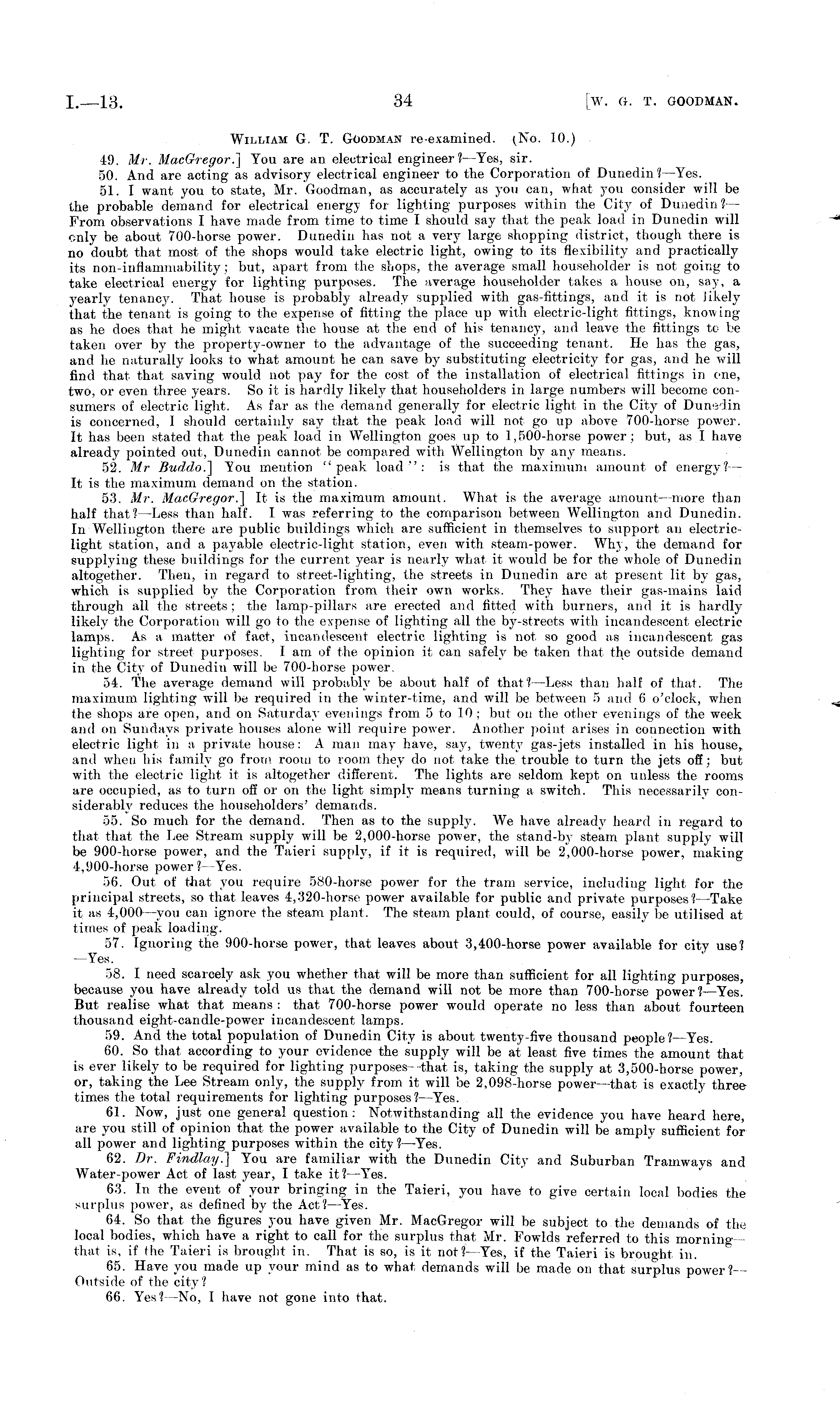 William G. T. Goodman re-examined. -No. 10.) 49. Mr. MacGregor.] You are an electrical engineer? —Yes, sir. 50. And are acting as advisory electrical engineer to the Corporation of Dunedin? —Yes. 51. I want you to state, Mr. Goodman, as accurately as you can, what you consider will be the probable demand for electrical energy for lighting purposes within the City of Dunedin?— From observations I have made from time to time I should say that the peak load in Dunedin will only be about 700-horse power. Dunedin has not a very large shopping district, though there is no doubt that most of the shops would take electric light, owing to its flexibility and practically its non-inflammability; but, apart from the shops, the average small householder is not going to take electrical energy for lighting purposes. The average householder takes a house on, say, a yearly tenancy. That house is probably already supplied with gas-fittings, and it is not likely that the tenant is going to the expense of fitting the place up with electric-light fittings, knowing as he does that he might vacate the house at the end of his tenancy, and leave tlie fittings to be taken over by the property-owner to the advantage of the succeeding tenant. He has the gas, and he naturally looks to what amount he can save by substituting electricity for gas, and he will find that that saving would not pay for the cost of the installation of electrical fittings in one, two, or even three years. So it is hardly likely that householders in large numbers will become consumers of electric light. As far as the demand generally for electric light in the City of Dunedin is concerned, I should certainly say that the peak load will not go up above 700-horse power. It has been stated that the peak load in Wellington goes up to 1,500-horse power; but, as I have already pointed out, Dunedin cannot be compared with Wellington by any means. .")2. Mr Buddo.] You mention "peak load": is that the maximum amount of energy? — It is the maximum demand on the station. 53. Mr. MacGregor.] It is the maximum amount. What is the average amount—more than half that? —Less than half. I was referring to the comparison between Wellington and Dunedin. In Wellington there are public buildings which are sufficient in themselves to support an electriclight station, and a payable electric-light station, even with steam-power. Win , the demand for supplying these buildings for the current year is nearly what it would be for the whole of Dunedin altogether. Then, in regard to street-lighting, the streets in Dunedin are at present lit by gas, which is supplied by the Corporation from their own works. They have their gas-mains laid through all the streets ; the lamp-pillars are erected and fitted with burners, and it is hardlylikely the Corporation will go to the expense of lighting all the by-streets with incandescent electric lamps. .4s a matter of fact, incandescent electric lighting is not so good as incandescent gas lighting for street purposes. lam of tlie opinion it can safely be taken that the outside demand in the City of Dunedin will be 700-horse power. 54. The average demand will probably be about half of that? —Less than half of that. The maximum lighting will be required in the winter-time, and will be between 5 arid 6 o'clock, when the shops are open, and on Saturday evenings from 5 to 10 ; but on the other evenings of the week and on Sundays private houses alone will require power. Another point arises in connection with electric light in a private house: A man may have, say, twenty gas-jets installed in his house, and when his family go from room to room they do not take the trouble to turn the jets off ; but with the electric light it is altogether different. The lights are seldom kept on unless the rooms are occupied, as to turn off or on the light simply means turning a switch. This necessarily considerably reduces the householders' demands. •")."). So much for the demand. Then as to the supply. We have already heard in regard to that that the Lee Stream supply will be 2,000-horse power, the stand-by steam plant supply will be 900-horse power, and the Taieri supply, if it is required, will be 2,000-horse power, making 4,900-horse power? Yes. 56. Out of that you require 580-horse power for the tram service, including light for the principal streets, so that leaves 4,320-horse power available for public and private purposes? —Take it as 4,000 —you can ignore the steam plant. The steam plant could, of course, easily be utilised at times of peak loading. 57. Ignoring the 900-horse power, that leaves about 3,400-horse power available for city use' —Yes. 58. I need scarcely ask you whether that will be more than sufficient for all lighting purposes, because you have already told us that the demand will not be more than 700-horse power?— Yes. But realise what that means : that 700-horse power would operate no less than about fourteen thousand eight-candle-power incandescent lamps. 59. And the total population of Dunedin City is about twenty-five thousand people?— Yes. 60. So that according to your evidence the supply will be at least five times the amount that is ever likely to be required for lighting purposes- -that is, taking the supply at 3,500-horse power, or, taking the Lee Stream only, the supply from it will be 2,098-horse power—that is exactly three times the total requirements for lighting purposes? —Yes. 61. Now, just one general question: Notwithstanding all the evidence you have heard here, are you still of opinion that the power available to the City of Dunedin will be amply sufficient for all power and lighting purposes within the city? —Yes. 62. Dr. Findlay.] You are familiar with the Dunedin City and Suburban Tramways and Water-power Act of last year, I take it?— Yes. 63. In the event of your bringing in the Taieri, you have to give certain local bodies the surplus power, as defined by the Act? —Yes. 64. 