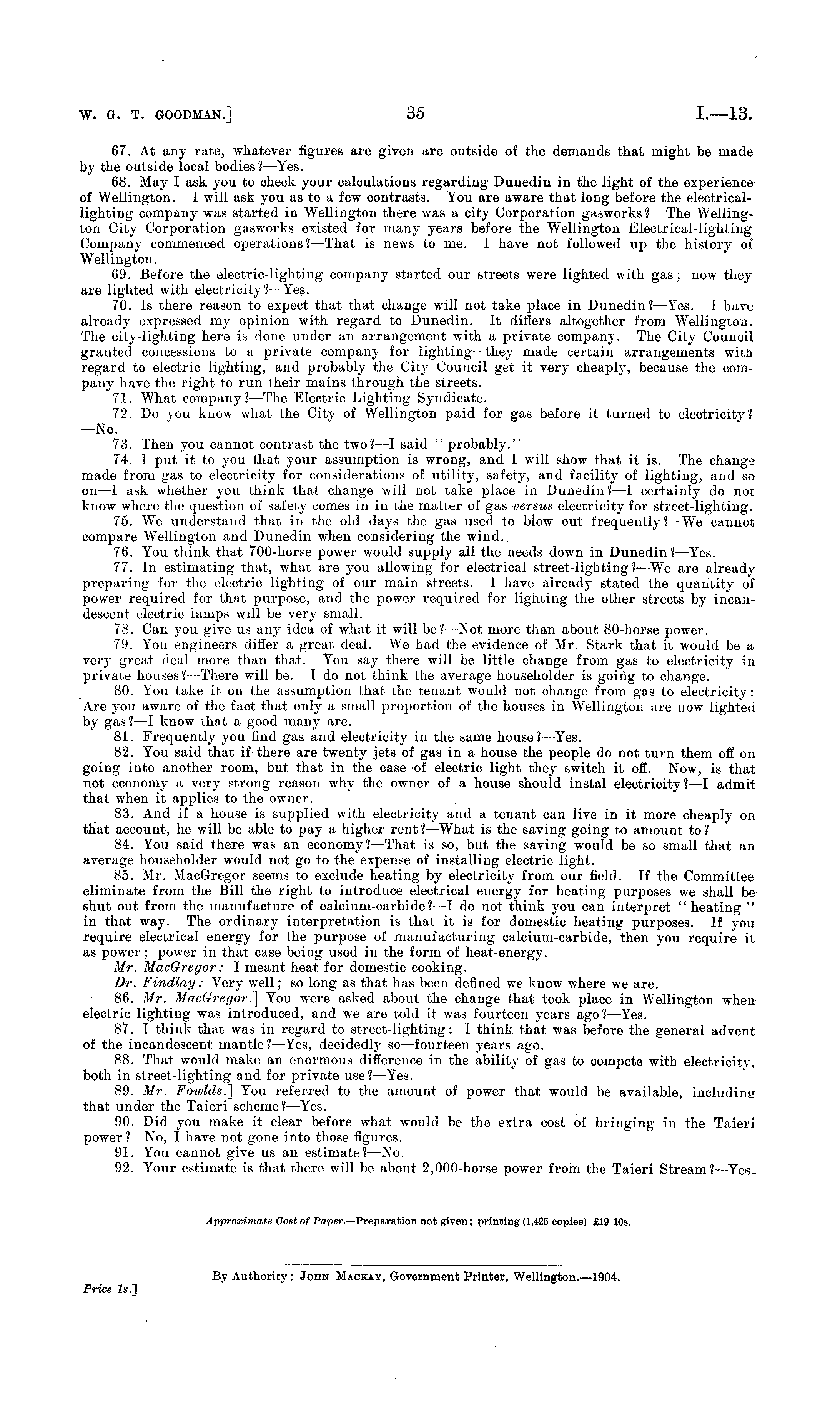 67. At any rate, whatever figures are given are outside of the demands that might be made by the outside local bodies? —Yes. 68. May I ask you to check your calculations regarding Dunedin in the light of the experience of Wellington. I will ask you as to a few contrasts. You are aware that long before the electricallighting company was started in Wellington there was a city Corporation gasworks ? The Wellington City Corporation gasworks existed for many years before the Wellington Electrical-lighting Company commenced operations? —That is news to me. I have not followed up the history of Wellington. 69. Before the electric-lighting company started our streets were lighted with gas; now they are lighted with electricity? —Yes. 70. Is there reason to expect that that change will not take place in Dunedin? —Yes. I have already expressed my opinion with regard to Dunedin. It differs altogether from Wellington. The city-lighting here is done under an arrangement with a private company. The City Council granted concessions to a private company for lighting —they made certain arrangements witn regard to electric lighting, and probably the City Council get it very cheaply, because the company have the right to run their mains through the streets. 71. What company? —The Electric Lighting Syndicate. 72. Do you know what the City of Wellington paid for gas before it turned to electricity? —No. 73. Then you cannot contrast the two? —I said " probably." 74. I put it to you that your assumption is wrong, and I will show that it is. The change made from gas to electricity for considerations of utility, safety, and facility of lighting, and so on —I ask whether you think that change will not take place in Dunedin ? —I certainly do not know where the question of safety comes in in the matter of gas versus electricity for street-lighting. 75. We understand that in the old days the gas used to blow out frequently? —We cannot compare Wellington and Dunedin when considering the wind. 76. You think that 700-horse power would supply all the needs down in Dunedin? —Yes. 77. In estimating that, what are you allowing for electrical street-lighting? —We are already preparing for the electric lighting of our main streets. I have already stated the quantity of power required for that purpose, and the power required for lighting the other streets by incandescent electric lamps will be very small. 78. Can you give us any idea of what it will be? —Not more than about 80-horse power. 79. You engineers differ a great deal. We had the evidence of Mr. Stark that it would be a very great deal more than that. You say there will be little change from gas to electricity in private houses ? —There will be. Ido not think the average householder is going to change. 80. You take it on the assumption that the tenant would not change from gas to electricity: Are you aware of the fact that only a small proportion of the houses in Wellington are now lighted by gas ? —I know that a good many are. 81. Frequently you find gas and electricity in the same house? —Yes. 82. You said that if there are twenty jets of gas in a house the people do not turn them off on going into another room, but that in the case of electric light they switch it off. Now, is that not economy a very strong reason why the owner of a house should instal electricity? —I admit that when it applies to the owner. 83. And if a house is supplied with electricity and a tenant can live in it more cheaply on that account, he will be able to pay a higher rent? —What is the saving going to amount to? 84. You said there was an economy? —That is so, but the saving would be so small that an average householder would not go to the expense of installing electric light. 85. Mr. MacGregor seems to exclude heating by electricity from our field. If the Committee eliminate from the Bill the right to introduce electrical energy for heating purposes we shall be shut out from the manufacture of calcium-carbide?-—I do not think you can interpret "heating " in that way. The ordinary interpretation is that it is for domestic heating purposes. If you require electrical energy for the purpose of manufacturing calcium-carbide, then you require it as power; power in that case being used in the form of heat-energy. Mr. MacGregor: I meant heat for domestic cooking. Dr. Findlay: Very well; so long as that has been defined we know where we are. 86. Mr. MacGregor.] You were asked about the change that took place in Wellington when electric lighting was introduced, and we are told it was fourteen years ago? —Yes. 87. I think that was in regard to street-lighting: 1 think that was before the general advent of the incandescent mantle ? —Yes, decidedly so —fourteen years ago. 88. That would make an enormous difference in the ability of gas to compete with electricity, both in street-lighting and for private use? —Yes. 89. Mr. Fowlds.] You referred to the amount of power that would be available, including that under the Taieri scheme? —Yes. 90. Did you make it clear before what would be the extra cost of bringing in the Taieri power? —No, I have not gone into those figures. 91. You cannot give us an estimate? —No. 92. Your estimate is that there will be about 2,000-horse power from the Taieri Stream? —Yes..