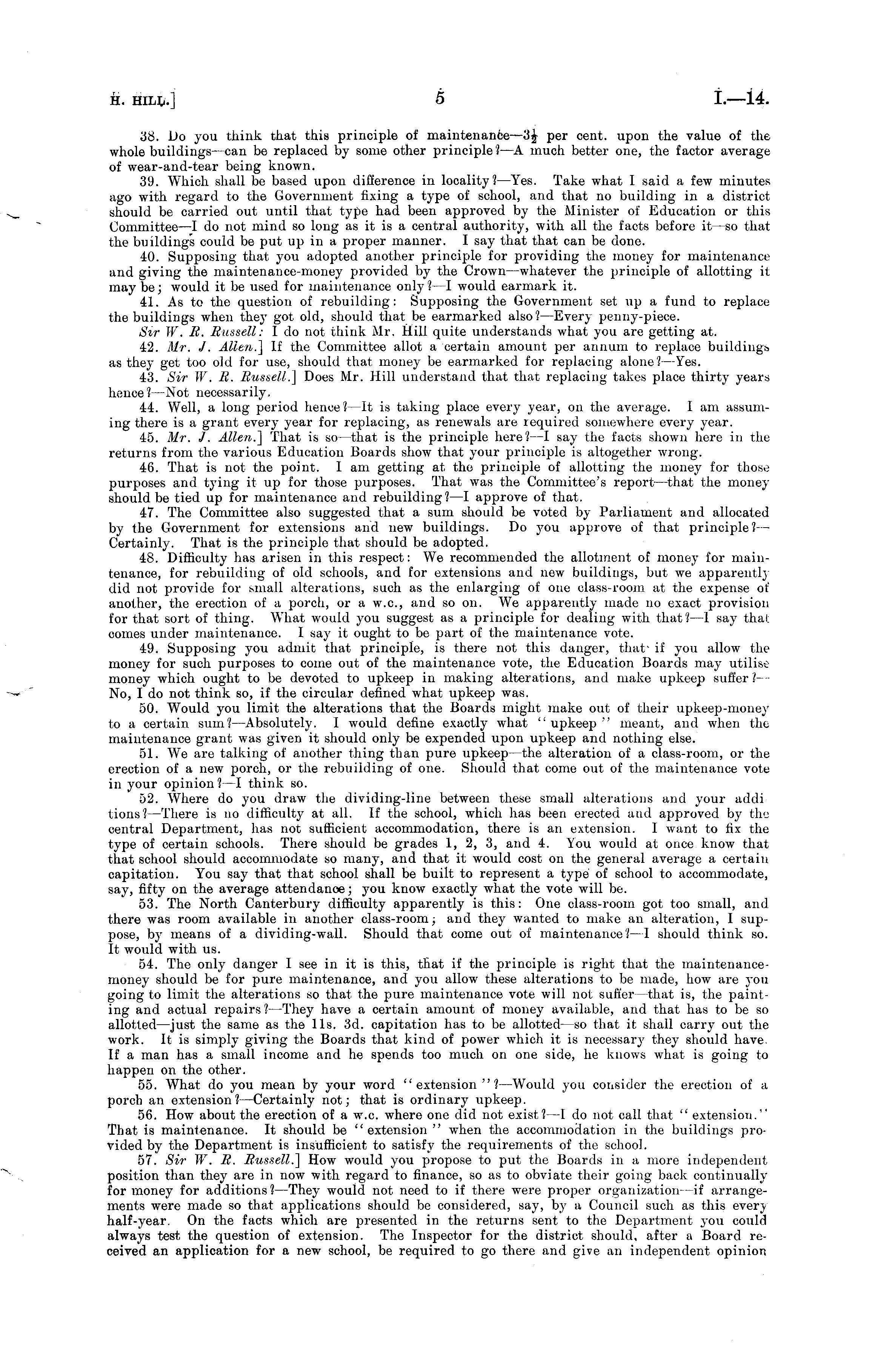 38. Do you think that this principle of maintenance — per cent, upon the value of the whole buildings —can be replaced by some other principle? —A much better one, the factor average of wear-and-tear being known. 39. Which shall be based upon difference in locality? —Yes. Take what I said a few minutes ago with regard to the Government fixing a type of school, and that no building in a district should be carried out until that type had been approved by the Minister of Education or this Committee —I do not mind so long as it is a central authority, with all the facts before it —so that the buildings could be put up in a proper manner. I say that that can be done. 40. Supposing that you adopted another principle for providing the money for maintenance and giving the maintenance-money provided by the Crown —whatever the principle of allotting it may be; would it be used for maintenance only ? —I would earmark it. 41. As to the question of rebuilding: Supposing the Government set up a fund to replace the buildings when they got old, should that be earmarked also? —Every penny-piece. Sir W. R. Russell: I do not think Mr. Hill quite understands what you are getting at. 42. Mr. J. Allen.] If the Committee allot a certain amount per annum to replace buildings as they get too old for use, should that money be earmarked for replacing alone? —Yes. 43. Sir W. R. Russell.] Does Mr. Hill understand that that replacing takes place thirty years hence ? —Not necessarily, 44. Well, a long period hence ? —lt is taking place every year, on the average. lam assuming there is a grant every year for replacing, as renewals are required somewhere every year. 45. Mr. J. Allen.] That is so—that is the principle here? —I say the facts shown here in the returns from the various Education Boards show that your principle is altogether wrong. 46. That is not the point. 1 am getting at the principle of allotting the money for those purposes and tying it up for those purposes. That was the Committee's report —that the money should be tied up for maintenance and rebuilding? —I approve of that. 47. The Committee also suggested that a sum should be voted by Parliament and allocated by the Government for extensions and new buildings. Do you approve of that principle? — Certainly. That is the principle that should be adopted. 48. Difficulty has arisen in this respect: We recommended the allotment of money for maintenance, for rebuilding of old schools, and for extensions and new buildings, but we apparentl) did not provide for small alterations, such as the enlarging of one class-room at the expense of another, the erection of a porch, or a w.c, and so on. We apparently made no exact provision for that sort of thing. What would you suggest as a principle for dealing with that? —I say that comes under maintenance. I say it ought to be part of the maintenance vote. 49. Supposing you admit that principle, is there not this danger, that' if you allow the money for such purposes to come out of the maintenance vote, the Education Boards may utilise money which ought to be devoted to upkeep in making alterations, and make upkeep suffer ?— No, I do not think so, if the circular defined what upkeep was. 50. Would you limit the alterations that the Boards might make out of their upkeep-money to a certain sum? —Absolutely. I would define exactly what " upkeep " meant, and when the maintenance grant was given it should only be expended upon upkeep and nothing else. 51. We are talking of another thing than pure upkeep —the alteration of a class-room, or the erection of a new porch, or the rebuilding of one. Should that come out of the maintenance vote in your opinion? —I think so. 52. Where do you draw the dividing-line between these small alterations and your addi tions? —There is no difficulty at all. If the school, which has been erected and approved by the central Department, has not sufficient accommodation, there is an extension. I want to fix the type of certain schools. There should be grades 1, 2, 3, and 4. You would at once know that that school should accommodate so many, and that it would cost on the general average a certain capitation. You say that that school shall be built to represent a type of school to accommodate, say, fifty on the average attendance; you know exactly what the vote will be. 53. The North Canterbury difficulty apparently is this: One class-room got too small, and there was room available in another class-room; and they wanted to make an alteration, I suppose, by means of a dividing-wall. Should that come out of maintenance? —I should think so. It would with us. 54. The only danger 1 see in it is this, that if the principle is right that the maintenancemoney should be for pure maintenance, and you allow these alterations to be made, how are you going to limit the alterations so that the pure maintenance vote will not suffer —that is, the painting and actual repairs ? —They have a certain amount of money available, and that has to be so allotted —just the same as the lis. 3d. capitation has to be allotted —so that it shall carry out the work. It is simply giving the Boards that kind of power which it is necessary they should have. If a man has a small income and he spends too much on one side, he knows what is going to happen on the other. 55. What do you mean by your word "extension"? —Would you consider the erection of a porch an extension? —Certainly not; that is ordinary upkeep. 56. How about the erection of a w.c. where one did not exist? —I do not call that " extension." That is maintenance. It should be "extension" when the accommodation in the buildings provided by the Department is insufficient to satisfy the requirements of the school. 57. Sir W. R. Russell.] How would you propose to put the Boards in a more independent position than they are in now with regard to finance, so as to obviate their going back continually for money for ad