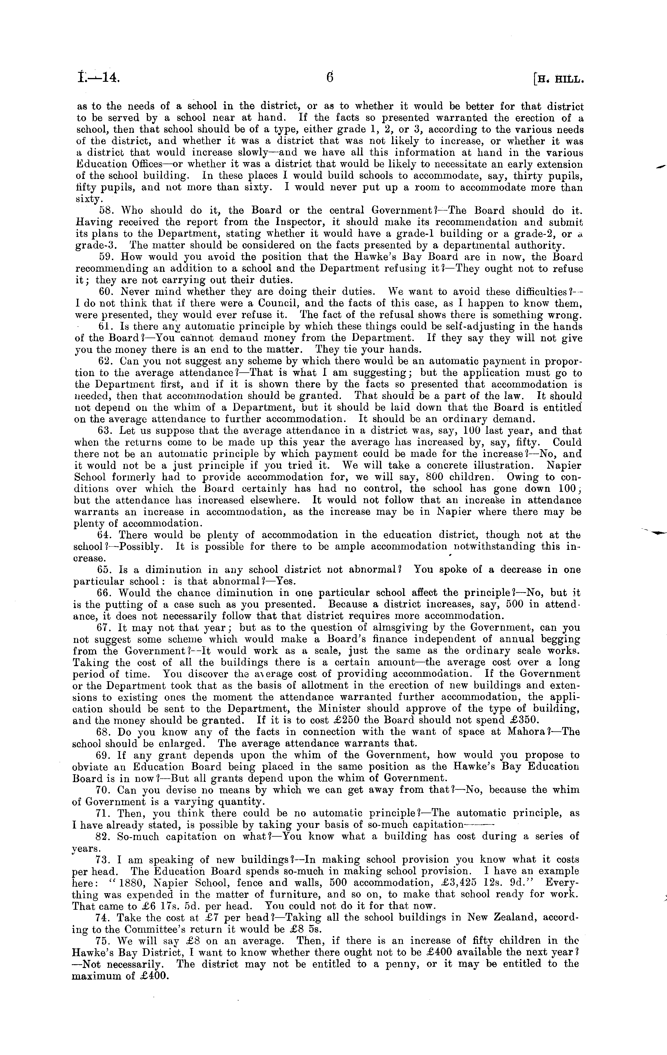 as to the needs of a school in the district, or as to whether it would be better for that district to be served by a school near at hand. If the facts so presented warranted the erection of a school, then that school should be of a type, either grade 1, 2, or 3, according to the various needs of the district, and whether it was a district that was not likely to increase, or whether it was a district that would increase slowly —and we have all this information at hand in the various Education Offices —or whether it was a district that would be likely to necessitate an early extension of the school building. In these places I would build schools to accommodate, say, thirty pupils, fifty pupils, and not more than sixty. I would never put up a room to accommodate more than sixty. 58. Who should do it, the Board or the central Government? —The Board should do it. Having received the report from the Inspector, it should make its recommendation and submit its plans to the Department, stating whether it would have a grade-1 building or a grade-2, or a grade-3. The matter should be considered on the facts presented by a departmental authority. 59. How would you avoid the position that the Hawke's Bay Board are in now, the Board recommending an addition to a school and the Department refusing it? —They ought not to refuse it; they are not carrying out their duties. 60. Never mind whether they are doing their duties. We want to avoid these difficulties ?-- I do not think that if there were a Council, and the facts of this case, as I happen to know them, were presented, they would ever refuse it. The fact of the refusal shows there is something wrong. 61. Is there any automatic principle by which these things could be self-adjusting in the hands of the Board ? —You cannot demand money from the Department. If they say they will not give you the money there is an end to the matter. They tie your hands. 62. Can you not suggest any scheme by which there would be an automatic payment in proportion to the average attendance ? —That is what lam suggesting; but the application must go to the Department first, and if it is shown there by the facts so presented that accommodation is needed, then that accommodation should be granted. That should be a part of the law. It should not depend on the whim of a Department, but it should be laid down that the Board is entitled on the average attendance to further accommodation. It should be an ordinary demand. 63. Let us suppose that the average attendance in a district was, say, 100 last year, and that when the returns come to be made up this year the average has increased by, say, fifty. Could there not be an automatic principle by which payment could be made for the increase? —No, and it would not be a just principle if you tried it. We will take a concrete illustration. Napier School formerly had to provide accommodation for, we will say, 800 children. Owing to conditions over which the Board certainly has had no control, the school has gone down 100, but the attendance has increased elsewhere. It would not follow that an increase in attendance warrants an increase in accommodation, as the increase may be in Napier where there may be plenty of accommodation. 64. There would be plenty of accommodation in the education district, though not at the school ? —Possibly. It is possible for there to be ample accommodation notwithstanding this increase. 65. Is a diminution in any school district not abnormal? You spoke of a decrease in one particular school: is that abnormal ? —Yes. 66. Would the chance diminution in one particular school affect the principle? —No, but it is the putting of a case such as you presented. Because a district increases, say, 500 in attendance, it does not necessarily follow that that district requires more accommodation. 67. It may not that year; but as to the question of almsgiving by the Government, can you not suggest some scheme which would make a Board's finance independent of annual begging from the Government?--It would work as a scale, just the same as the ordinary scale works. Taking the cost of all the buildings there is a certain amount —the average cost over a long period of time. You discover the average cost of providing accommodation. If the Government or the Department took that as the basis of allotment in the erection of new buildings and extensions to existing ones the moment the attendance warranted further accommodation, the application should be sent to the Department, the Minister should approve of the type of building, and the money should be granted. If it is to cost £250 the Board should not spend £350. 68. Do you know any of the facts in connection with the want of space at Mahora I—The1 —The school should be enlarged. The average attendance warrants that. 69. If any grant depends upon the whim of the Government, how would you propose to obviate an Education Board being placed in the same position as the Hawke's Bay Education Board is in now ? —But all grants depend upon the whim of Government. 70. Can you devise no means by which we can get away from that? —No, because the whim of Government is a varying quantity. 71. Then, you think there could be no automatic principle? —The automatic principle, as I have already stated, is possible by taking your basis of so-much capitation 82. So-much capitation on what? —You know what a building has cost during a series of years. 73. I am speaking of new buildings? —In making school provision you know what it costs per head. The Education Board spends so-much in making school provision. I have an example here: "1880, Napier School, fence and walls, 500 accommodation, £3,425 12s. 9d." Everything was expended in the matter of furniture, and so on, to make that school ready for work. That came to £6 17s. sd. per head. You could not do it for that now. 74. Take the cost at £7 per head? —Taking all the school buildings in New Zealand, accord
