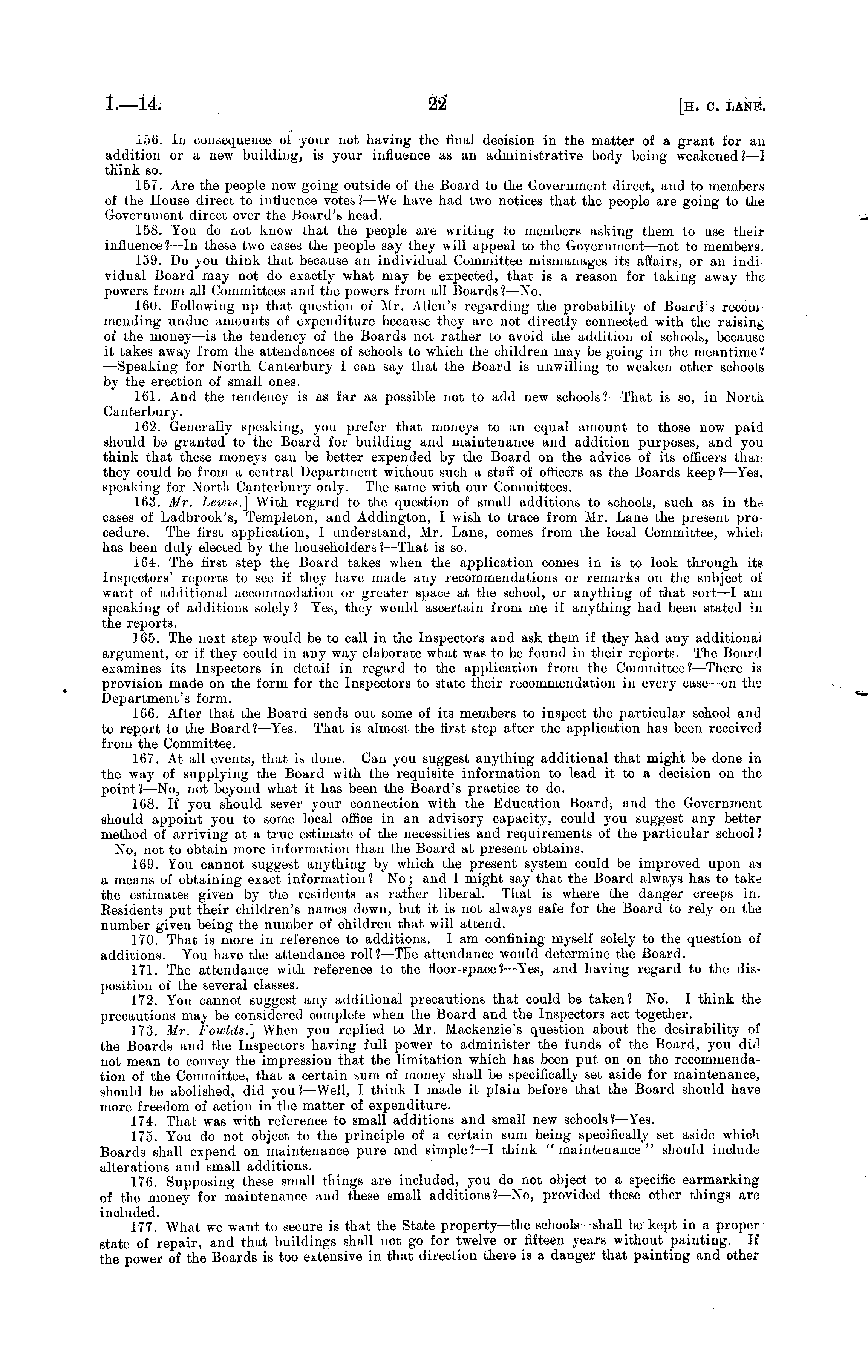 156. In consequence of your not having the final decision in the matter of a grant for an addition or a new building, is your influence as an administrative body being weakened ? —I think so. 157. Are the people now going outside of the Board to the Government direct, and to members of the House direct to influence votes ? —We have had two notices that the people are going to the Government direct over the Board's head. 158. You do not know that the people are writing to members asking them to use their influence? —In these two cases the people say they will appeal to the Government —not to members. 159. Do you think that because an individual Committee mismanages its affairs, or an mdi vidual Board may not do exactly what may be expected, that is a reason for taking away the powers from all Committees and the powers from all Boards ? —No. 160. Following up that question of Mr. Allen's regarding the probability of Board's recommending undue amounts of expenditure because they are not directly connected with the raising of the money —is the tendency of the Boards not rather to avoid the addition of schools, because it takes away from the attendances of schools to which the children may be going in the meantime ? —Speaking for North Canterbury I can say that the Board is unwilling to weaken other schools by the erection of small ones. 161. And the tendency is as far as possible not to add new schools? —That is so, in North Canterbury. 162. Generally speaking, you prefer that moneys to an equal amount to those now paid should be granted to the Board for building and maintenance and addition purposes, and you think that these moneys can be better expended by the Board on the advice of its officers than they could be from a central Department without such a staff of officers as the Boards keep ? —Yes, speaking for North Canterbury only. The same with our Committees. 163. Mr. Lewis.] With regard to the question of small additions to schools, such as in the cases of Ladbrook's, Templeton, and Addington, I wish to trace from Mr. Lane the present procedure. The first application, I understand, Mr. Lane, comes from the local Committee, which has been duly elected by the householders ? —That is so. i 64. The first step the Board takes when the application comes in is to look through its Inspectors' reports to see if they have made any recommendations or remarks on the subject of want of additional accommodation or greater space at the school, or anything of that sort —I am speaking of additions solely ? —Yes, they would ascertain from me if anything had been stated in the reports. 165. The next step would be to call in the Inspectors and ask them if they had any additional argument, or if they could in any way elaborate what was to be found in their reports. The Board examines its Inspectors in detail in regard to the application from the Committee? —There is provision made on the form for the Inspectors to state their recommendation in every case —on the Department's form. 166. After that the Board sends out some of its members to inspect the particular school and to report to the Board ? —Y'es. That is almost the first step after the application has been received from the Committee. 167. At all events, that is done. Can you suggest anything additional that might be done in the way of supplying the Board with the requisite information to lead it to a decision on the point? —No, not beyond what it has been the Board's practice to do. 168. If you should sever your connection with the Education Board, and the Government should appoint you to some local office in an advisory capacity, could you suggest any better method of arriving at a true estimate of the necessities and requirements of the particular school? —No, not to obtain more information than the Board at present obtains. 169. You cannot suggest anything by which the present system could be improved upon as a means of obtaining exact information ? —No; and I might say that the Board always has to tak-j the estimates given by the residents as rather liberal. That is where the danger creeps in. Residents put their children's names down, but it is not always safe for the Board to rely on the number given being the number of children that will attend. 170. That is more in reference to additions. lam confining myself solely to the question of additions. You have the attendance roll? —The attendance would determine the Board. 171. The attendance with reference to the floor-space? —Yes, and having regard to the disposition of the several classes. 172. You cannot suggest any additional precautions that could be taken? —No. I think the precautions may be considered complete when the Board and the Inspectors act together. 1.73. Mr. Fowlds.] When you replied to Mr. Mackenzie's question about the desirability of the Boards and the Inspectors having full power to administer the funds of the Board, you did not mean to convey the impression that the limitation which has been put on on the recommendation of the Committee, that a certain sum of money shall be specifically set aside for maintenance, should be abolished, did you? —Well, I think I made it plain before that the Board should have more freedom of action in the matter of expenditure. 174. That was with reference to small additions and small new schools? —Yes. 175. You do not object to the principle of a certain sum being specifically set aside which Boards shall expend on maintenance pure and simple?—l think "maintenance" should include alterations and small additions. 176. Supposing these small things are included, you do not object to a specific earmarking of the money for maintenance and these small additions?—No, provided these other things are included. 177. What we want to secure is that the State property—the schools—shall be kept in a proper state of repair, and that buildings shall not go for twelve or fifteen years without painting. If 