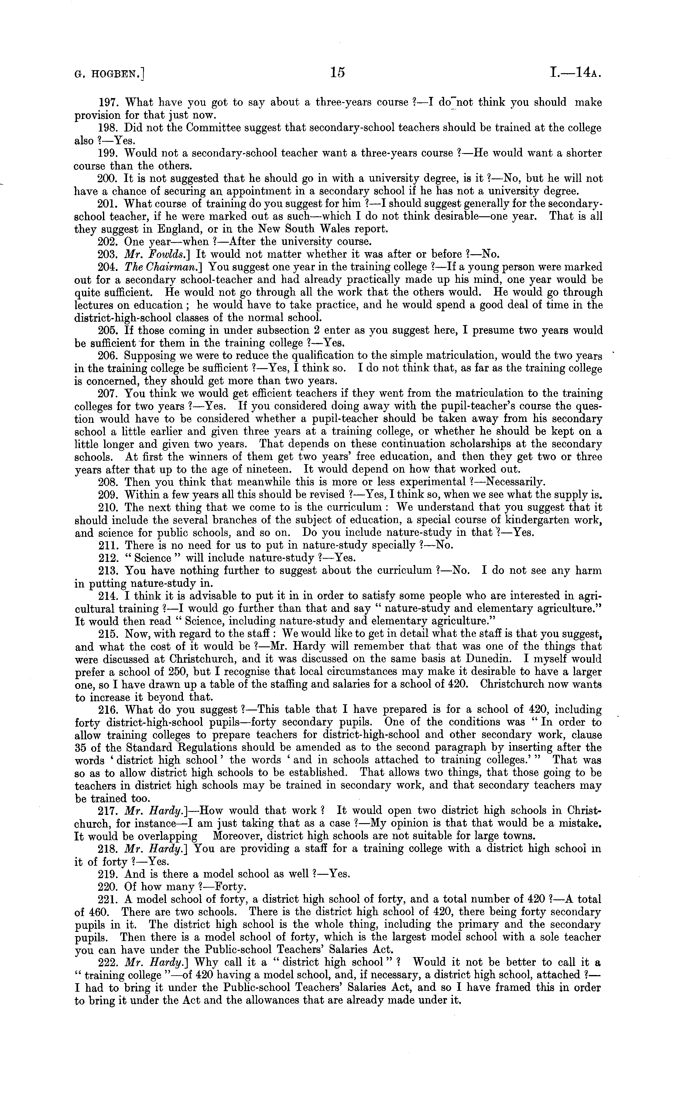 197. What have you got to say about a three-years course ? —I do"not think you should make provision for that just now. 198. Did not the Committee suggest that secondary-school teachers should be trained at the college also ? —Yes. 199. Would not a secondary-school teacher want a three-years course % —He would want a shorter course than the others. 200. It is not suggested that he should go in with a university degree, is it % —No, but he will not have a chance of securing an appointment in a secondary school if he has not a university degree. 201. What course of training do you suggest for him ? —I should suggest generally for the secondaryschool teacher, if he were marked out as sueh —which Ido not think desirable—one year. That is all they suggest in England, or in the New South Wales report. 202. One year —when ? —After the university course. 203. Mr. Fowlds.] It would not matter whether it was after or before ?—No. 204. The Chairman.] You suggest one year in the training college ? —lf a young person were marked out for a secondary school-teacher and had already practically made up his mind, one year would be quite sufficient. He would not go through all the work that the others would. He would go through lectures on education; he would have to take practice, and he would spend a good deal of time in the district-high-school classes of the normal school. 205. If those coming in under subsection 2 enter as you suggest here, I presume two years would be sufficient for them in the training college I—Yes.1 —Yes. 206. Supposing we were to reduce the qualification to the simple matriculation, would the two years in the training college be sufficient ? —Yes, I think so. Ido not think that, as far as the training college is concerned, they should get more than two years. 207. You think we would get efficient teachers if they went from the matriculation to the training colleges for two years ? —Yes. If you considered doing away with the pupil-teacher's course the question would have to be considered whether a pupil-teacher should be taken away from his secondary school a little earlier and given three years at a training college, or whether he should be kept ou a little longer and given two years. That depends on these continuation scholarships at the secondary schools. At first the winners of them get two years' free education, and then they get two or three years after that up to the age of nineteen. It would depend on how that worked out. 208. Then you think that meanwhile this is more or less experimental ?—Necessarily. 209. Within a few years all this should be revised ? —Yes, I think so, when we see what the supply is. 210. The next thing that we come to is the curriculum : We understand that you suggest that it should include the several branches of the subject of education, a special course of kindergarten work, and science for public schools, and so on. Do you include nature-study in that ? —Yes. 211. There is no need for us to put in nature-study specially ? —No. 212. " Science " will include nature-study ? —Yes. 213. You have nothing further to suggest about the curriculum ? —No. I do not see any harm in putting nature-study in. 214. I think it is advisable to put it in in order to satisfy some people who are interested in agricultural training ?—I would go further than that and say " nature-study and elementary agriculture." It would then read " Science, including nature-study and elementary agriculture." 215. Now, with regard to the staff : We would like to get in detail what the staff is that you suggest, and what the cost of it would be ?—Mr. Hardy will remember that that was one of the things that were discussed at Christchurch, and it was discussed on the same basis at Dunedin. I myself would prefer a school of 250, but I recognise that local circumstances may make it desirable to have a larger one, so I have drawn up a table of the staffing and salaries for a school of 420. Christchurch now wants to increase it beyond that. 216. What do you suggest ?—This table that I have prepared is for a school of 420, including forty district-high-school pupils —forty secondary pupils. One of the conditions was "In order to allow training colleges to prepare teachers for district-high-school and other secondary work, clause 35 of the Standard Regulations should be amended as to the second paragraph by inserting after the words ' district high school' the words ' and in schools attached to training colleges.' " That was so as to allow district high schools to be established. That allows two things, that those going to be teachers in district high schools may be trained in secondary work, and that secondary teachers may be trained too. 217. Mr. Hardy.] —How would that work ? It would open two district high schools in Christchurch, for instance —I am just taking that as a case ? —My opinion is that that would be a mistake. It would be overlapping Moreover, district high schools are not suitable for large towns. 218. Mr. Hardy.] You are providing a staff for a training college with a district high school in it of forty ? —Yes. 219. And is there a model school as well ?—Yes. 220. Of how many ?—Forty. 221. A model school of forty, a district high school of forty, and a total number of 420 ? —A total of 460. There are two schools. There is the district high school of 420, there being forty secondary pupils in it. The district high school is the whole thing, including the primary and the secondary pupils. Then there is a model school of forty, which is the largest model school with a sole teacher you can have under the Public-school Teachers' Salaries Act. 222. Mr. Hardy.] Why call it a " district high school" ? Would it not be better to call it a " training college " —of 420 having a model school, and, if necessary, a district high school, attached ?— I had to bring it under the Public-school Teachers' Salaries Act, and so I ha
