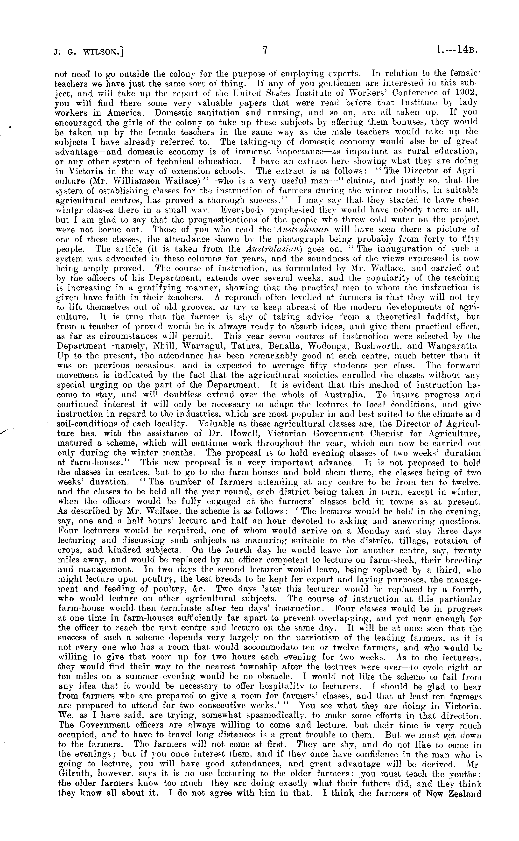 not need to go outside the colony for the purpose of employing experts. In relation to the female' teachers we have just the same sort of thing. If any of you gentlemen are interested in this subject, and will take up the report of the United States Institute of Workers' Conference of 1902, you will find there some very valuable papers that were read before that Institute by lady workers in America. Domestic sanitation and nursing, and so on, are all taken up. If you encouraged the girls of the colony to take up these subjects by offering them bonuses, they would be taken up by the female teachers in the same way as the male teachers would take up the subjects I have already referred to. The taking-up of domestic economy would also be of great advantage —and domestic econorm - is of immense importance —as important as rural education, or any other system of technical education. I have an extract here snowing what they are doing in Victoria in the way of extension schools. The extract is as follows: 'The Director of Agriculture (Mr. Williamson Wallace)" —who is a very useful man —" claims, and justly so, that the system of establishing classes for the instruction of farmers during the winter months, in suitable agricultural centres, has proved a thorough success." I may say that they started to have these winter classes there in a small way. Everybody prophesied they would have nobody there at all, but I am glad to any that the prognostications of the people who threw cold water on the project were not borne out. Those of you who read the Australasian will have seen there a picture of one of these classes, the attendance shown by the photograph being probably from forty to fifty people. The article (it is taken from the Australasian) goes on, " The inauguration of such a system was advocated in these columns for years, and the soundness of the views expressed is now being amply proved. The course of instruction, as formulated by Mr. Wallace, and carried out by the officers of his Department, extends over several weeks, and the popularity of the teaching is increasing in a gratifying manner, showing that the practical men to whom the instruction is given have faith in their teachers. A reproach often levelled at farmers is that they will not try to lift themselves out of old grooves, or try to keep abreast of the modern developments of agriculture. It is truy that the farmer is shy of taking advice from a theoretical faddist, but from a teacher of proved worth he is always ready to absorb ideas, and give them practical effect, as far as circumstances will permit. This year seven centres of instruction were selected by the Department —namely, Nhill, Warragul, Tatura, Benalla, Wodonga, Rushworth, and Wangaratta. Up to the present, the attendance has been remarkably good at each centre, much better than it was on previous occasions, and is expected to average fifty students per class. The forward movement is indicated by the fact that the agricultural societies enrolled the classes without any special urging on the part of the Department. It is evident that this method of instruction has come to stay, and will doubtless extend over the whole of Australia. To insure progress and continued interest it will only be necessary to adapt the lectures to local conditions, and give instruction in regard to the industries, which are most popular in and best suited to the climate and soil-conditions of each locality. Valuable as these agricultural classes are, the Director of Agriculture has, with the assistance of Dr. Howell, Victorian Government Chemist for Agriculture, matured a scheme, which will continue work throughout the year, which can now be carried out only during the winter months. The proposal is to hold evening classes of two weeks' duration at farm-houses." This new proposal is a very important advance. It is not proposed to hold the classes in centres, but to go to the farm-houses and hold them there, the classes being of two weeks' duration. " The number of farmers attending at any centre to be from ten to twelve, and the classes to be held all the year round, each district being taken in turn, except in winter, when the officers would be fully engaged at the farmers' classes held in towns as at present. As described bj' Mr. Wallace, the scheme is as follows: ' The lectures would be held in the evening, say, one and a half hours' lecture and half an hour devoted to asking and answering questions. Four lecturers would be required, one of whom would arrive on a Monday and stay three days lecturing and discussing such subjects as manuring suitable to the district, tillage, rotation of crops, and kindred subjects. On the fourth day he would leave for another centre, say, twenty miles away, and would be replaced by an officer competent to lecture on farm-stock, their breeding and management. In two days the second lecturer would leave, being replaced by a third, who might lecture upon poultry, the best breeds to be kept for export and laying purposes, the management and feeding of poultry, &c. Two days later this lecturer would be replaced by a fourth, who would lecture on other agricultural subjects. The course of instruction at this particular farm-house would then terminate after ten days' instruction. Four classes would be in progress at one time in farm-houses sufficiently far apart to prevent overlapping, and yet near enough for the officer to reach the next centre and lecture on the same day. It will be at once seen that the success of such a. scheme depends very largely on the patriotism of the leading farmers, as it is not every one who has a room that would accommodate ten or twelve farmers, and who would be willing to give that room up for two hours each evening for two weeks. As to the lecturers, they would find their way to the nearest township after the lectures were over —to cycle eight or ten miles on a summer evening would be no obstacle. I would not like the sch