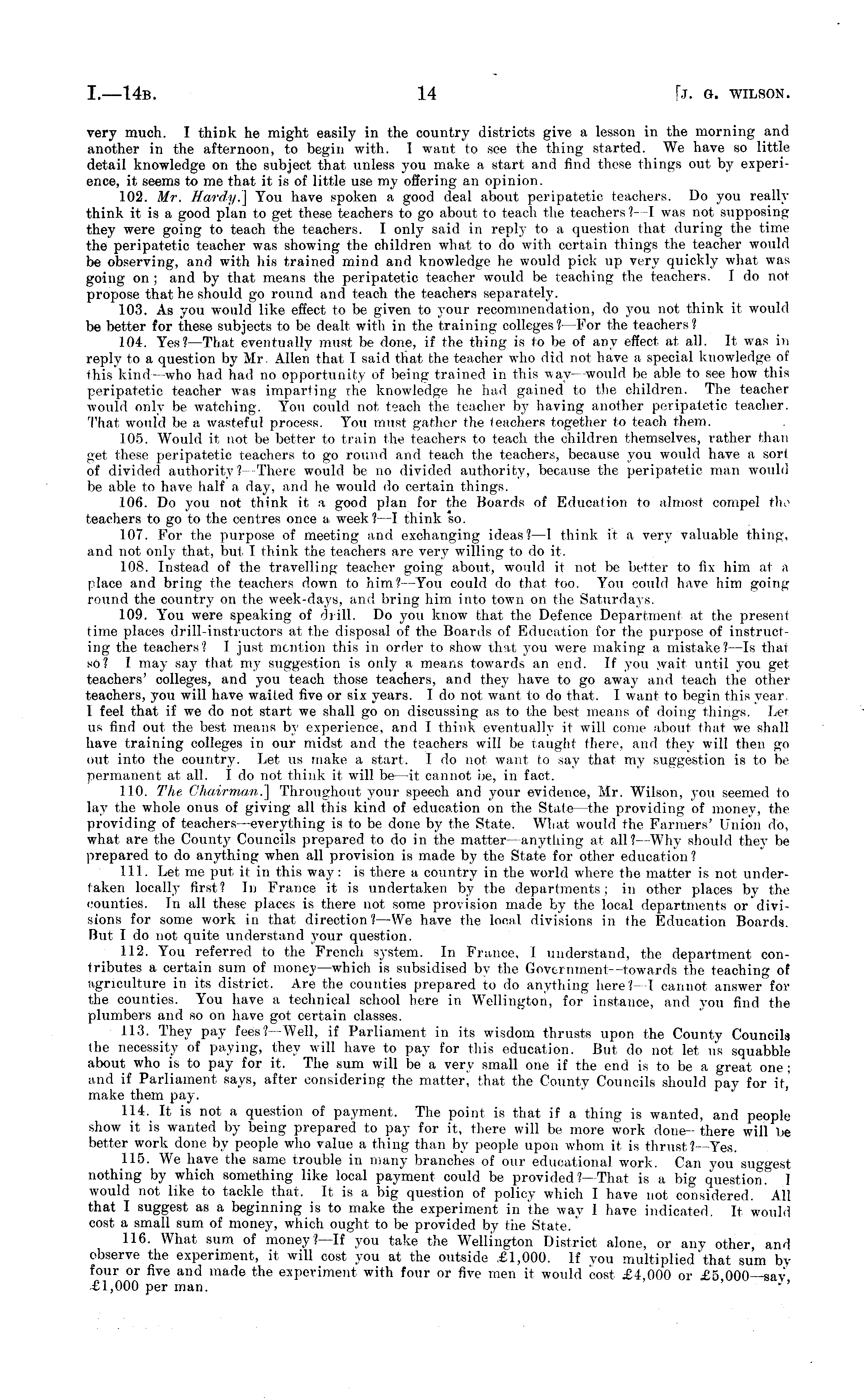 very much. I think he might easily in the country districts give a lesson in the morning and another in the afternoon, to begin with. I want to see the thing started. We have so little detail knowledge on the subject that unless you make a start and find these things out by experience, it seems to me that it is of little use my offering an opinion. 102. Mr. Hardy.] You have spoken a good deal about peripatetic teachers. Do you really think it is a good plan to get these teachers to go about to teach the teachers?- I was not supposing they were going to teach the teachers. I only said in reply to a question that during the time the peripatetic teacher was showing the children what to do with certain things the teacher would be observing, and with his trained mind and knowledge he would pick up very quickly what was going on; and by that means the peripatetic teacher would be teaching the teachers. I do not propose that he should go round and teach the teachers separately. 103. As you would like effect to be given to your recommendation, do you not think it would be better for these subjects to be dealt with in the training colleges ? —For the teachers ? 104. Yes? —That eventually must be done, if the thing is to be of any effect at all. It was in reply to a question by Mr. Allen that I said that the teacher who did not have a special knowledge of this kind—who had had no opportunity of being trained in this way —would be able to see how this peripatetic teacher was imparting rhe knowledge he had gained to the children. The teacher would only be watching. You could not teach the teacher by having another peripatetic teacher. That would be a wasteful process. You must gather the teachers together to teach them. 105. Would it not be better to train the teachers to teach the children themselves, rather than get these peripatetic teachers to go round and teach the teachers, because you would have a sort of divided authority? There would be no divided authority, because the peripatetic man would be able to have half a day-, and he would do certain things. 106. Do you not think it a good plan for the Boards of Education to almost compel the teachers to go to the centres once a week? —I think so. 107. For the purpose of meeting and exchanging ideas? —1 think it a very valuable thing, and not only that, but I think the teachers are very willing to do it. 108. Instead of the travelling teacher going about, would it not be better to fix him at a place and bring the teachers down to him? —You could do that too. You could have him going round the country on the week-days, and bring him into town on the Saturdays. 109. You were speaking of drill. Do you know that the Defence Department at the present time places drill-instructors at the disposal of the Boards of Education for the purpose of instructing the teachers? I just mention this in order to show that v r ou were making a mistake? —Is that so? I msv nay that my suggestion is only a means towards an end. If you .wait until you get teachers' colleges, and you teach those teachers, and they have to go awa3 - and teach the other teachers, you will have waited five or six years. Ido not want to do that. I want to begin this year. 1 feel that if we do not start we shall go on discussing as to the best means of doing things. Let us find out the best means by experience, and I think eventually it will come about that we shall have training colleges in our midst and the teachers will be taught there, and they will then go out into the country. Let us make a start. I do not want to say that my suggestion is to be permanent at all. Ido not think it will be —it cannot be, in fact. 110. The Chairman.] Throughout your speech and your evidence, Mr. Wilson, you seemed to lay the whole onus of giving all this kind of education on the State —the providing of money, the providing of teachers —everything is to be done by the State. What would the Farmers' Union do, what are the County Councils prepared to do in the matter —anything at all!— Why should they be prepared to do anything when all provision is made by the State for other education ? 111. Let me put it in this way: is there a country in the world where the matter is not undertaken locally first? In France it is undertaken by the departments; in other places by the counties. In all these places is there not some provision made by the local departments or divisions for some work in that direction? —We have the local divisions in the Education Boards. But I do not quite understand your question. 112. You referred to the French system. In France, I understand, the department contributes a certain sum of money —which is subsidised by the Government--towards the teaching of agriculture in its district. Are the counties prepared to do anything here?- I cannot answer for (lie counties. You have a technical school here in Wellington, for instance, and you find the plumbers and so on have got certain classes. 113. They pay fees?— Well, if Parliament in its wisdom thrusts upon the County Councils the necessity of paying, they will have to pay for this education. But do not let us squabble about who is to pay for it. The sum will be a very small one if the end is to be a great one ; and if Parliament says, after considering the matter! that the County Councils should pay for it,' make them pay. 114. It is not a question of payment. The point is that if a thing is wanted, and people show it is wanted by being prepared to pay for it, there will be more work done- there will lie better work done by people who value a thing than by people upon whom it is thrust?-Yes. 115. We have the same trouble in many branches of our educational work. Can you suggest nothing by which something like local payment could be provided ?-That is a big question. I would not like to tackle that. It is a big question of policy which I have not considered. All that I suggest as a beginning is to make the experimen