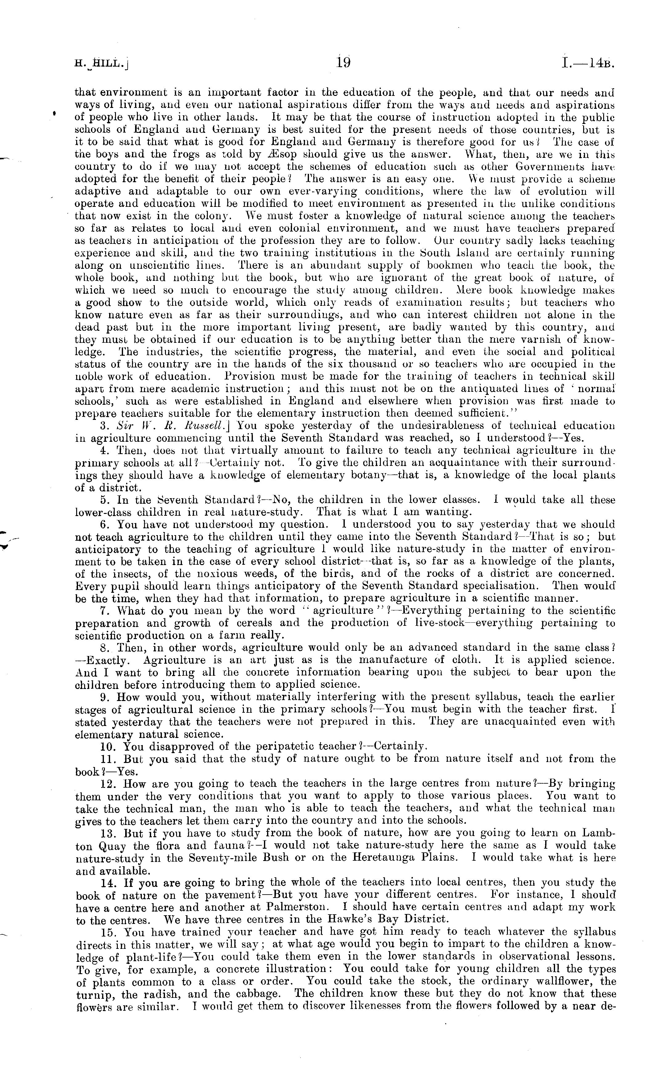 that environment is an important factor in the education of the people, and that our needs and ways of living, and even our national aspirations differ from the ways aud needs and aspirations of people who live in other lands. It may be that the course of instruction adopted in the public schools of England and Germany is best suited for the present needs of those countries, but is it to be said that what is good for England and Germany is therefore good for us ? The case of the boys and the frogs as told by iEsop should give us the answer. What, then, are we in this country to do if we may not accept the schemes of education such as other Governments have adopted for the benefit of their people? The answer is an easy one. We must provide a scheme adaptive and adaptable to our own ever-varying conditions, where the law of evolution will operate and education will be modified to meet environment as presented in the unlike conditions that now exist in the colony. We must foster a knowledge of natural science among the teachers so far as relates to local and even colonial environment, and we must have teachers prepared as teachers in anticipation of the profession they are to follow. Our country sadly lacks teaching experience and skill, and the two training institutions in the South Island are certainly running along on unscientific lines. There is an abundant suppl3' of bookmen who leach the book, the whole book, and nothing but the book, but who are ignorant of the great book of nature, of which we need so much to encourage the study among children. Mere book knowledge makes a good show to the outside world, which only reads of examination results; but teachers who know nature even as far as their surroundings, aud who can interest children not alone in the dead past but in the more important living present, are badly wanted by this country, and they must be obtained if our education is to be anything better than the mere varnish of knowledge. The industries, the scientific progress, the material, and even the social and political status of the country are in the hands of the six thousand or so teachers who are occupied in the noble work of education. Provision must be made for the training of teachers in technical skill apart from mere academic instruction; and this must not be on the antiquated lines of ' normal schools,' such as were established in England and elsewhere when provision was first made to prepare teachers suitable for the elementary instruction then deemed sufficient." 3. Sir W. It. Russell.] You spoke yesterday of the undesirableness of technical education in agriculture commencing until the Seventh Standard was reached, so I understood ? —Yes. 4. Then, does not that virtually amount to failure to teach any technical agriculture in the primary schools at all? -Certainly not. To give the children an acquaintance with their surroundings they should have a knowledge of elementary botany —that is, a knowledge of the local plants of a district. 5. In the Seventh Standard? —No, the children in the lower classes. I would take all these lower-class children in real nature-study. That is what I am wanting. 6. You have not understood my question. 1 understood you to say yesterday that we should not teach agriculture to the children until they came into the Seventh Standard?- That is so; but anticipatory to the teaching of agriculture 1 would like nature-study in the matter of environment to be taken in the case of every school district- that is, so far as a knowledge of the plants, of the insects, of the noxious weeds, of the birds, and of the rocks of a district are concerned. Every pupil should learn things anticipatory of the Seventh Standard specialisation. Then would be the time, when they had that information, to prepare agriculture in a scientific manner. 7. What do you mean by the word "agriculture"? —Everything pertaining to the scientific preparation and growth of cereals and the production of live-stock —everything pertaining to scientific production on a farm really. 8. Then, in other words, agriculture would only be an advanced standard in the same class? —Exactly. Agriculture is an art just as is the manufacture of cloth. It is applied science. And I want to bring all the concrete information bearing upon the subject to bear upon the children before introducing them to applied science. 9. How would you, without materially interfering with the present syllabus, teach the earlier stages of agricultural science in the primary schools ? —You must begin with the teacher first. I stated yesterday that the teachers were not prepared in this. They are unacquainted even with elementary natural science. 10. You disapproved of the peripatetic teacher? —Certainly. 11. But you said that the study of nature ought to be from nature itself and not from the book?— Yes. 12. How are you going to teach the teachers in the large centres from nature? —By bringing them under the very conditions that you want to apply to those various places. You want to take the technical man, the man who is able to teach the teachers, and what the technical man gives to the teachers let them carry into the country and into the schools. 13. But if you have to study from the book of nature, how are you going to learn on Lambton Quay the flora and fauna ? —I would not take nature-study here the same as I would take nature-study in the Seventy-mile Bush or on the Heretaunga Plains. I would take what is here and available. 14. If you are going to bring the whole of the teachers into local centres, then you study the book of nature on the pavement?— But you have your different centres. For instance, I should have a centre here and another at Palmerston. I should have certain centres and adapt my work to the centres. We have three centres in the Hawke's Bay District. 15. You have trained your teacher and have got him ready to teach whatever the syllabus directs in this matter, we will sa