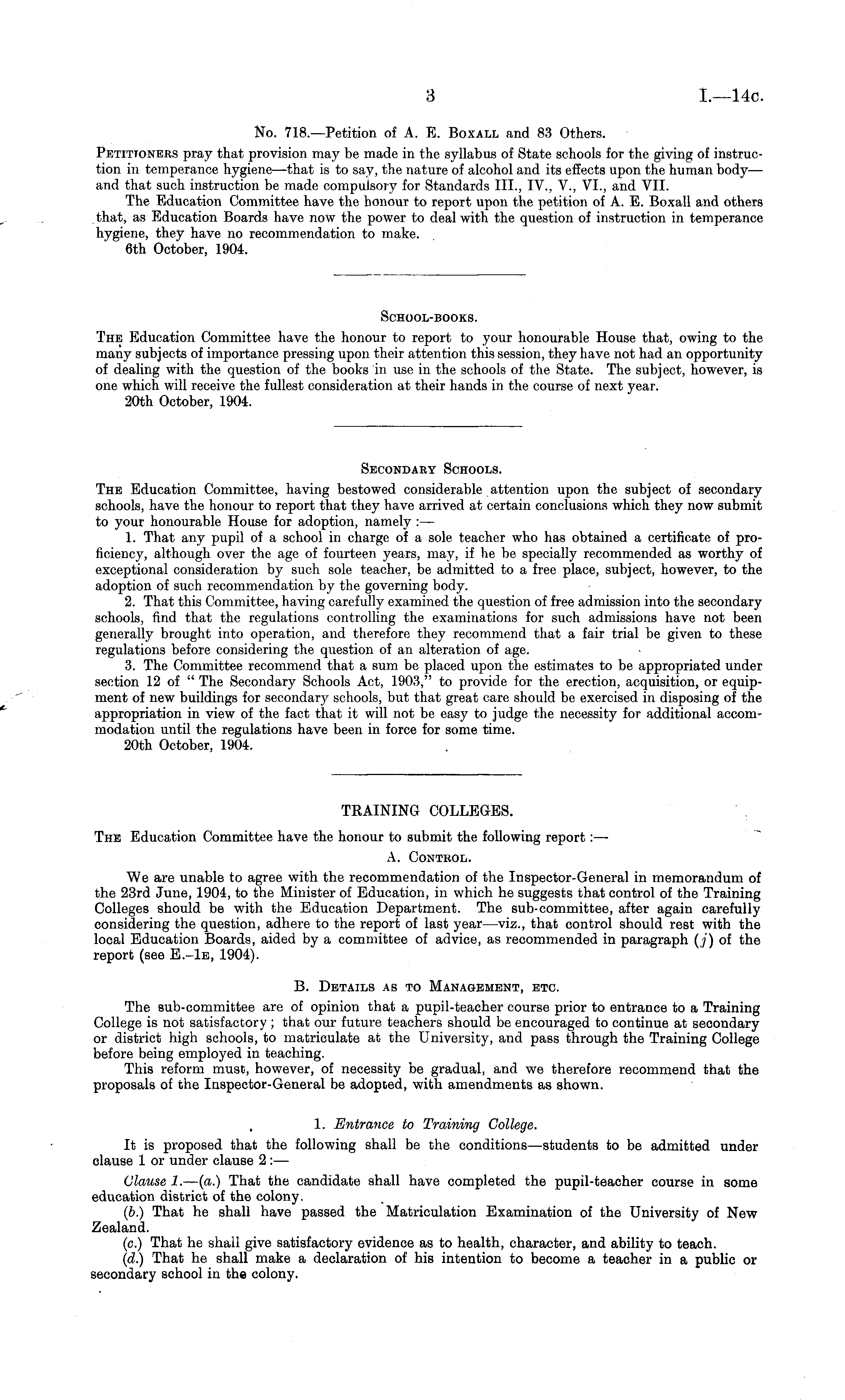 No. 718.—Petition of A. E. Boxall and 83 Others. Petitioners pray that provision may be made in the syllabus of State schools for the giving of instruction in temperance hygiene—that is to say, the nature of alcohol and its effects upon the human body — and that such instruction be made compulsory for Standards 111., IV., V., VI., and VII. The Education Committee have the honour to report upon the petition of A. E. Boxall and others that, as Education Boards have now the power to deal with the question of instruction in temperance hygiene, they have no recommendation to make. 6th October, 1904.