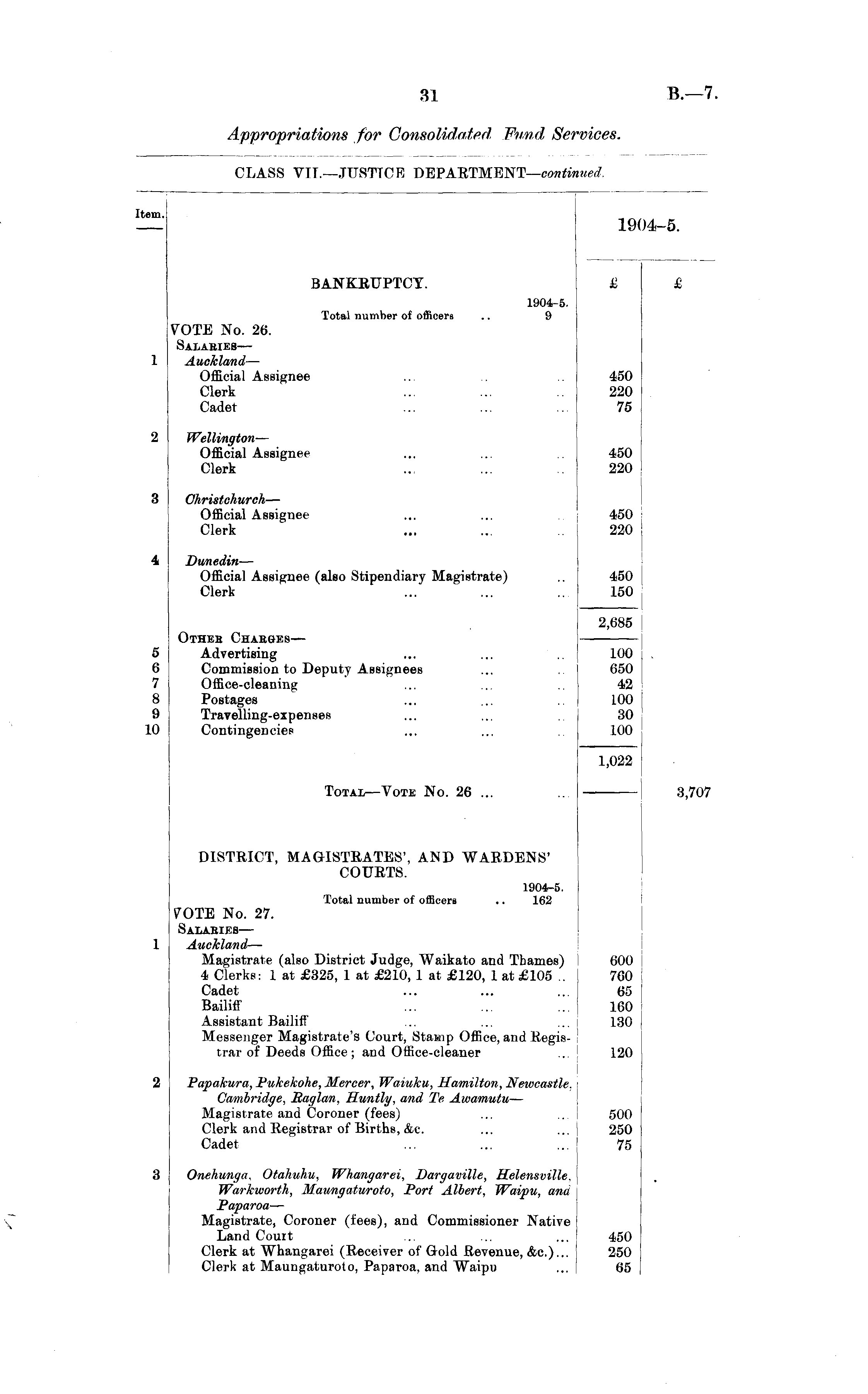 Item. 19( '4-5. BANKRUPTCY. £ £ 1904-5. Total number of officers .. 9 VOTE No. 26. Salaries — Auckland — Official Assignee Clerk Cadet 450 220 75 Wellington — Official Assignee Clerk 450 220 Christchurch — Official Assignee Clerk 450 220 Dunedin— Official Assignee (also Stipendiary Magistrate) Clerk 450 150 2,685 5 6 7 8 9 10 Other Charges— Advertising Commission to Deputy Assignees Office-cleaning Postages Travelling-expenses Contingencies 100 650 42 100 30 100 Total—Vote No. 26 ... 1,022 3,707 DISTRICT, MAGISTRATES', AND WARDENS' COURTS. 1904-5. Total number of officers .. 162 VOTE No. 27. Salaries — Auckland — Magistrate (also District Judge, Waikato and Thames) 4 Clerks: 1 at £325, 1 at £210, 1 at £120, 1 at £105 .. Cadet Bailiff Assistant Bailiff Messenger Magistrate's Court, Stamp Office, and Registrar of Deeds Office; and Office-cleaner 600 760 65 160 130 120 Papakura, Pukekohe, Mercer, Waiuku, Hamilton, Newcastle, Cambridge, Raglan, Huntly, and Te, Awamutu — Magistrate and Coroner (fees) Clerk and Registrar of Births, Ac. Cadet 500 250 75 Onehunga. Otahuhu, Whangarei, Dargaville, Helensville. Warkworth, Maungaturoto, Port Albert, Waipu, ana Paparoa — Magistrate, Coroner (fees), and Commissioner Native Land Court Clerk at Whangarei (Receiver of Gold Revenue, Ac.)... Clerk at Maungaturoto, Paparoa, and Waipu 450 250 65