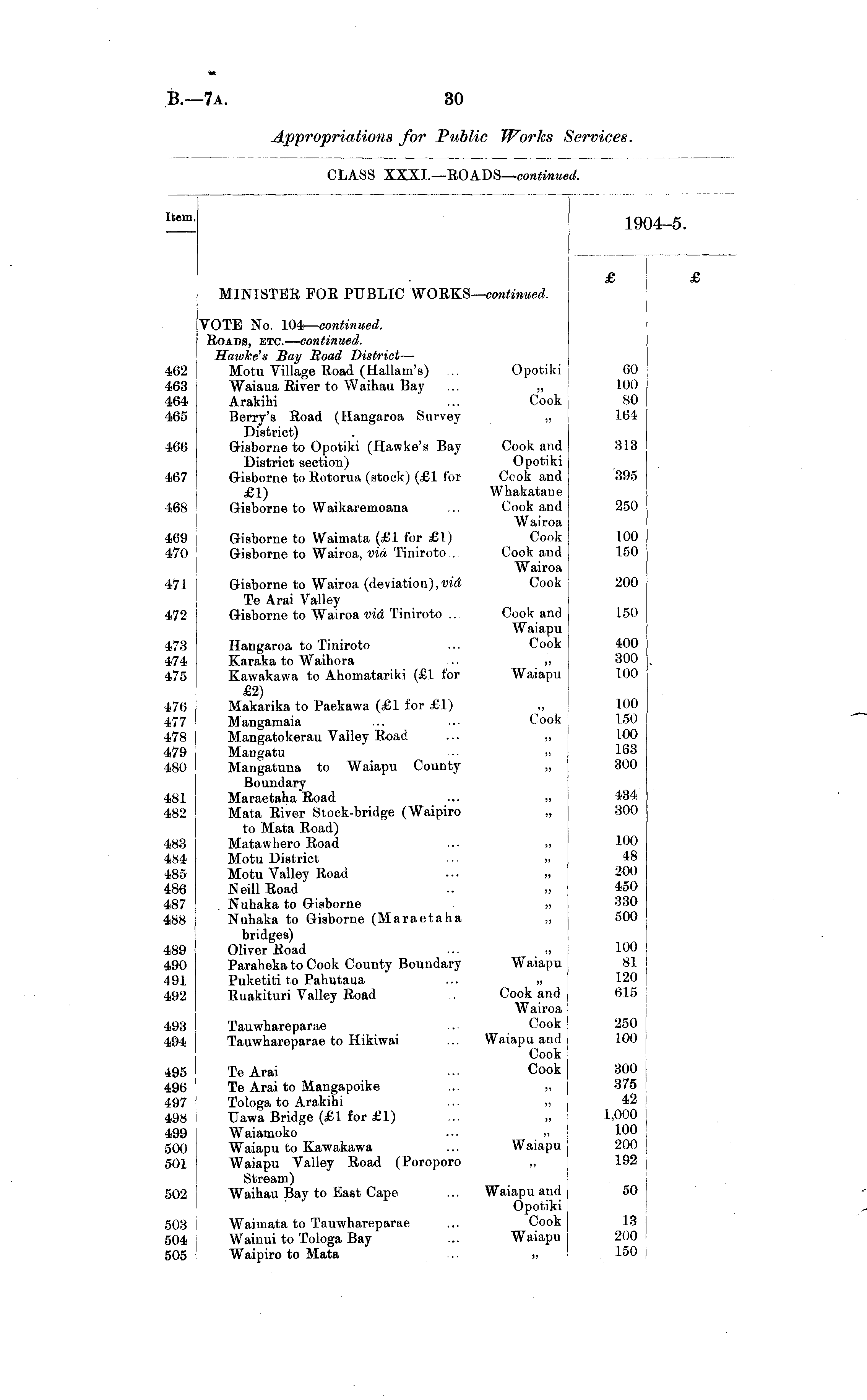 Item.j 191 34-5. £ I MINISTER FOR PUBLIC WORKS— continued. 462 463 464 465 466 467 468 469 470 471 472 473 474 475 476 477 478 479 480 481 482 VOTE No. 104s—continued. Roads, etc. — continued. Hawke's Bay Road District — Motu Village Road (Hallam's) ... Opotiki Waiaua River to Waihau Bay ... „ Arakihi ... Cook Berry's Road (Hangaroa Survey ,, District) Gisborne to Opotiki (Hawke's Bay Cook and District section) Opotiki Gisborne to Rotorua (stock) (£1 for Cook and £1) Whakatane Gisborne to Waikaremoana ... Cook and Wairoa Gisborne to Waimata (£1 for £1) Cook Gisborne to Wairoa, vid Tiniroto . Cook and Wairoa Gisborne to Wairoa (deviation), vid Cook Te Arai Valley Gisborne to Wairoa vid Tiniroto .. Cook and Waiapu Hangaroa to Tiniroto ... Cook Karaka to Waihora .. ,j Kawakawa to Ahomatariki (£1 for Waiapu £2) Makarika to Paekawa (£1 for £1) „ Mangamaia ... ••• Cook Mangatokerau Valley Road ... ,, Mangatu ■ •■ >■ Mangatuna to Waiapu County „ Boundary Maraetaha Road ... » Mata River Stock-bridge (Waipiro „ to Mata Road) Matawhero Road .., jj Motu District ••■ >■ Motu Valley Road ... „ Neill Road .. jj Nuhaka to Gisborne ,j Nuhaka to Gisborne (Maraetaha „ bridges) Oliver Road ... „ Paraheka to Cook County Boundary Waiapu Puketiti to Pahutaua ... „ Ruakituri Valley Road ... Cook and Wairoa Tauwhareparae ... Cook Tauwhareparae to Hikiwai ... Waiapu and Cook TeArai ... Cook Te Arai to Mangapoike ... „ Tologa to Arakihi ... ,, Uawa Bridge (£1 for £1) ... , ; Waiamoko ... ji Waiapu to Kawakawa ... Waiapu Waiapu Valley Road (Poroporo „ Stream) Waihau Bay to East Cape ... Waiapu and Opotiki Waimata to Tauwhareparae ... Cook Wainui to Tologa Bay ... Waiapu Waipiro to Mata ... „ 60 100 80 164 313 '395 250 100 150 200 150 400 300 100 100 150 LOO 163 300 434 300 483 484 485 486 487 488 100 48 200 450 330 500 489 490 491 492 LOO 81 120 615 493 494 250 100 495 496 497 498 499 500 501 300 375 42 1,000 100 200 192 502 50 503 504 505 13 200 150