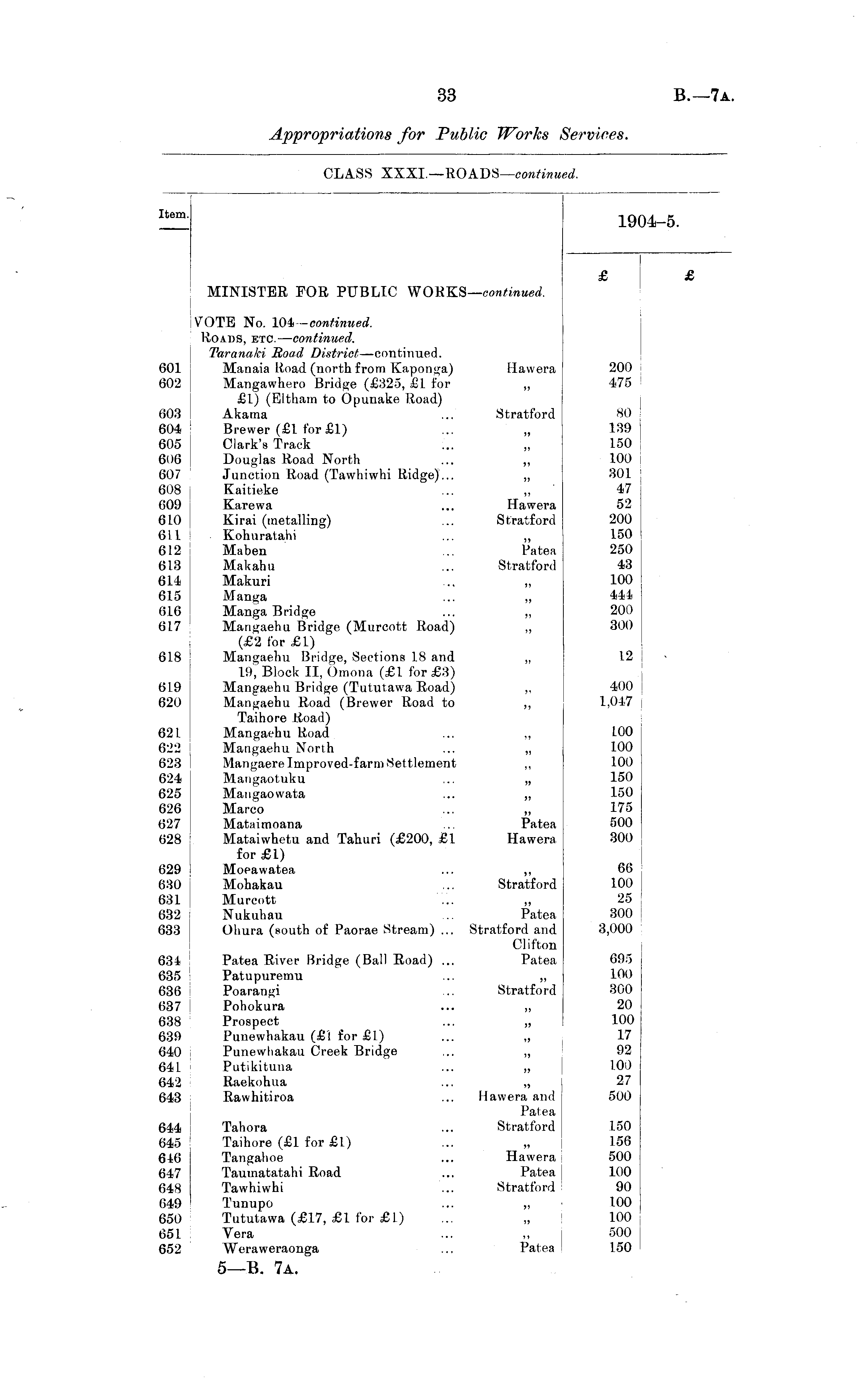 ;em. 1904-5. 601 602 MINISTER FOR PUBLIC WORKS— continued. VOTE No. 104 -continued. Roads, etc. — continued. Taranaki Road District —continued. Manaia Road (north from Kaponga) Hawera Mangawhero Bridge (£325, £1 for „ £1) (Eltham to Opunake Road) Akatna ... Stratford Brewer (£1 for £1) Clark's Track ... „ Douglas Road North ... ,, Junction Road (Tawhiwhi Ridge)... „ Kaitieke ... ,, Karewa ... Hawera Kirai (metalling) ... Stratford Kohuratahi ... ,, Maben ... Patea Makahu ... Stratford Makuri ... ,, Manga ... ,, Manga Bridge ... „ Mangaehu Bridge (Murcott Road) ,, (£2 for £1) Mangaehu Bridge, Sections 18 and „ 19, Block II, Omona (£1 for £3) Mangaehu Bridge (Tututawa Road) ,, Mangaehu Road (Brewer Road to ,, Taihore Road) Mangaehu Road ... ,, Mangaehu North ... „ Mangaere Improved-farm Settlement Mangaotuku ... „ Mangaowata ... „ Marco ... „ Mataimoana ... Patea Mataiwhetu and Tahuri (£200, £1 Hawera for £1) Moeawatea ... ,, Mohakau ... Stratford Murcott ... „ Nukuhau .. Patea Ohura (south of Paorae Stream) ... Stratford and Clifton Patea River Bridge (Ball Road) ... Patea Patupuremu ... „ Poarangi .. Stratford Pohokura ... ,, Prospect ... „ Punewhakau (£t for£l) ... „ Punewhakau Creek Bridge ... ,, Putikituna ... „ Raekohua ... „ Rawhitiroa ... Hawera and Patea Tahora ... Stratford Taihore (£1 for £1) Tangahoe ... Hawera Taumatatahi Road ... Patea Tawhiwhi ... Stratford Tunupo ... „ Tututawa (£17, £1 for £1) Vera Weraweraonga ... Patea 200 475 £ 603 604 605 606 607 608 609 610 611 612 613 614 615 616 617 SO 139 150 100 301 47 52 200 150 250 43 100 444 200 300 618 12 619 620 400 1,047 621 622 623 624 625 626 627 628 100 100 100 150 150 175 500 300 629 630 631 632 633 66 100 25 300 3,000 634 635 636 637 638 639 640 641 642 643 695 100 300 20 100 17 92 100 27 500 644 645 616 647 648 649 650 651 652 150 156 500 100 90 100 100 500 150