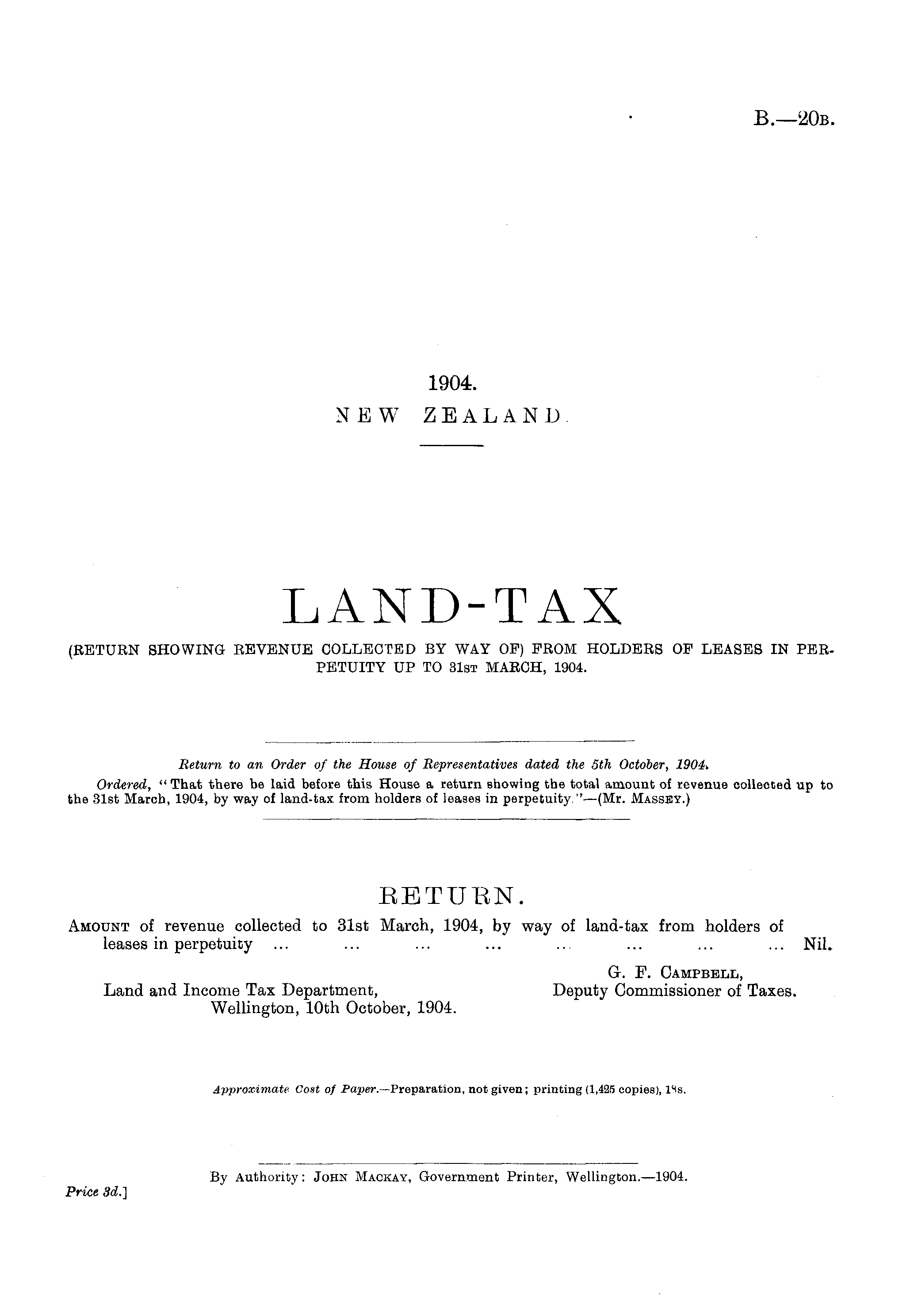 EETUM. Amount of revenue collected to 31st March, 1904, by way of land-tax from holders of leases in perpetuity ... ... ... ... ... ... ... ... Nil. G. F. Campbell, Land and Income Tax Department, Deputy Commissioner of Taxes. Wellington, 10th October, 1904. Approximate Cost of Paper. —Preparation, not given; printing (1,425 copies), lHs.