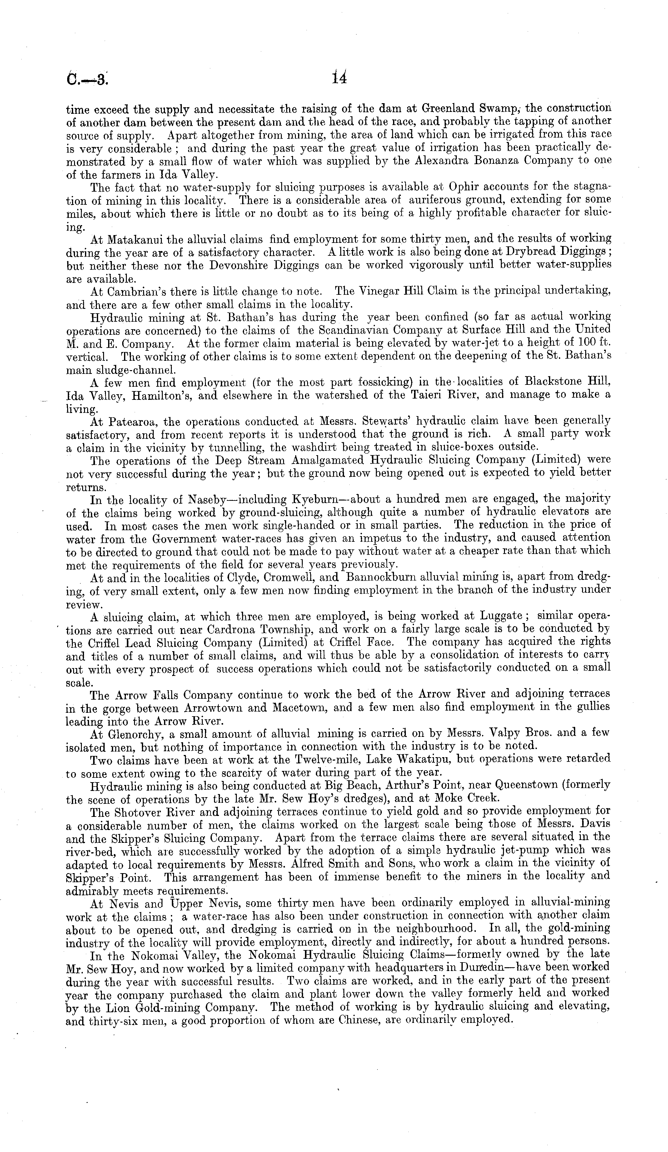 time exceed the supply and necessitate the raising of the dam at Greenland Swamp, the construction of another dam between the present dam and the head of the race, and probably the tapping of another source of supply. Apart altogether from mining, the area of land which can be irrigated from this race is very considerable ; and during the past year the great value of irrigation has been practically demonstrated by a small flow of water which was supplied by the Alexandra Bonanza Company to one of the farmers in Ida Valley. The fact that no water-supply for sluicing purposes is available at Ophir accounts for the stagnation of mining in this locality. There is a considerable area of auriferous ground, extending for some miles, about which there is little or no doubt as to its being of a highly profitable character for ingAt Matakanui the alluvial claims find employment for some thirty men, and the results of working during the year are of a satisfactory character. A little work is also being done at Drybread Diggings ; but neither these nor the Devonshire Diggings can be worked vigorously until better water-supplies are available. At Cambrian's there is little change to note. The Vinegar Hill Claim is the principal undertaking, and there are a few other small claims in the locality. Hydraulic mining at St. Bathan's has during the year been confined (so far as actual working operations are concerned) to the claims of the Scandinavian Company at Surface Hill and the United M. and E. Company. At the former claim material is being elevated by water-jet to a height of 100 ft. vertical. The working of other claims is to some extent dependent on the deepening of the St. Bathan's main sludge-channel. A few men find employment (for the most part fossicking) in the localities of Blackstone Hill Ida Valley, Hamilton's, and elsewhere in the watershed of the Taieri River, and manage to make a living. At Patearoa, the operations conducted at Messrs. Stewarts' hydraulic claim have been generally satisfactory, and from recent reports it is understood that the ground is rich. A small party work a claim in the vicinity by tunnelling, the washdirt being treated in sluice-boxes outside. The operations of the Deep Stream Amalgamated Hydraulic Sluicing Company (Limited) were not very successful during the year; but the ground now being opened out is expected to yield better returns. In the locality of Naseby—including Kyeburn—about a hundred men are engaged, the majority of the claims being worked by ground-sluicing, although quite a number of hydraulic elevators are used. In most cases the men work single-handed or in small parties. The reduction in the price of water from the Government water-races has given an impetus to the industry, and caused attention to be directed to ground that could not be made to pay without water at a cheaper rate than that which met the requirements of the field for several years previously. At and in the localities of Clyde, Cromwell, and Bannockburn alluvial mining is, apart from dredging, of very small extent, only a few men now finding employment, in the branch of the industry under review. A sluicing claim, at which three men are employed, is being worked at Luggate ; similar operations are carried out near Cardrona Township, and work on a fairly large scale is to be conducted by the Criffel Lead Sluicing Company (Limited) at Criffel Face. The company has acquired the rights and titles of a number of small claims, and will thus be able by a consolidation of interests to cam out with every prospect of success operations which could not be satisfactorily conducted on a smaJl scale. The Arrow Falls Company continue to work the bed of the Arrow River and adjoining terraces in the gorge between Arrowtown and Macetown, and a few men also find employment in the gullies leading into the Arrow River. At Glenorchy, a small amount of alluvial mining is carried on by Messrs. Valpy Bros, and a few isolated men, but nothing of importance in connection with the industry is to be noted. Two claims have been at work at the Twelve-mile, Lake Wakatipu, but operations were retarded to some extent owing to the scarcity of water during part of the year. Hydraulic mining is also being conducted at Big Beach, Arthur's Point, near Queenstown (formerly the scene of operations by the late Mr. Sew Hoy's dredges), and at Moke Creek. The Shotover River and adjoining terraces continue to yield gold and so provide employment for a considerable number of men, the claims worked on the largest scale being those of Messrs. Davis and the Skipper's Sluicing Company. Apart from the terrace claims there are several situated in the river-bed, which are successfully worked by the adoption of a simple hydraulic jet-pump which was adapted to local requirements by Messrs. Alfred Smith and Sons, who work a claim in the vicinity of Skipper's Point. This arrangement has been of immense benefit to the miners in the locality and admirably meets requirements. At Nevis and Upper Nevis, some thirty men have been ordinarily employed in alluvial-mining work at the claims ; a water-race has also been under construction in connection with another claim about to be opened out, and dredging is carried on in the neighbourhood. In all, the gold-mining industry of the locality will provide employment, directly and indirectly, for about a hundred persons. In'the Nokomai Valley, the Nokomai Hydraulic Sluicing Claims—formerly owned by the late Mr. Sew Hoy, and now worked by a limited company with headquarters in Dunedin— have been worked during the year with successful results. Two claims are worked, and in the early part of the present year the company purchased the claim and plant lower down the valley formerly held and worked by the Lion Gold-mining Company. The method of working is by hydraulic sluicing and elevating, and thirty-six men, a good proportion of whom are Chinese, are ordinarily employed.
