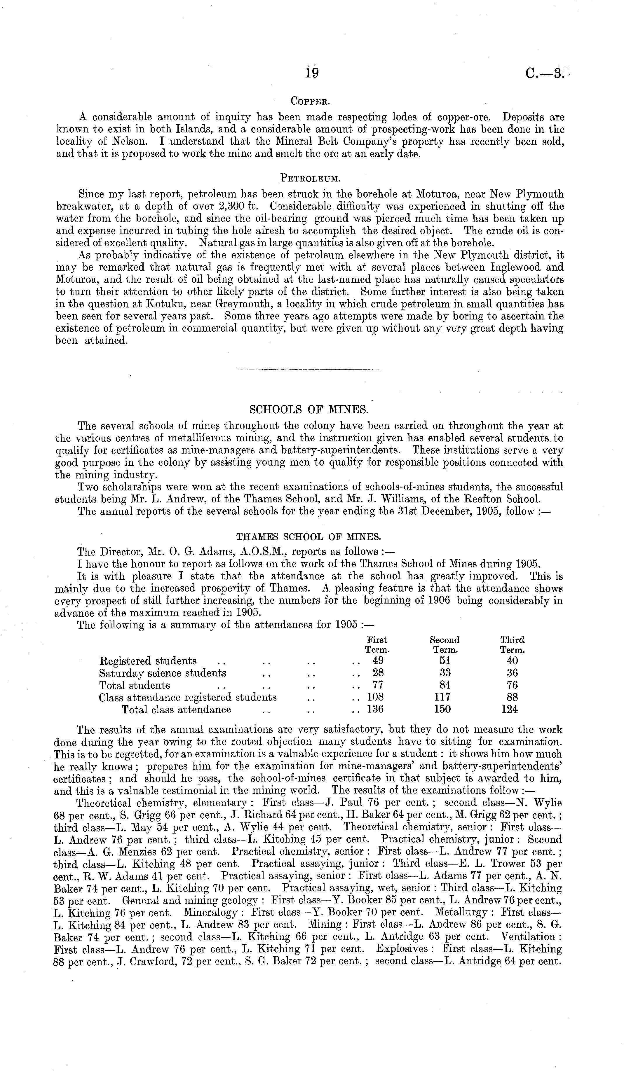 SCHOOLS OF MINES. The several schools of mines throughout the colony have been carried on throughout the year at the various centres of metalliferous mining, and the instruction given has enabled several students.to qualify for certificates as mine-managers and battery-superintendents. These institutions serve a very good purpose in the colony by assisting young men to qualify for responsible positions connected with the mining industry. Two scholarships were won at the recent examinations of schools-of-mines students, the successful students being Mr. L. Andrew, of the Thames School, and Mr. J. Williams, of the Reefton School. The annual reports of the several schools for the year ending the 31st December, 1905, follow : — THAMES SCHOOL OF MINES. The Director, Mr. 0. G. Adams, A.0.5.M., reports as follows : — I have the honour to report as follows on the work of the Thames School of Mines during 1905. It is with pleasure I state that the attendance at the school has greatly improved. This is mainly due to the increased prosperity of Thames. A pleasing feature is that the attendance shows every prospect of still farther increasing, the numbers for the beginning of 1906 being considerably in advance of the maximum reached in 1905. The following is a summary of the attendances for 1905 : — First Second Third Term. Term. Term. Registered students .. .. .. .. 49 51 40 Saturday science students .. .. 28 33 36 Total students .. .. .. ..77 84 76 Class attendance registered students .. .. 108 117 88 Total class attendance .. .. .. 136 150 124 The results of the annual examinations are very satisfactory, but they do not measure the work done during the year owing to the rooted objection many students have to sitting for examination. This is to be regretted, for an examination is a valuable experience for a student: it shows him how much he really knows ; prepares him for the examination for mine-managers' and battery-superintendents' certificates ; and should he pass, the school-of-mines certificate in that subject is awarded to him, and this is a valuable testimonial in the mining world. The results of the examinations follow : — Theoretical chemistry, elementary : First class —J. Paul 76 per cent. ; second class—N. Wylie 68 per cent., S. Grigg 66 per cent., J. Richard 64 per cent., H. Baker 64 per cent., M. Grigg 62 per cent. ; third class —L. May 54 per cent., A. Wylie 44 per cent. Theoretical chemistry, senior : First class— L. Andrew 76 per cent. ; third class —L. Kitching 45 per cent. Practical chemistry, junior : Second c l ass —A. G. Menzies 62 per cent. Practical chemistry, senior : First class—L. Andrew 77 per cent. ; third class —L. Kitching 48 per cent. Practical assaying, junior : Third class—E. L. Trower 53 per cent., R. W. Adams 41 per cent. Practical assaying, senior : First class —L. Adams 77 per cent., A. N. Baker 74 per cent., L. Kitching 70 per cent. Practical assaying, wet, senior : Third class—L. Kitching 53 per cent. General and mining geology : First class—V. Booker 85 per cent., L. Andrew 76 per cent., L. Kitching 76 per cent. Mineralogy : First class—V. Booker 70 per cent. Metallurgy : First class— L. Kitching 84 per cent., L. Andrew 83 per cent. Mining : First class—L. Andrew 86 per cent., S. G. Baker 74 per cent. ; second class —L. Kitching 66 per cent., L. Antridge 63 per cent. Ventilation : First class —L. Andrew 76 per cent., L. Kitching 71 per cent. Explosives : First class—L. Kitching 88 per cent., J. Crawford, 72 per cent., S. G. Baker 72 per cent. ; second class—L. Antridge 64 per cent.