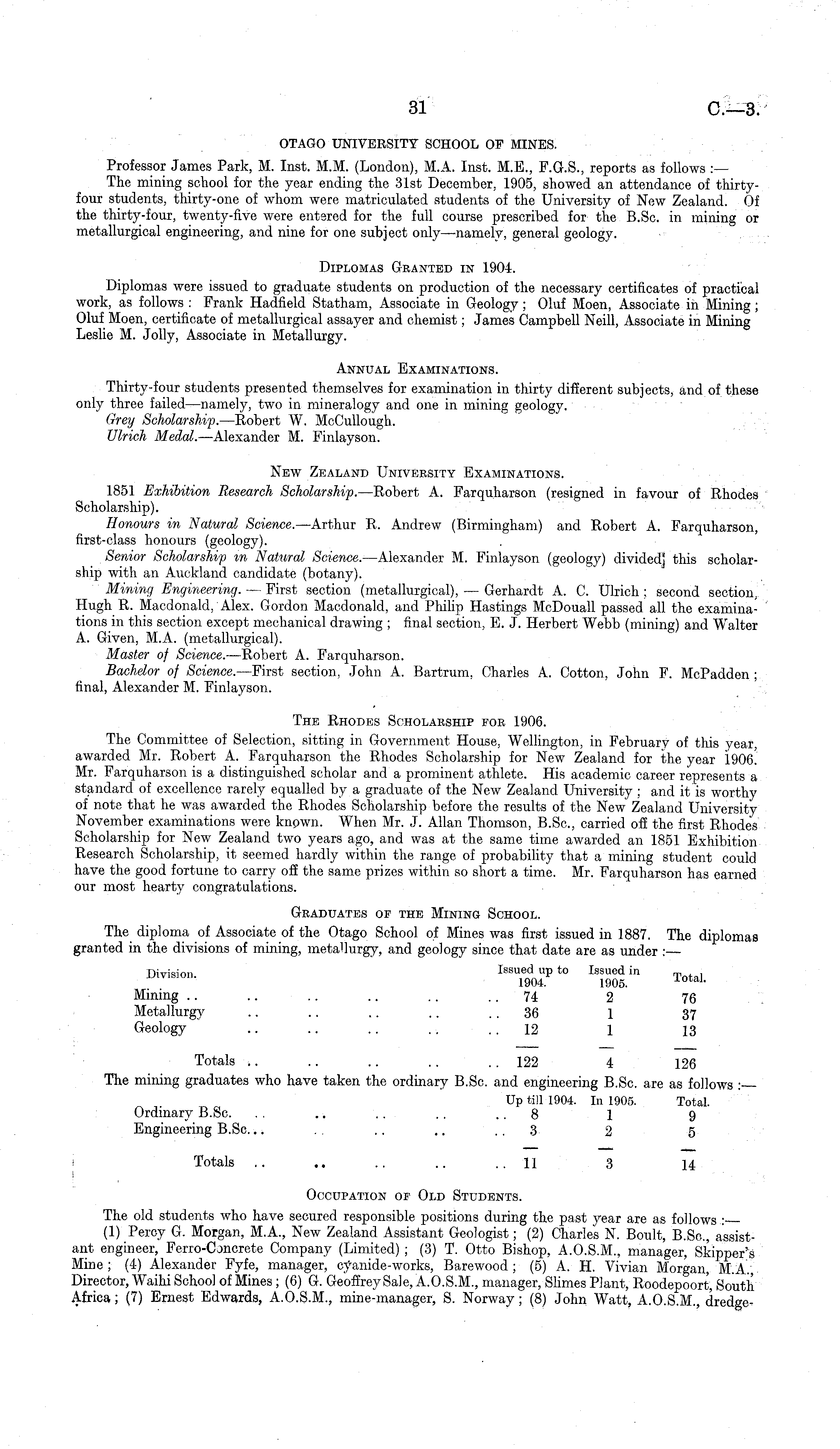 OTAGO UNIVERSITY SCHOOL OF MINES. Professor James Park, M. Inst. M.M. (London), M.A. Inst. M.E., F.G.S., reports as follows :— The mining school for the year ending the 31st December, 1905, showed an attendance of thirtyfour students, thirty-one of whom were matriculated students of the University of New Zealand, Of the thirty-four, twenty-five were entered for the full course prescribed for the B.Sc. in mining or metallurgical engineering, and nine for one subject only —namely, general geology. Diplomas Granted in 1904. Diplomas were issued to graduate students on production of the necessary certificates of practical work, as follows : Frank Hadfield Statham, Associate in Geology ; Oluf Moen, Associate in Mining; Oluf Moen, certificate of metallurgical assayer and chemist; James Campbell Neill, Associate in Mining Leslie M. Jolly, Associate in Metallurgy. Annual Examinations. Thirty-four students presented themselves for examination in thirty different subjects, and of these only three failed —namely, two in mineralogy and one in mining geology. Grey Scholarship. —Robert W. McCullough. Ulrich Medal. —Alexander M. Finlayson. New Zealand University Examinations. 1851 Exhibition Research Scholarship. —Robert A. Farquharson (resigned in favour of Rhodes Scholarship). Honours in Natural Science. —Arthur R. Andrew (Birmingham) and Robert A. Farquharson, first-class honours (geology). Senior Scholarship %n Natural Science. —Alexander M. Finlayson (geology) divided' this scholarship with an Auckland candidate (botany). Mining Engineering. — First section (metallurgical), — Gerhardt A. C. Ulrich ; second section, Hugh R. Macdonald, Alex. Gordon Macdonald, and Philip Hastings McDouall passed all the examinations in this section except mechanical drawing ; final section, E. J. Herbert Webb (mining) and Walter A. Given, M.A. (metallurgical). Master of Science. —Robert A. Farquharson. Bachelor of Science. —First section, John A. Bartrum, Charles A. Cotton, John F. McPadden ; final, Alexander M. Finlayson. The Rhodes Scholarship for 1906. The Committee of Selection, sitting in Government House, Wellington, in February of this year, awarded Mr. Robert A. Farquharson the Rhodes Scholarship for New Zealand for the year 1906' Mr. Farquharson is a distinguished scholar and a prominent athlete. His academic career represents a standard of excellence rarely equalled by a graduate of the New Zealand University : and it is worthy of note that he was awarded the Rhodes Scholarship before the results of the New Zealand University November examinations were knpwn. When Mr. J. Allan Thomson, B.Sc, carried off the first Rhodes Scholarship for New Zealand two years ago, and was at the same time awarded an 1851 Exhibition Research Scholarship, it seemed hardly within the range of probability that a mining student could have the good fortune to carry off the same prizes within so short a time. Mr. Farquharson has earned our most hearty congratulations. Graduates of the Mining School. The diploma of Associate of the Otago School of Mines was first issued in 1887. The diplomas granted in the divisions of mining, metallurgy, and geology since that date are as under :— Division. Issued up to Issued in 1904. 1905. otaL Mining .. .. .. .. .. .. 74 2 76 Metallurgy .. .. .. .. . . 36 1 37 Geology .. .. .. .. .. 12 1 13 Totals .. .. .. .. .. 122 4 126 The mining graduates who have taken the ordinary B.Sc. and engineering B.Sc. are as follows :— Up till 1904. In 1905. Total. Ordinary B.Sc. .. .. .. .. ..8 1 9 Engineering 8.5 c... . . .. .. . . 3 2 5 Totals .. .. .. .. ..11 3 14 Occupation of Old Students. The old students who have secured responsible positions during the past year are as follows : (1) Percy G. Morgan, M.A., New Zealand Assistant Geologist; (2) Charles N. Boult, B.Sc, assistant engineer, Ferro-Concrete Company (Limited) ; (3) T. Otto Bishop, A.0.5.M., manager, Skipper's Mine ; (4) Alexander Fyfe, manager, cyanide-works, Barewood ; (5) A. H. Vivian Morgan, M.A. Director, Waihi School of Mines ; (6) G. Geoffrey Sale, A.0.5.M., manager, Slimes Plant, Roodepoort, South Africa; (7) Ernest Edwards, A.0.5.M., mine-manager, S. Norway; (8) John Watt, A.0.5.M., dredge-