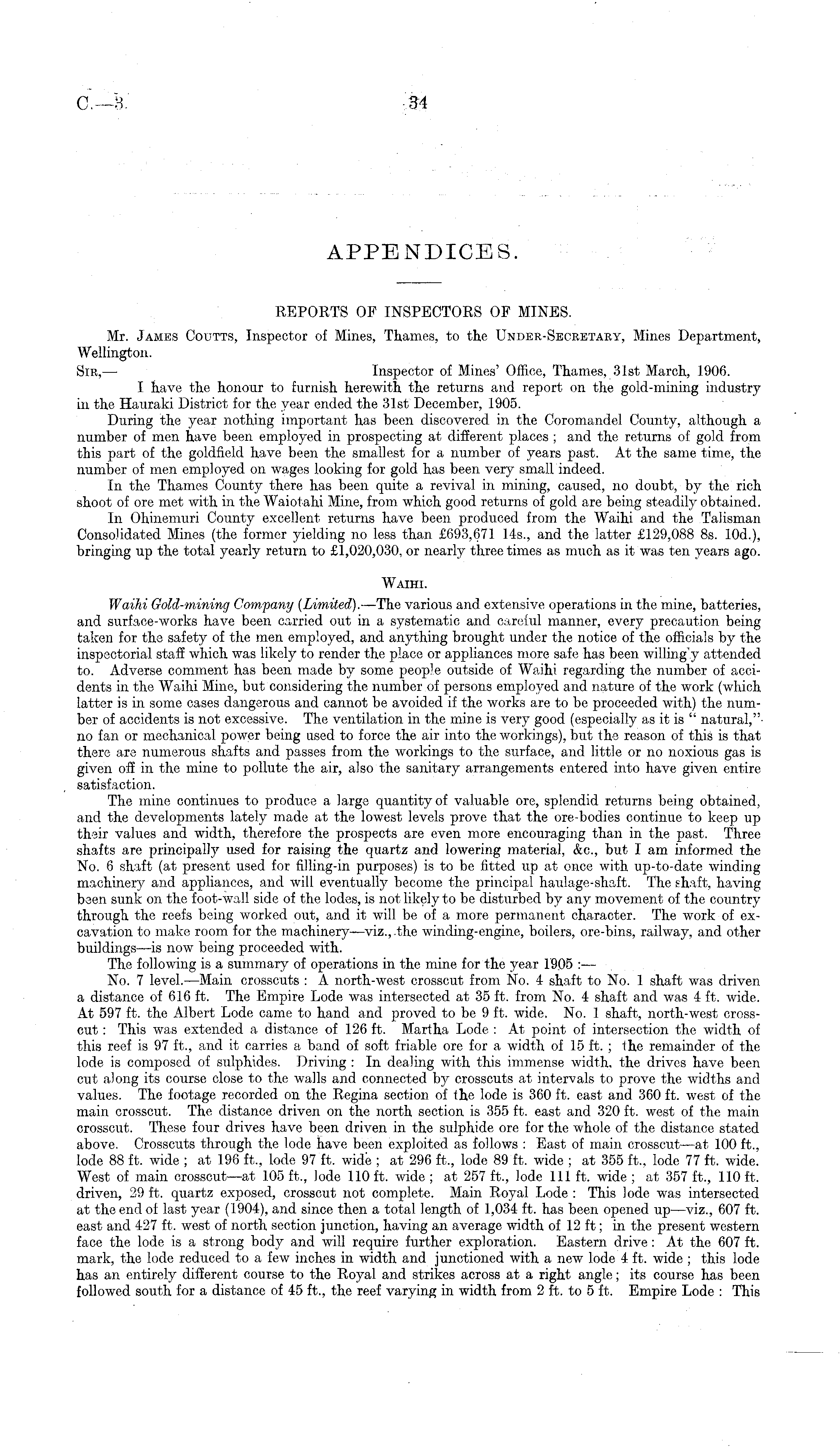 REPORTS OF INSPECTORS OF MINES. Mr. James Coutts, Inspector of Mines, Thames, to the Under-Secretary, Mines Department, Wellington. Sir,— Inspector of Mines' Office, Thames, 31st March, 1906. I have the honour to furnish herewith the returns and report on the gold-mining industry in the Hauraki District for the year ended the 31st December, 1905. During the year nothing important has been discovered, in the Coromandel County, although a number of men have been employed in prospecting at different places ; and the returns of gold from this part of the goldfield have been the smallest for a number of years past. At the same time, the number of men employed on wages looking for gold has been very small indeed. In the Thames County there has been quite a revival in mining, caused, no doubt, by the rich shoot of ore met with in the Waiotahi Mine, from which good returns of gold are being steadily obtained. In Ohinemuri County excellent returns have been produced from the Waihi and the Talisman Consolidated Mines (the former yielding no less than £693,671 145., and the latter £129,088 Bs. 10d.), bringing up the total yearly return to £1,020,030, or nearly three times as much as it was ten years ago. Waihi. Waihi Gold-mining Company (Limited). —The various and extensive operations in the mine, batteries, and surface-works have been carried out in a systematic and careful manner, every precaution being taken for the safety of the men employed, and anything brought under the notice of the officials by the inspectorial staff which was likely to render the place or appliances more safe has been willing\y attended to. Adverse comment has been made by some people outside of Waihi regarding the number of accidents in the Waihi Mine, but considering the number of persons employed and nature of the work (which latter is in some cases dangerous and cannot be avoided if the works are to be proceeded with) the number of accidents is not excessive. The ventilation in the mine is very good (especially as it is " natural,"no fan or mechanical power being used to force the air into the workings), but the reason of this is that there are numerous shafts and passes from the workings to the surface, and little or no noxious gas is given off in the mine to pollute the air, also the sanitary arrangements entered into have given entire satisfaction. The mine continues to produce a large quantity of valuable ore, splendid returns being obtained, and the developments lately made at the lowest levels prove that the ore-bodies continue to keep up their values and width, therefore the prospects are even more encouraging than in the past. Three shafts are principally used for raising the quartz and lowering material, &c, but I am informed the No. 6 shaft (at present used for filling-in purposes) is to be fitted up at once with up-to-date winding machinery and appliances, and will eventually become the principal haulage-shaft. The shaft, having been sunk on the foot-wall side of the lodes, is not likely to be disturbed by any movement of the countrythrough the reefs being worked out, and it will be of a more permanent character. The work of excavation to make room for the machinery—viz., the winding-engine, boilers, ore-bins, railway, and other buildings —is now being proceeded with. The following is a summary of operations in the mine for the year 1905 : — No. 7 level. —Main crosscuts : A north-west crosscut from No. 4 shaft to No. 1 shaft was driven a distance of 616 ft. The Empire Lode was intersected at 35 ft. from No. 4 shaft and was 4 ft. wide. At 597 ft. the Albert Lode came to hand and proved to be 9 ft. wide. No. 1 shaft, north-west crosscut : This was extended a distance of 126 ft. Martha Lode :At point of intersection the width of this reef is 97 ft., and it carries a band of soft friable ore for a width of 15 ft. ; the remainder of the lode is composed of sulphides. Driving : In dealing with this immense width, the drives have been cut along its course close to the walls and connected by crosscuts at intervals to prove the widths and values. The footage recorded on the Regina section of the lode is 360 ft. east and 360 ft. west of the main crosscut. The distance driven on the north section is 355 ft. east and 320 ft. west of the main crosscut. These four drives have been driven in the sulphide ore for the whole of the distance stated above. Crosscuts through the lode have been exploited as follows : East of main crosscut —at 100 ft., lode 88 ft. wide ; at 196 ft., lode 97 ft. wide ; at 296 ft., lode 89 ft. wide ; at 355 ft., lode 77 ft. wide. West of main crosscut—at 105 ft., lode 110 ft. wide ;at 257 ft., lode 111 ft. wide ;at 357 ft., 110 ft. driven, 29 ft. quartz exposed, crosscut not complete. Main Royal Lode : This lode was intersected at the end of last year (1904), and since then a total length of 1,034 ft. has been opened up—viz., 607 ft. east and 427 ft. west of north section junction, having an average width of 12 ft; in the present western face the lode is a strong body and will require further exploration. Eastern drive :At the 607 ft. mark, the lode reduced to a few inches in width and junctioned with a new lode 4 ft. wide ; this lode has an entirely different course to the Eoyal and strikes across at a right angle; its course has been followed south for a distance of 45 ft., the reef varying in width from 2 ft. to 5 ft. Empire Lode : This