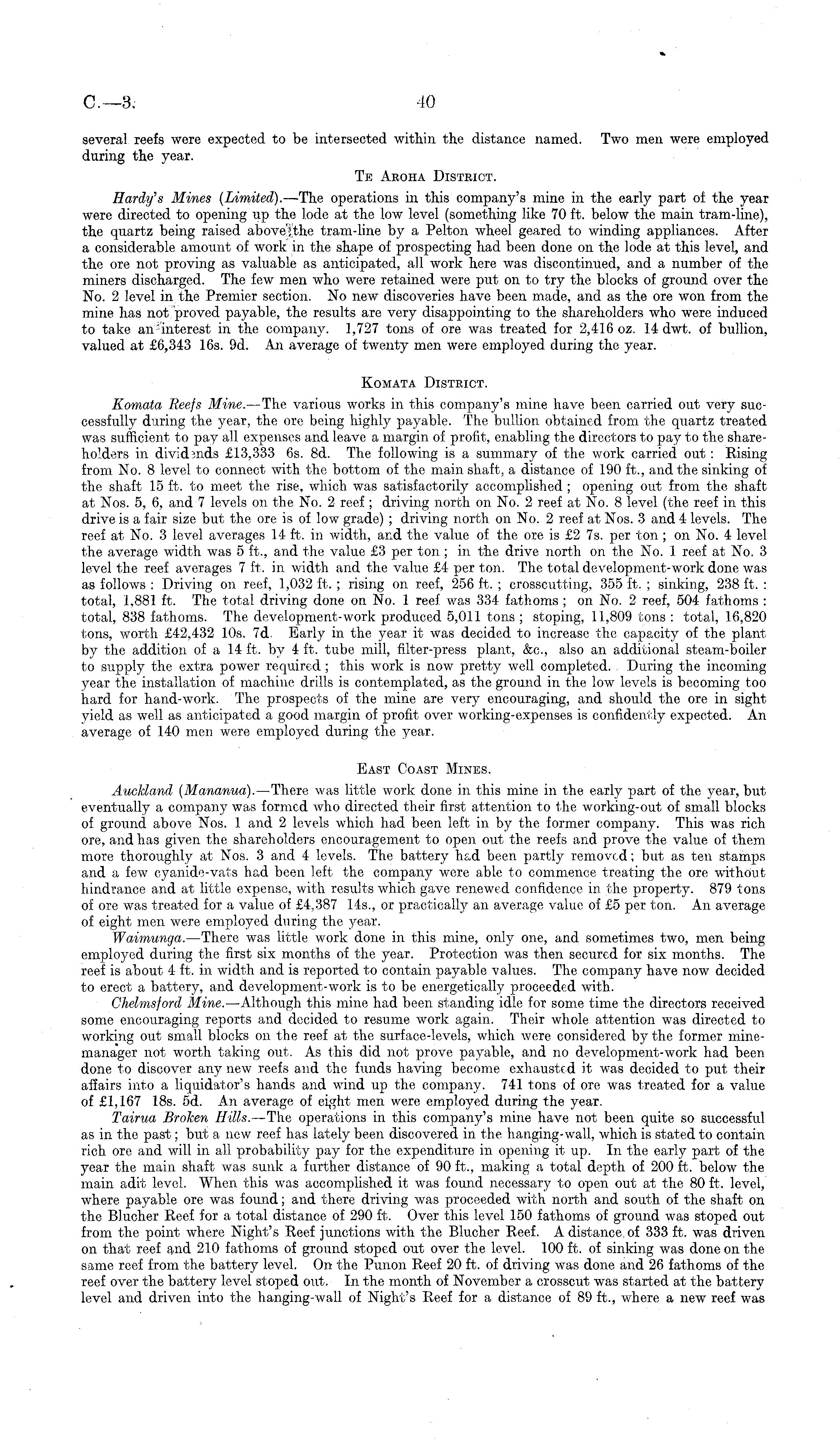 several reefs were expected to be intersected within the distance named. Two men were employed during the year. Te Aroha District. Hardy's Mines (Limited). —The operations in this company's mine in the early part of the year were directed to opening up the lode at the low level (something like 70 ft. below the main tram-line), the quartz being raised above'j'the tram-line by a Pelton wheel geared to winding appliances. After a considerable amount of work in the shape of prospecting had been done on the lode at this level, and the ore not proving as valuable as anticipated, all work here was discontinued, and a number of the miners discharged. The few men who were retained were put on to try the blocks of ground over the No. 2 level in the Premier section. No new discoveries have been made, and as the ore won from the mine has not proved payable, the results are very disappointing to the shareholders who were induced to take an'interest in the company. 1,727 tons of ore was treated for 2,416 oz. 14 dwt. of bullion, valued at £6,343 16s. 9d. An average of twenty men were employed during the year. Komata District. Komata Reefs Mine. —The various works in this company's mine have been carried out very successfully during the year, the ore being highly payable. The bullion obtained from the quartz treated was sufficient to pay all expenses and leave a margin of profit, enabling the directors to pay to the shareholders in dividends £13,333 6s. Bd. The following is a summary of the work carried out : Rising from No. 8 level to connect with the bottom of the main shaft, a distance of 190 ft, and the sinking of the shaft 15 ft. to meet the rise, which was satisfactorily accomplished ; opening out from the shaft at Nos. 5, 6, and 7 levels on the No. 2 reef ; driving north on No. 2 reef at No. 8 level (the reef in this drive is a fair size but the ore is of low grade) ; driving north on No. 2 reef at Nos. 3 and 4 levels. The reef at No. 3 level averages 14 ft. in width, and the value of the ore is £2 7s. per ton ; on No. 4 level the average width was 5 ft, and the value £3 per ton; in the drive north on the No. 1 reef at No. 3 level the reef averages 7 ft. in width and the value £4 per ton. The total development-work done was as follows : Driving on reef, 1,032 ft. ; rising on reef, 256 ft. ; crosscutting, 355 ft. ; sinking, 238 ft. : total, 1,881 ft. The total driving done on No. 1 reef was 334 fathoms ; on No. 2 reef, 504 fathoms : total, 838 fathoms. The development-work produced 5,011 tons ; stoping, 11,809 tons : total, 16,820 tons, worth £42,432 10s. 7d. Early in the year it was decided to increase the capacity of the plant by the addition of a 14 ft. by 4 ft. tube mill, filter-press plant, &c, also an additional steam-boiler to supply the extra power required ; this work is now pretty well completed. During the incoming year the installation of machine drills is contemplated, as the ground in the low levels is becoming too hard for hand-work. The prospects of the mine are very encouraging, and should the ore in sight yield as well as anticipated a good margin of profit over working-expenses is confidently expected. An average of 140 men were employed during the year. East Coast Mines. Auckland (Mananua). —There was little work done in this mine in the early part of the year, but eventually a company was formed who directed their first attention to the working-out of small blocks of ground above Nos. 1 and 2 levels which had been left in by the former company. This was rich ore, and has given the shareholders encouragement to open out the reefs and prove the value of them more thoroughly at Nos. 3 and 4 levels. The battery had been partly removed; but as ten stamps and a few cyanide-vats had been left the company were able to commence treating the ore without hindrance and at little expense, with results which gave renewed confidence in the property. 879 tons of ore was treated for a value of £4,387 14s, or practically an average value of £5 per ton. An average of eight men were employed during the year. Waimunga. —There was little work done in this mine, only one, and sometimes two, men being employed during the first six months of the year. Protection was then secured for six months. The reef is about 4 ft. in width and is reported to contain payable values. The company have now decided to erect a battery, and development-work is to be energetically proceeded with. Chelmsford Mine. —Although this mine had been standing idle for some time the directors received some encouraging reports and decided to resume work again. Their whole attention was directed to working out small blocks on the reef at the surface-levels, which were considered by the former minemanager not worth taking out. As this did not prove payable, and no development-work had been done to discover any new reefs and the funds having become exhausted it was decided to put their affairs into a liquidator's hands and wind up the company. 741 tons of ore was treated for a value of £1,167 18s. sd. An average of eight men were employed during the year. Tairua Broken Hills. —The operations in this company's mine have not been quite so successful as in the past; but a new reef has lately been discovered in the hanging-wall, which is stated to contain rich ore and will in all probability pay for the expenditure in opening it up. In the early part of the year the main shaft was sunk a further distance of 90 ft, making a total depth of 200 ft. below the main adit level. When this was accomplished it was found necessary to open out at the 80 ft. level, where payable ore was found; and there driving was proceeded with north and south of the shaft on the Blucher Reef for a total distance of 290 ft. Over this level 150 fathoms of ground was stoped out from the point where Night's Reef junctions with the Blucher Reef. A distance, of 333 ft. was driven on that reef and 210 fathoms of ground stoped out over the level. 100 f