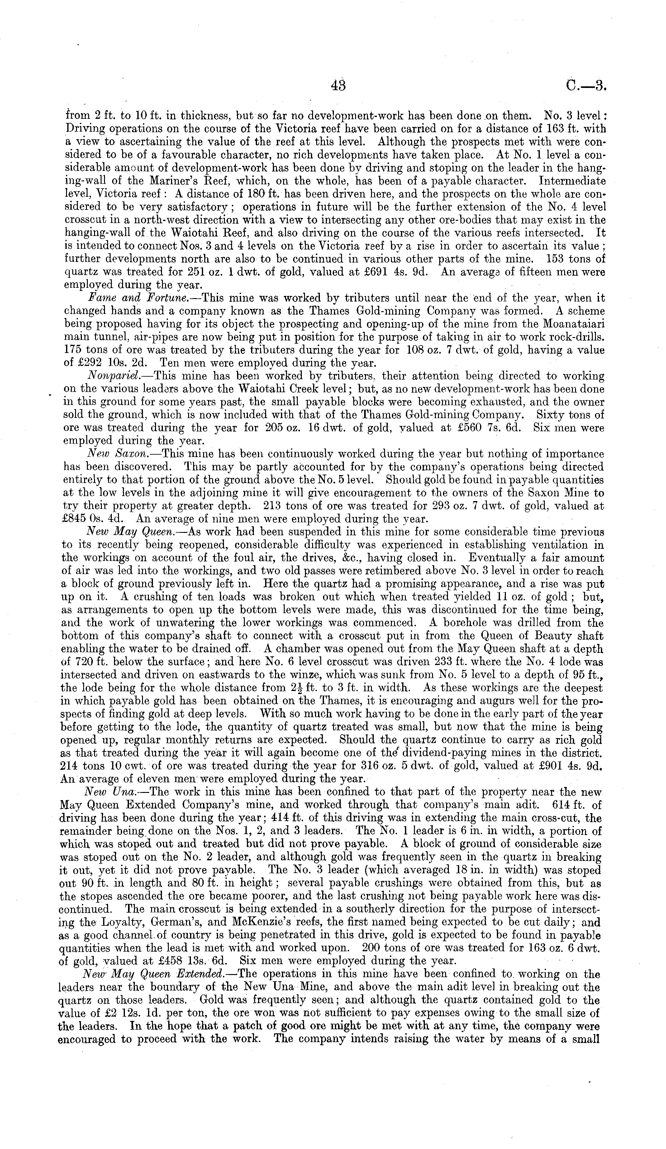 from 2 ft. to 10 ft. in thickness, but so far no development-work has been done on them. No. 3 level: Driving operations on the course of the Victoria reef have been carried on for a distance of 163 ft. with a view to ascertaining the value of the reef at this level. Although the prospects met with were considered to be of a favourable character, no rich developments have taken place. At No. 1 level a considerable amount of development-work has been done by driving and stoping on the leader in the hang-ing-wall of the Mariner's Reef, which, on the whole, has been of a payable character. Intermediate level, Victoria reef : A distance of 180 ft. has been driven here, and the prospects on the whole are considered to be very satisfactory ; operations in future will be the further extension of the No. 4 level crosscut in a north-west direction with a view to intersecting any other ore-bodies that may exist in the hanging-wall of the Waiotahi Reef, and also driving on the course of the various reefs intersected. It is intended to connect Nor. 3 and 4 levels on the Victoria reef by a rise in order to ascertain its value ; further developments north are also to be continued in various other parts of the mine. 153 tons of quartz was treated for 251 oz. 1 dwt. of gold, valued at £691 4s. 9d. An average of fifteen men were employed during the year. Fame and Fortune. —This mine was worked by tributers until near the end of the year, when it changed hands and a company known as the Thames Gold-mining Company was formed. A scheme being proposed having for its object the prospecting and opening-up of the mine from the Moanataiari main tunnel, air-pipes are now being put in position for the purpose of taking in air to work rock-drills. 175 tons of ore was treated by the tributers during the year for 108 oz. 7 dwt. of gold, having a value of £292 10s. 2d. Ten men were employed during the year. Nowparid. —This mine has been worked by tributers, their attention being directed to working on the various leaders above the Waiotahi Creek level; but, as no new development-work has been done in this ground for some years past, the small payable blocks were becoming exhausted, and the owner sold the ground, which is now included with that of the Thames Gold-mining Company. Sixty tons of ore was treated during the year for 205 oz. 16 dwt. of gold, valued at £560 7s. 6d. Six men were employed during the year. New Saxon. —This mine has been continuously worked during the year but nothing of importance has been discovered. This may be partly accounted for by the company's operations being directed entirely to that portion of the ground above the No. 5 level. Should gold be found in payable quantities at the low levels in the adjoining mine it will give encouragement to the owners of the Saxon Mine to try their property at greater depth. 213 tons of ore was treated for 293 oz. 7 dwt. of gold, valued at £845 os. 4d. An average of nine men were employed during the year. New May Queen. —As work had been suspended in this mine for some considerable time previous to its recently being reopened, considerable difficulty was experienced in establishing ventilation in the workings on account of the foul air, the drives, &c, having closed in. Eventually a fair amount of air was led into the workings, and two old passes were retimbered above No. 3 level in order to reach a block of ground previously left in. Here the quartz had a promising appearance, and a rise was put up on it. A crushing of ten loads was broken out which when treated yielded 11 oz. of gold ; but, as arrangements to open up the bottom levels were made, this was discontinued for the time being, and the work of unwatering the lower workings was commenced. A borehole was drilled from the bottom of this company's shaft to connect with a crosscut put in from the Queen of Beauty shaft enabling the water to be drained off. A chamber was opened out from the May Queen shaft at a depth of 720 ft. below the surface; and here No. 6 level crosscut was driven 233 ft. where the No. 4 lode was intersected and driven on eastwards to the winze, which was sunk from No. 5 level to a depth of 95 ft., the lode being for the whole distance from 2| ft. to 3 ft. in width. As these workings are the deepest in which payable gold has been obtained on the Thames, it is encouraging and augurs well for the prospects of rinding gold at deep levels. With so much work having to be done in the early part of the year before getting to the lode, the quantity of quartz treated was small, but now that the mine is being opened up, regular monthly returns are expected. Should the quartz continue to carry as rich gold as that treated during the year it will again become one of the dividend-paying mines in the district. 214 tons 10 cwt. of ore was treated during the year for 316 oz. 5 dwt. of gold, valued at £901 4s. 9d. An average of eleven men were employed during the year. New Una. —The work in this mine has been confined to that part of the property near the new May Queen Extended Company's mine, and worked through that company's main adit. 614 ft. of driving has been done during the year; 414 ft. of this driving was in extending the main cross-cut, the remainder being done on the Nos. 1, 2, and 3 leaders. The No. 1 leader is 6 in. in width, a portion of which was stoped out and treated but did not prove payable. A block of ground of considerable size was stoped out on the No. 2 leader, and although gold was frequently seen in the quartz in breaking it out, yet it did not prove payable. The No. 3 leader (which averaged 18 in. in width) was stoped out 90 ft. in length and 80 ft. in height; several payable crushings were obtained from this, but as the stopes ascended the ore became poorer, and the last crushing not being payable work here was discontinued. The main crosscut is being extended in a southerly direction for the purpose of intersecting the Loyalty, German's, and McKenzie's 