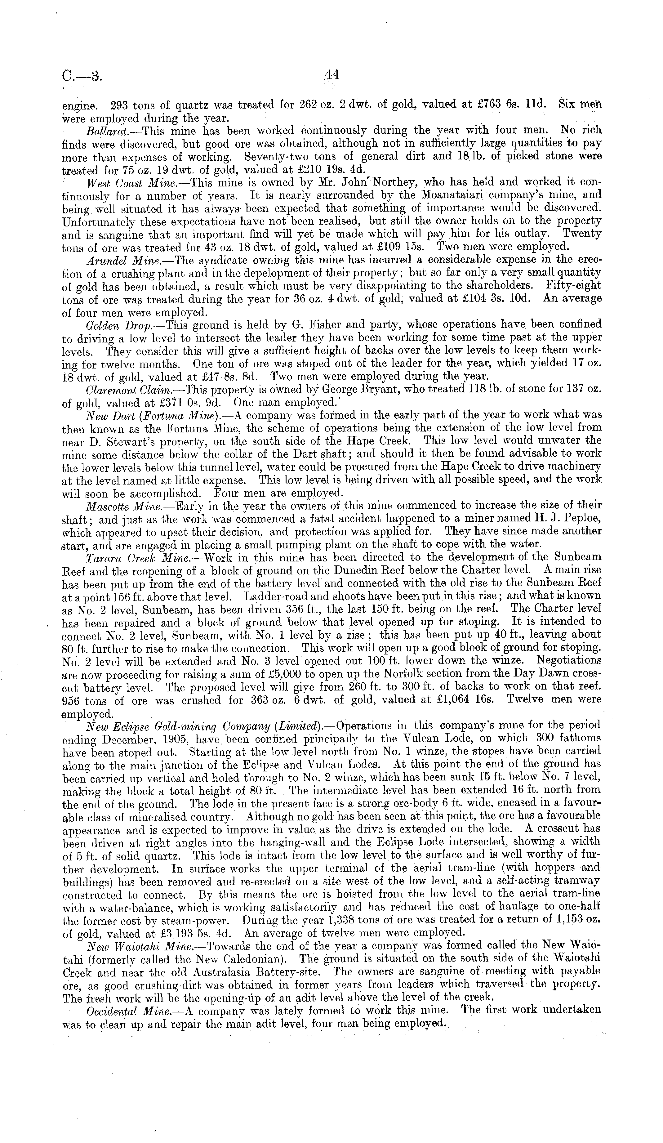 engine. 293 tons of quartz was treated for 262 oz. 2 dwt. of gold, valued at £763 6s. lid. Six men were employed during the year. Ballarat. —This mine has been worked continuously during the year with four men. No rich finds were discovered, but good ore was obtained, although not in sufficiently large quantities to pay more than expenses of working. Seventy-two tons of general dirt and 18 lb. of picked stone were treated for 75 oz. 19 dwt. of gold, valued at £210 19s. 4d. West Coast Mine. —This mine is owned by Mr. John'Northey, who has held and worked it continuously for a number of years. It is nearly surrounded by the Moanataiari company's mine, and being well situated it has always been expected that something of importance would be discovered. Unfortunately these expectations have not been realised, but still the owner holds on to the property and is sanguine that an important find will yet be made which will pay him for his outlay. Twenty tons of ore was treated for 43 oz. 18 dwt. of gold, valued at £109 15s. Two men were employed. Arundel Mine. —The syndicate owning this mine has incurred a considerable expense in the erection of a crushing plant and in the depelopment of their property; but so far only a very small quantity of gold has been obtained, a result which must be very disappointing to the shareholders. Fifty-eight tons of ore was treated during the year for 36 oz. 4 dwt. of gold, valued at £104 3s. 10d. An average of four men were employed. Golden Drop. —This ground is held by G. Fisher and party, whose operations have been confined to driving a low level to intersect the leader they have been working for some time past at the upper levels. They consider this will give a sufficient height of backs over the low levels to keep them working for twelve months. One ton of ore was stoped out of the leader for the year, which yielded 17 oz. 18 dwt. of gold, valued at £47 Bs. Bd. Two men were employed during the year. Claremont Claim. —This property is owned by George Bryant, who treated 118 lb. of stone for 137 oz. of gold, valued at £371 os. 9d. One man employed." New Dart (Fortuna Mine). —A company was formed in the early part of the year to work what was then known as the Fortuna Mine, the scheme of operations being the extension of the low level from near D. Stewart's property, on the south side of the Hape Creek. This low level would unwater the mine some distance below the collar of the Dart shaft; and should it then be found advisable to work the lower levels below this tunnel level, water could be procured from the Hape Creek to drive machinery at the level named at little expense. This low level is being driven with all possible speed, and the work will soon be accomplished. Four men are employed. Mascotte Mine. —Early in the year the owners of this mine commenced to increase the size of their shaft; and just as the work was commenced a fatal accident happened to a miner named H. J. Peploe, which appeared to upset their decision, and protection was applied for. They have since made another start, and are engaged in placing a small pumping plant on the shaft to cope with the water. Tararu Creek Mine. —Work in this mine has been directed to the development of the Sunbeam Reef and the reopening of a block of ground on the Dunedin Eeef below the Charter level. A main rise has been put up from the end of the battery level and connected with the old rise to the Sunbeam Reef at a point 156 ft. above that level. Ladder-road and shoots have been put in this rise; and what is known as No. 2 level, Sunbeam, has been driven 356 ft., the last 150 ft. being on the reef. The Charter level has been repaired and a block of ground below that level opened up for stoping. It is intended to connect No. 2 level, Sunbeam, with No. 1 level by a rise ; this has been put up 40 ft., leaving about 80 ft. further to rise to make the connection. This work will open up a good block of ground for stoping. No. 2 level will be extended and No. 3 level opened out 100 ft. lower down the winze. Negotiations are now proceeding for raising a sum of £5,000 to open up the Norfolk section from the Day Dawn crosscut battery level. The proposed level will give from 260 ft. to 300 ft. of backs to work on that reef. 956 tons of ore was crushed for 363 oz. 6 dwt. of gold, valued at £1,064 16s. Twelve men were employed. New Eclipse Gold-mining Company (Limited).— Operations in this company's mine for the period ending December, 1905, have been confined principally to the Vulcan Lode, on which 300 fathoms have been stoped out. Starting at the low level north from No. 1 winze, the stopes have been carried along to the main junction of the Eclipse and Vulcan Lodes. At this point the end of the ground has been carried up vertical and holed through to No. 2 winze, which has been sunk 15 ft. below No. 7 level, making the block a total height of 80 ft. . The intermediate level has been extended 16 ft. north from the end of the ground. The lode in the present face is a strong ore-body 6 ft. wide, encased in a favourable class of mineralised country. Although no gold has been seen at this point, the ore has a favourable appearance and is expected to improve in value as the drivs is extended on the lode. A crosscut has been driven at right angles into the hanging-wall and the Eclipse Lode intersected, showing a width of 5 ft. of solid quartz. This lode is intact from the low level to the surface and is well worthy of further development. In surface works the upper terminal of the aerial tram-line (with hoppers and buildings) has been removed and re-erected on a site west of the low level, and a self-acting tramway constructed to connect. By this means the ore is hoisted from the low level to the aerial tram-line with a water-balance, which is working satisfactorily and has reduced the cost of haulage to one-half the former cost by steam-power. During the year 1,338 tons of ore was treated for a ret